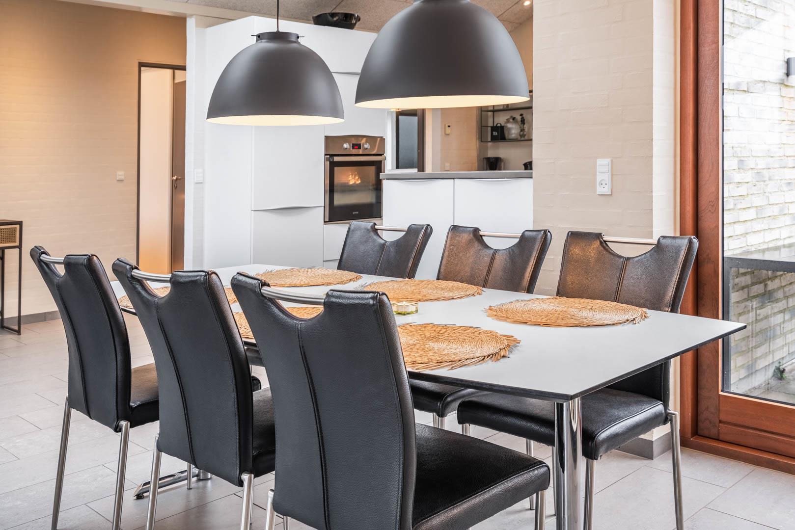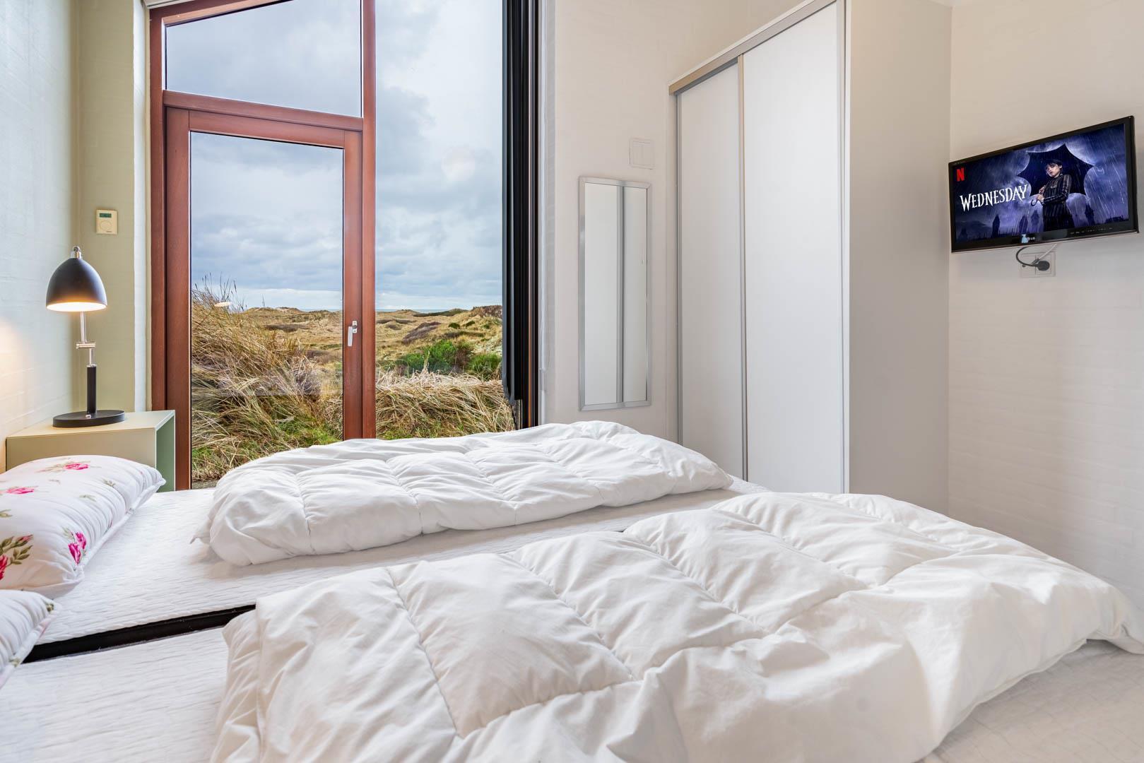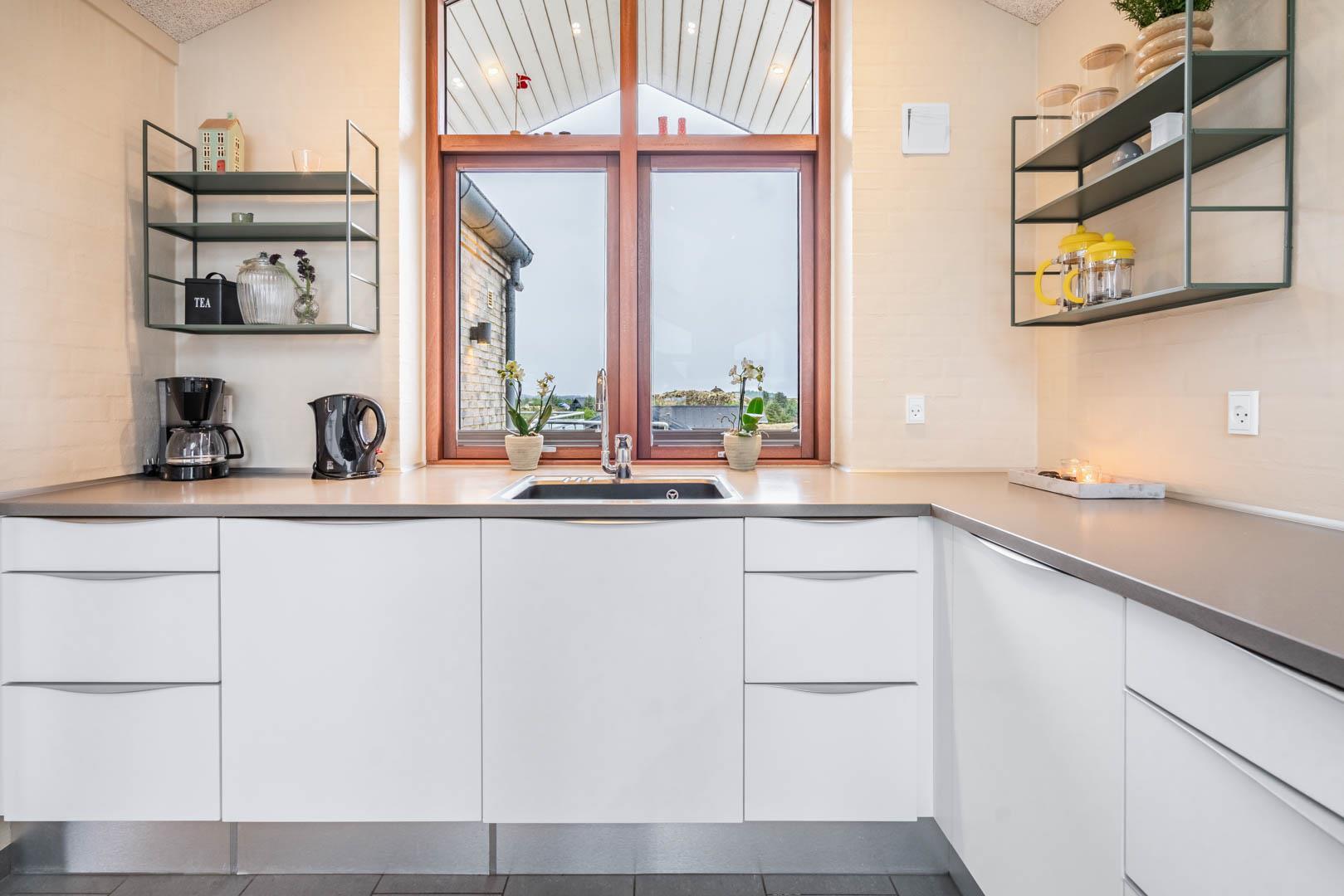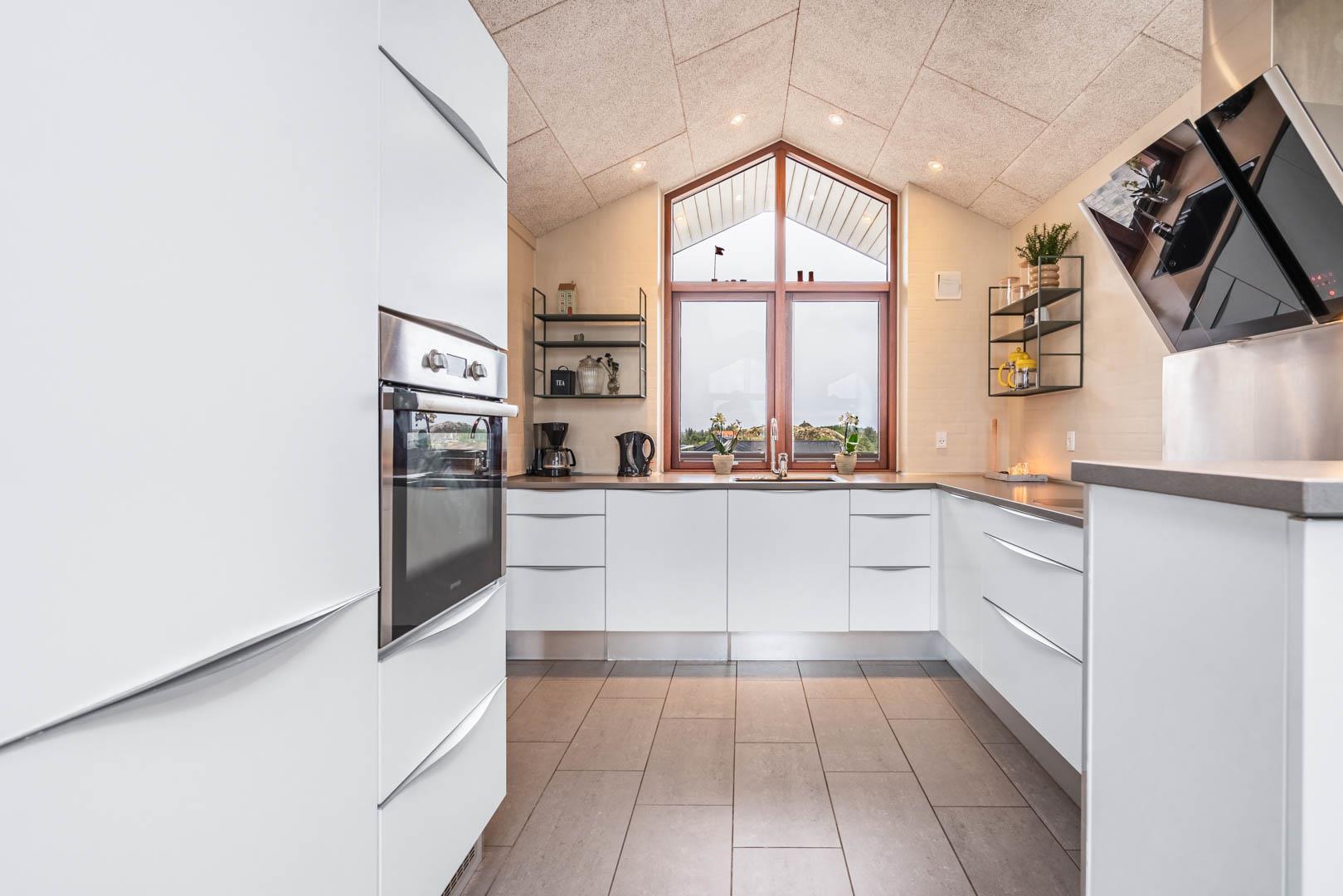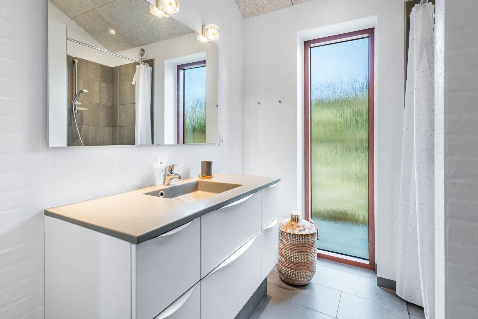 Stuen er en del af det åbne og højloftede opholdsrum, som er samlingspunktet for hyggelige stunder. Her kan I tilberede skønne feriemåltider i det lækre køkken eller spille brætspil i brændeovnens lune skær. Huset byder på seks sovepladser fordelt på tre rum med dobbeltsenge og to badeværelser, hvoraf det ene har en skøn sauna. Rundt langs sommerhusets vest-, syd- og østlige sider er der skønne terrasser, hvor I kan nyde en stille stund i solens stråler.