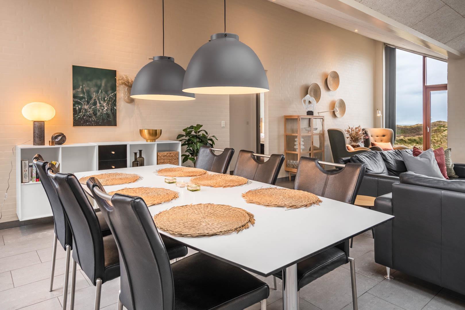I Henne Strand Syds smukke klitlandskab byder dette arkitekttegnede sommerhus med brændeovn og sauna velkommen til en uforglemmelig ferie. Se frem til at spise morgenmad med den smukkeste udsigt over de fredede, bølgende klitarealer med havet i baggrunden, og når kaffen er drukket, kan I krydse ned over den kuperede klitgrund og hoppe direkte i bølgen blå.