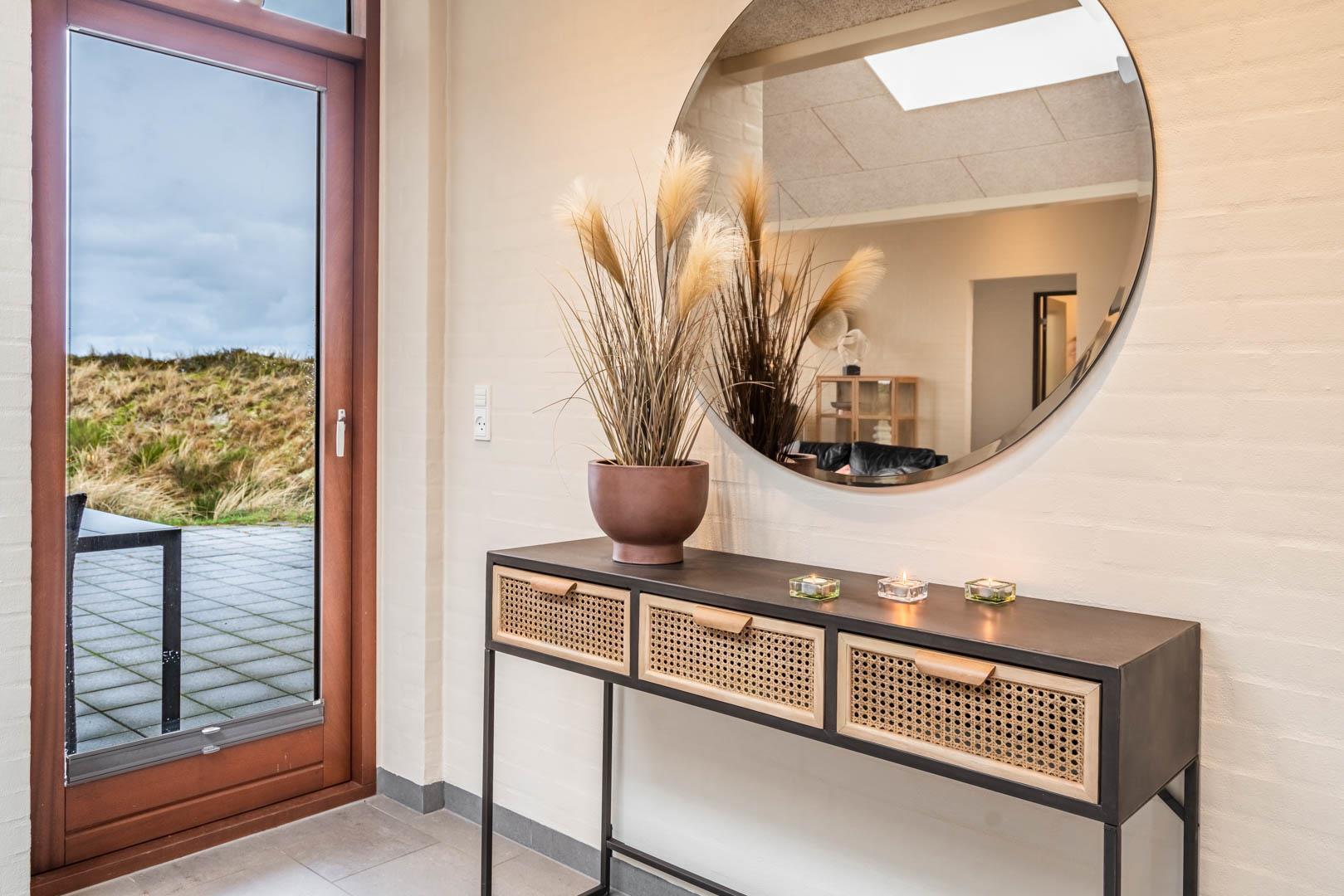 Sommerhuset er indrettet med fokus på lys og luft, hvilket man straks mærker, når man træder indenfor. Særligt stuens store skylight skaber en helt særlig stemning - både når solen skinner fra en skyfri himmel, og når regnen trommer på ruden. Indretningsstilen er minimalistisk med kvalitetsmøbler og moderne interiør i afdæmpede farver, der harmonerer perfekt med farverig, abstrakt kunst på væggene.