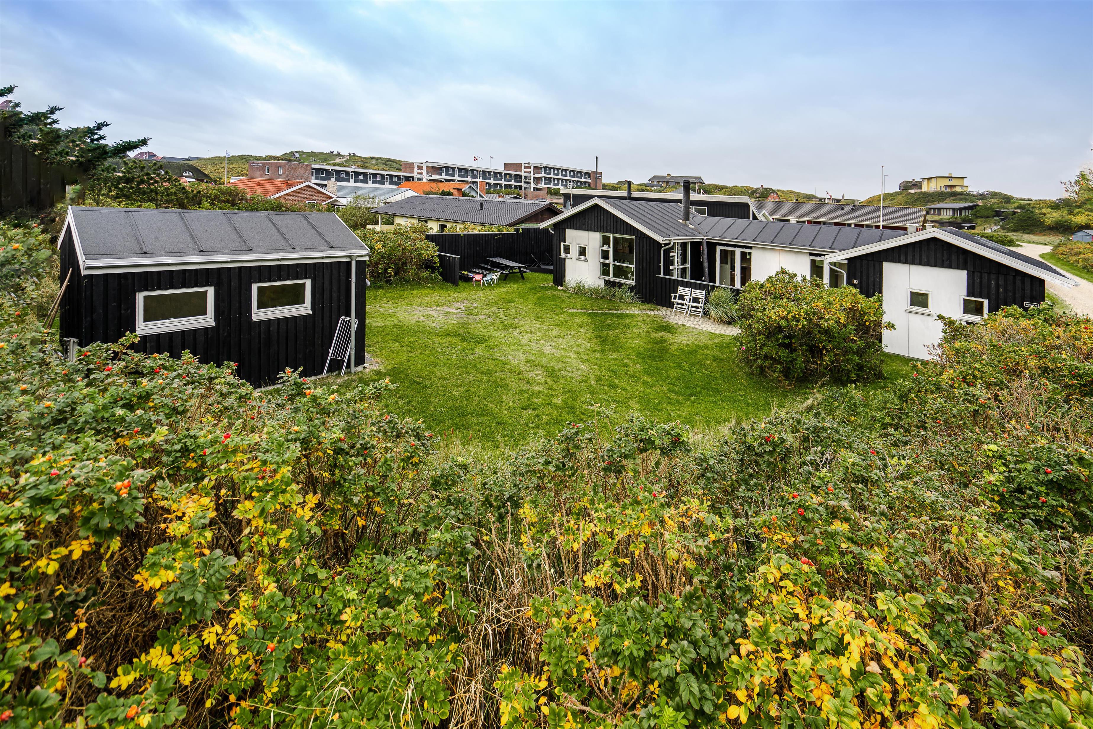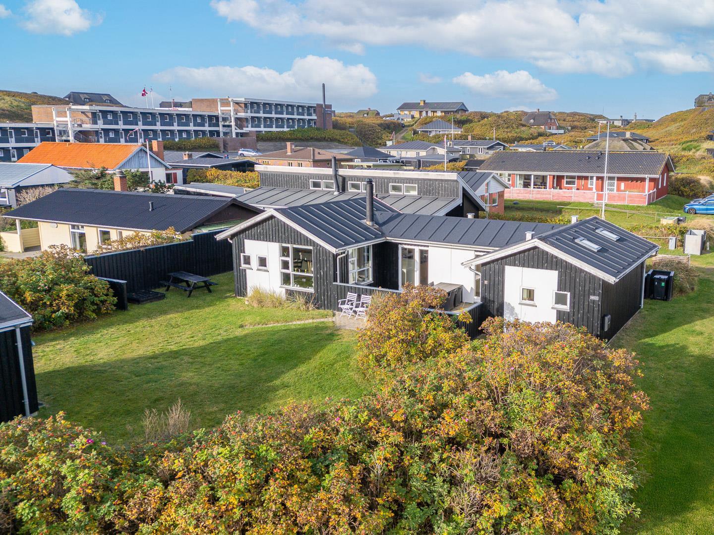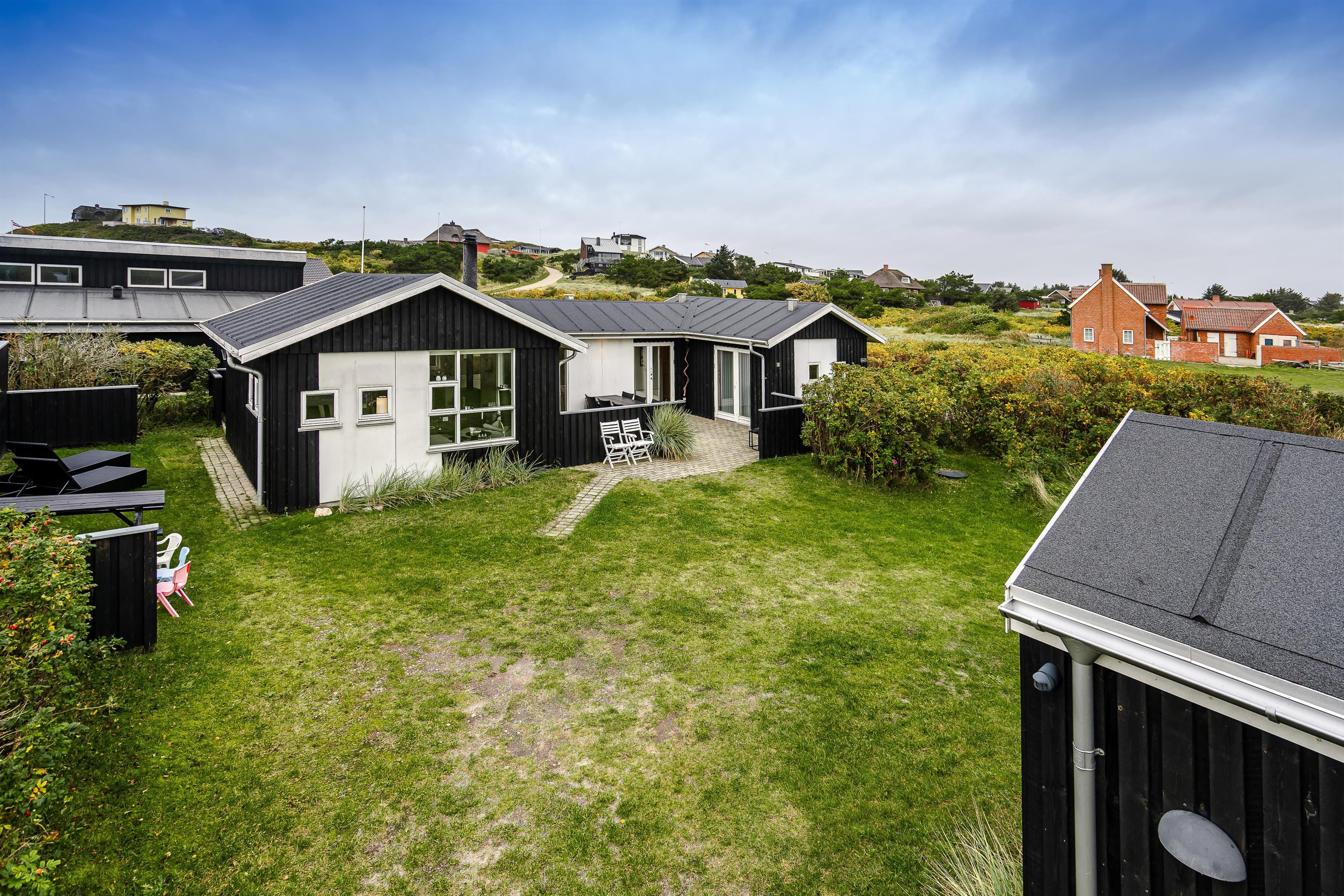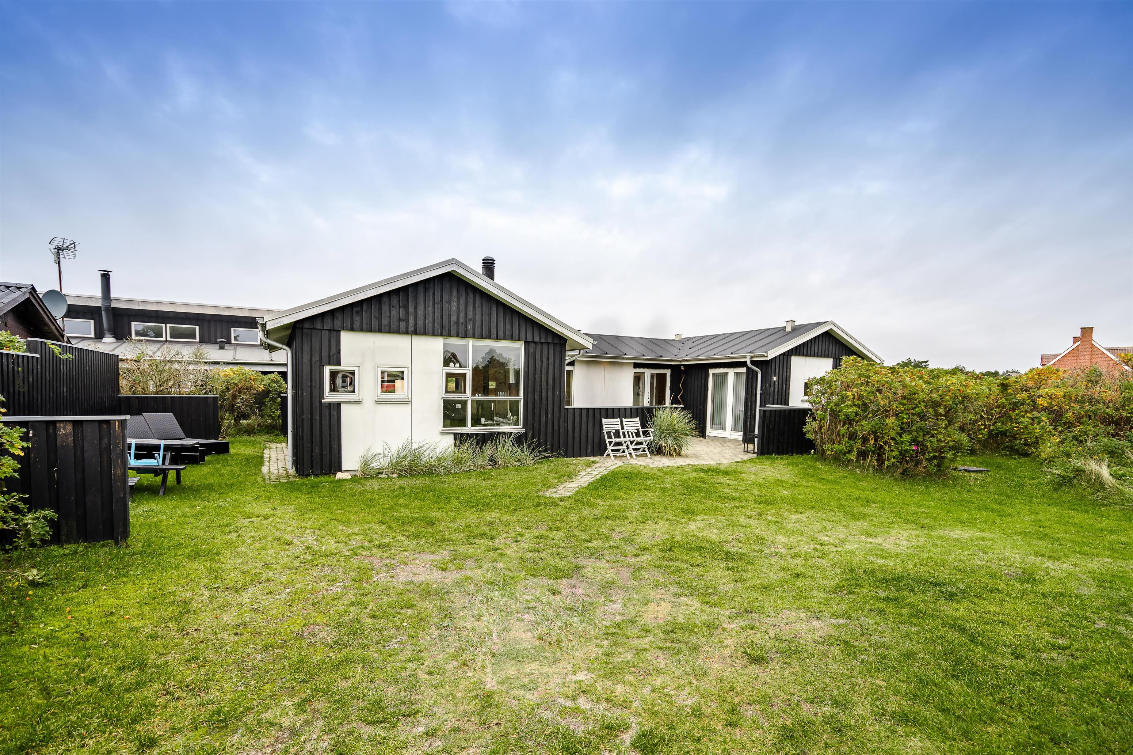 Beliggende på en dejlig naturgrund i gåafstand fra Henne Strands centrum, men alligevel på en ugenert naturgrund, ligger dette dejlige feriehus. Huset er smagfuld indrettet med gode møbler og store soverum med gode senge. Flot køkken og badeværelse. Fra stuen er der udgang til den ene af husets terrasser.