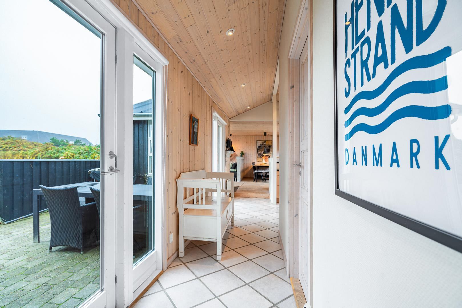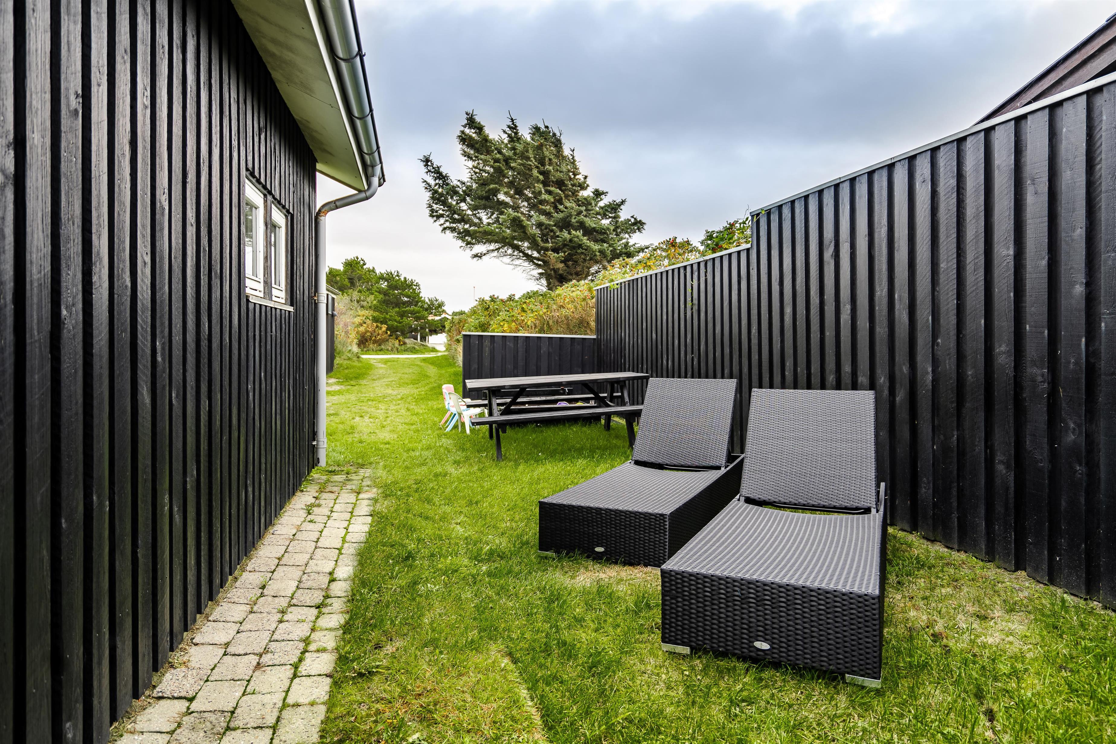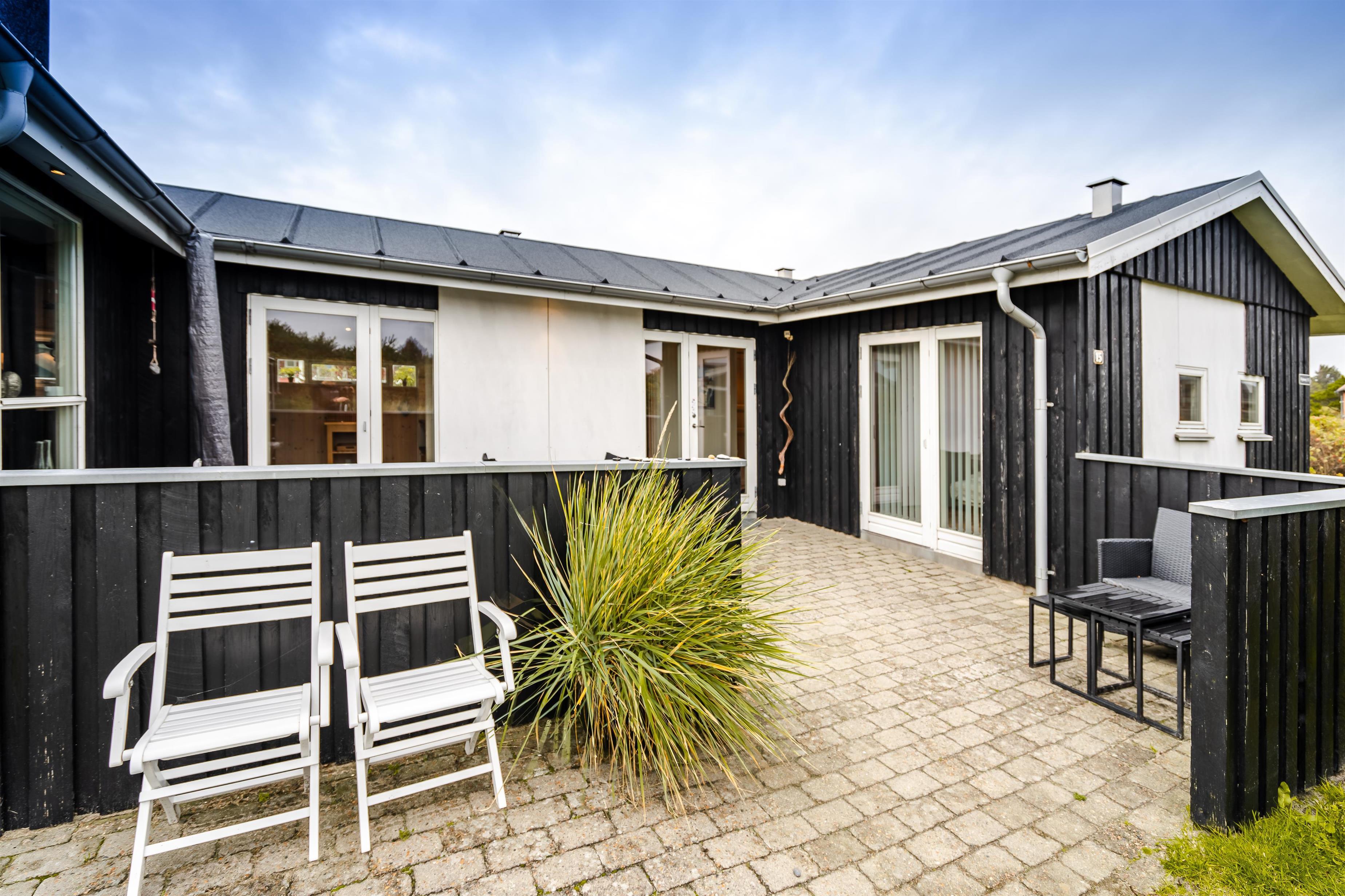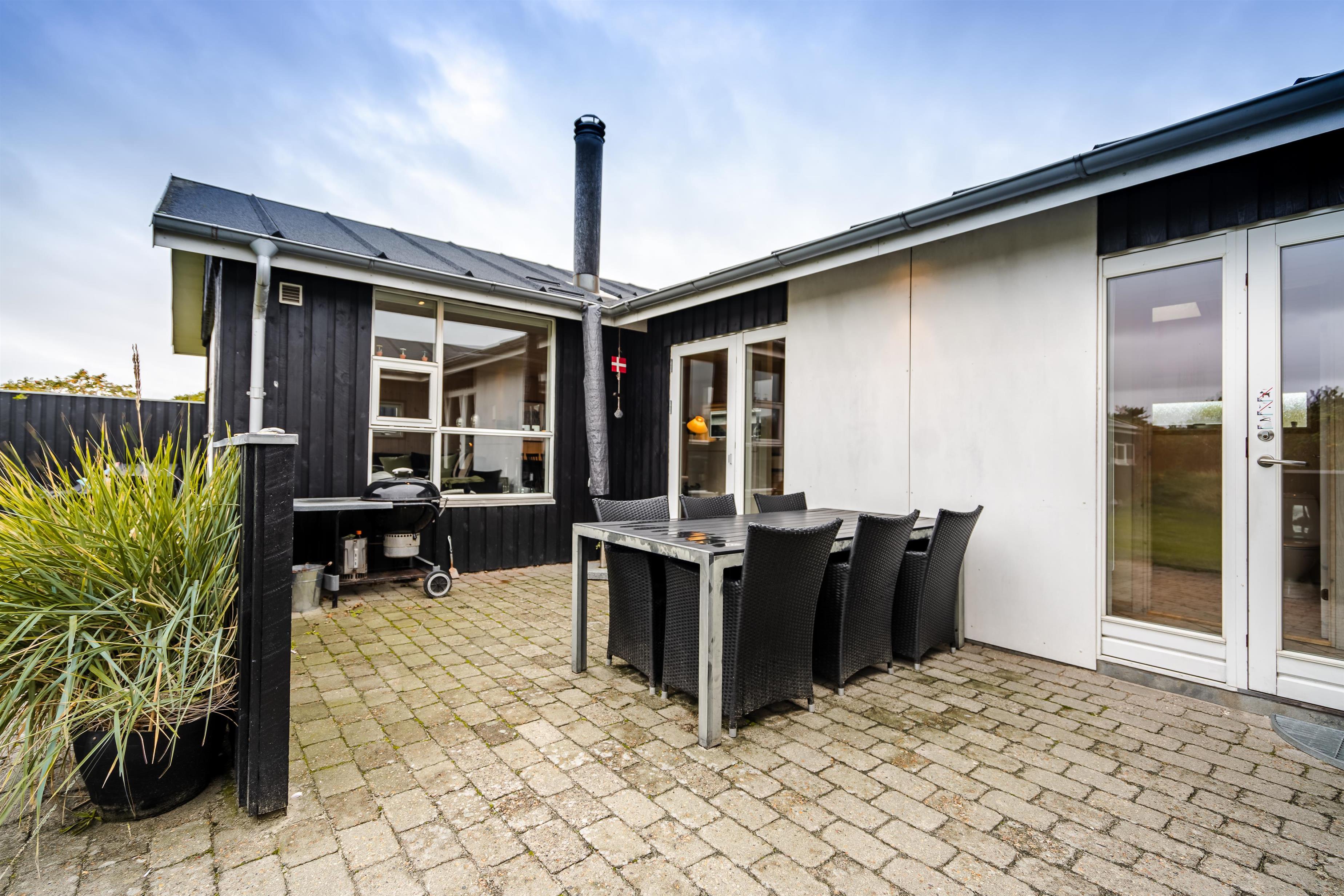 Beliggende på en dejlig naturgrund i gåafstand fra Henne Strands centrum, men alligevel på en ugenert naturgrund, ligger dette dejlige feriehus. Huset er smagfuld indrettet med gode møbler og store soverum med gode senge. Flot køkken og badeværelse. Fra stuen er der udgang til den ene af husets terrasser.