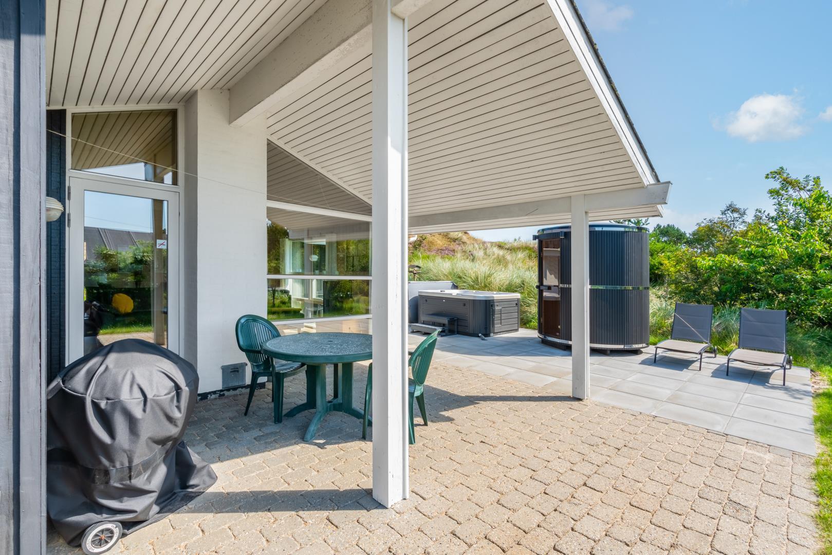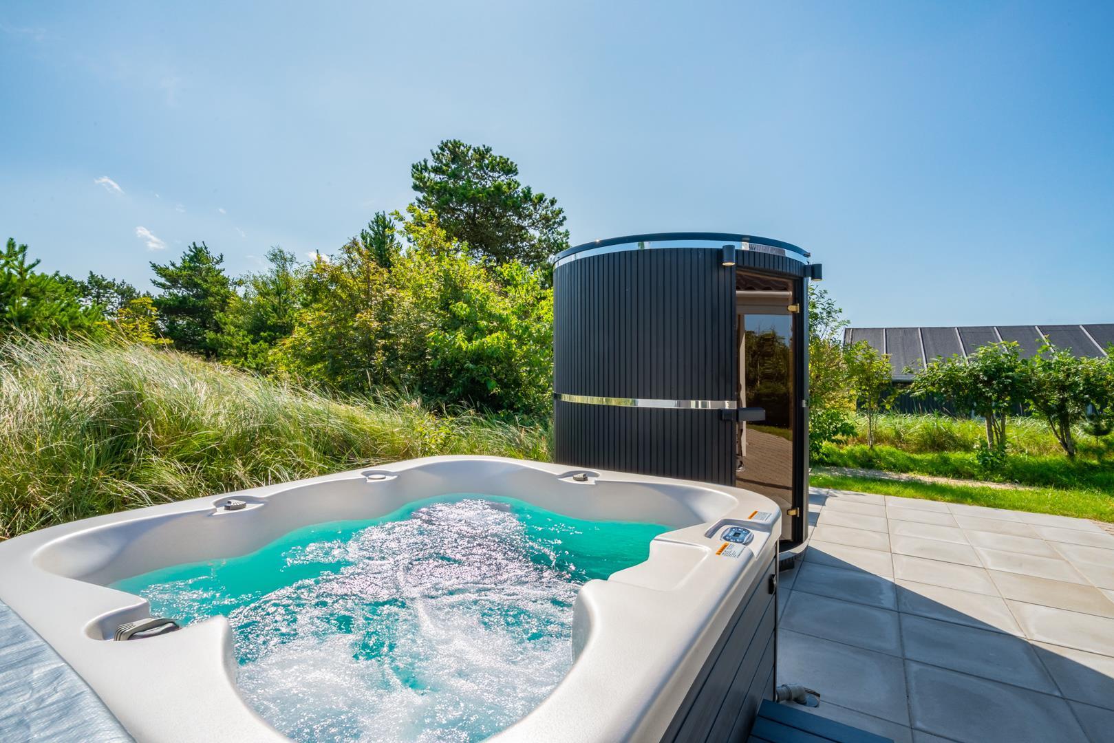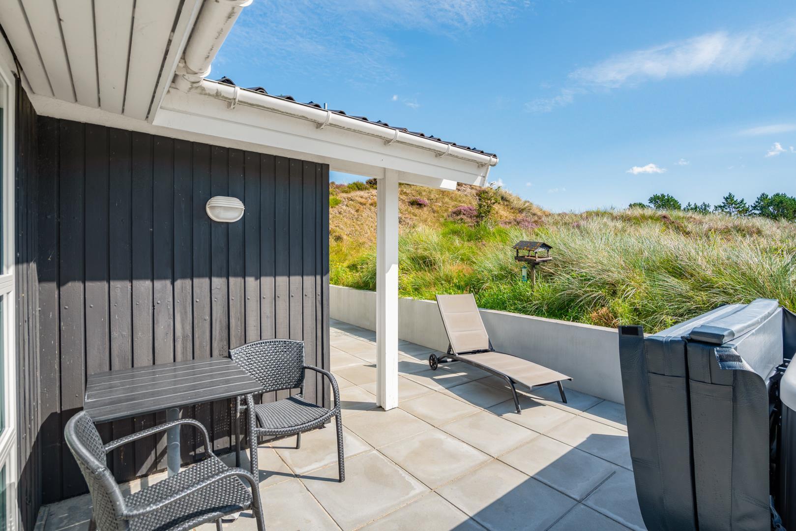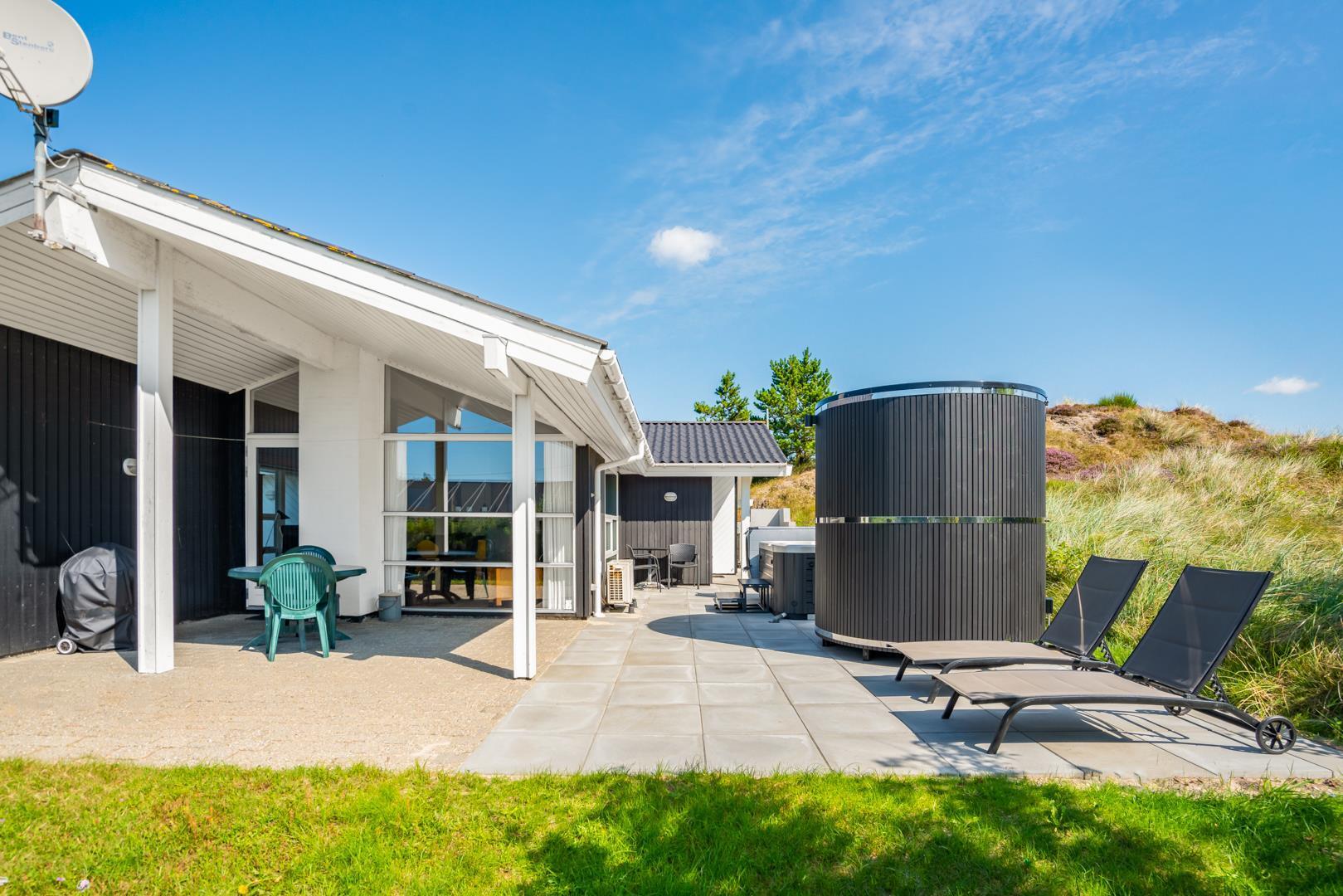 Udendørs findes flere solrige terrasser, hvor man kan finde sol og læ hele dagen – perfekte til morgenkaffe, middagsro og aftensmad under åben himmel. Her finder I også husets spa og sauna.