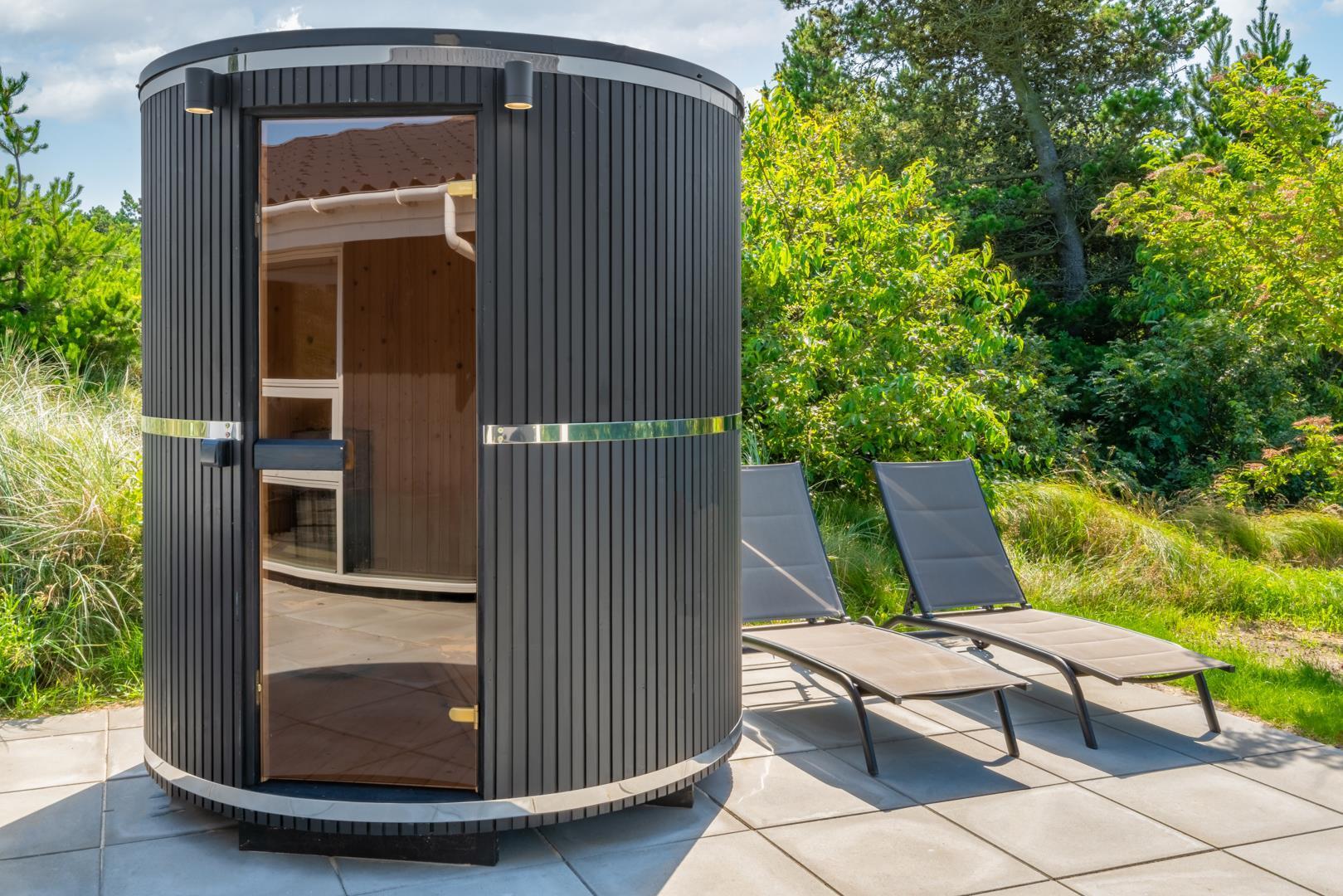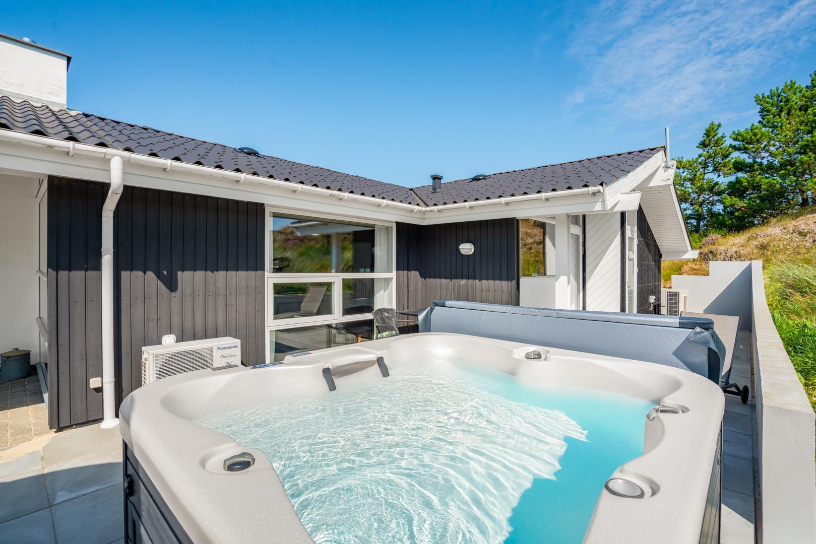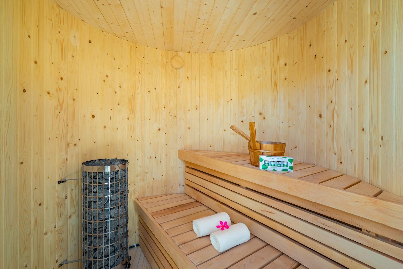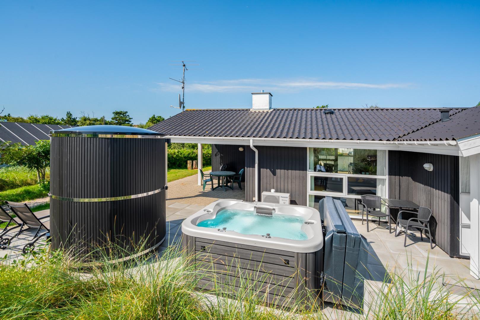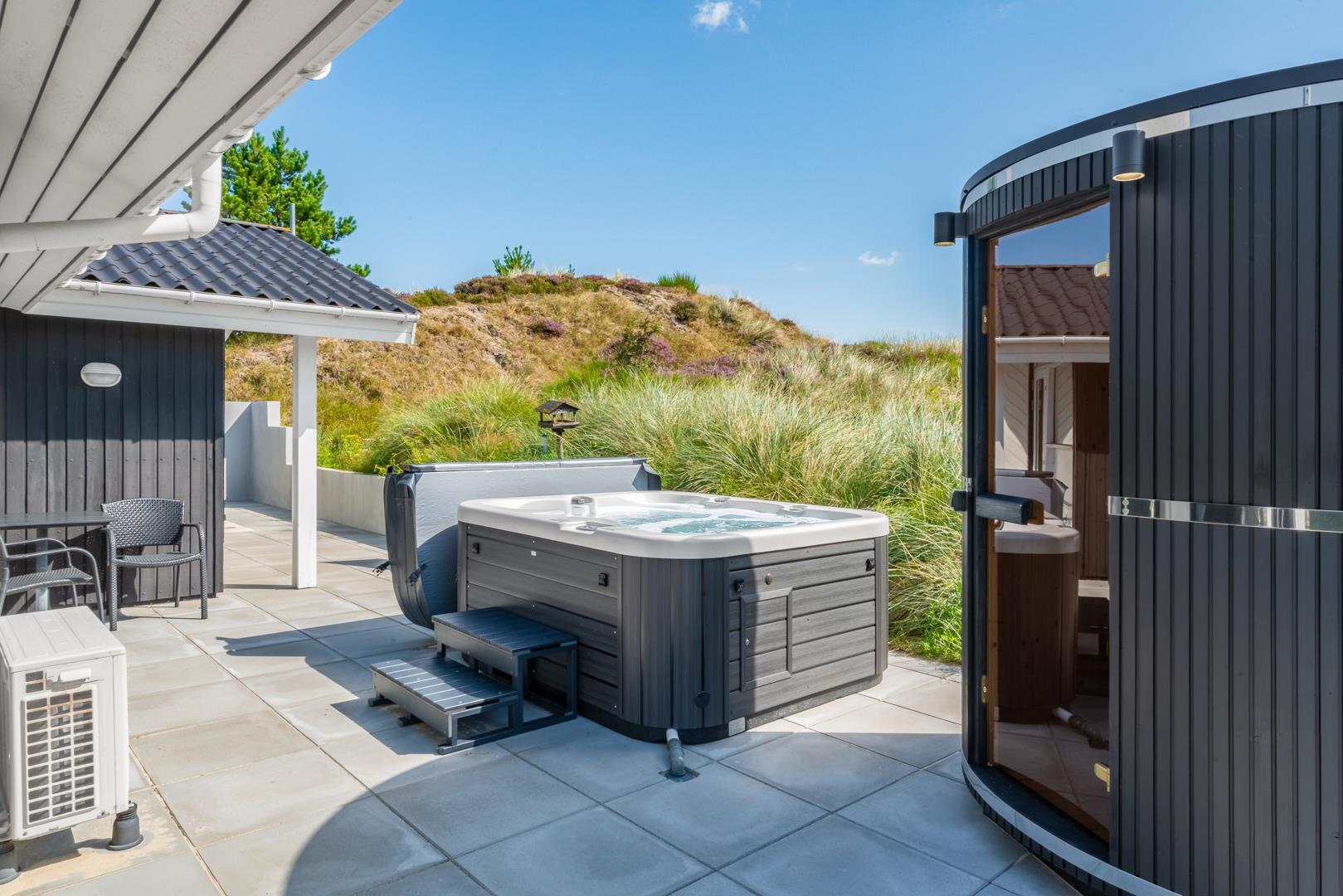 Udendørs findes flere solrige terrasser, hvor man kan finde sol og læ hele dagen – perfekte til morgenkaffe, middagsro og aftensmad under åben himmel. Her finder I også husets spa og sauna.