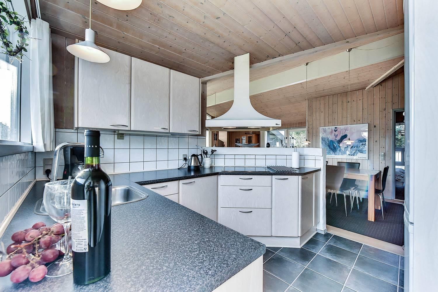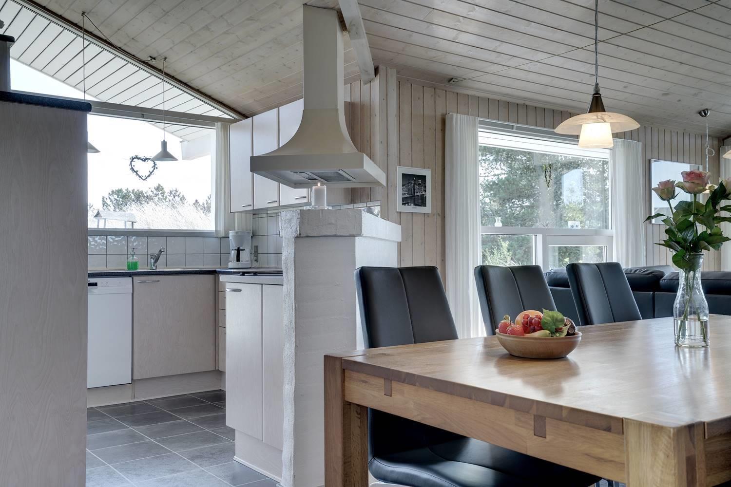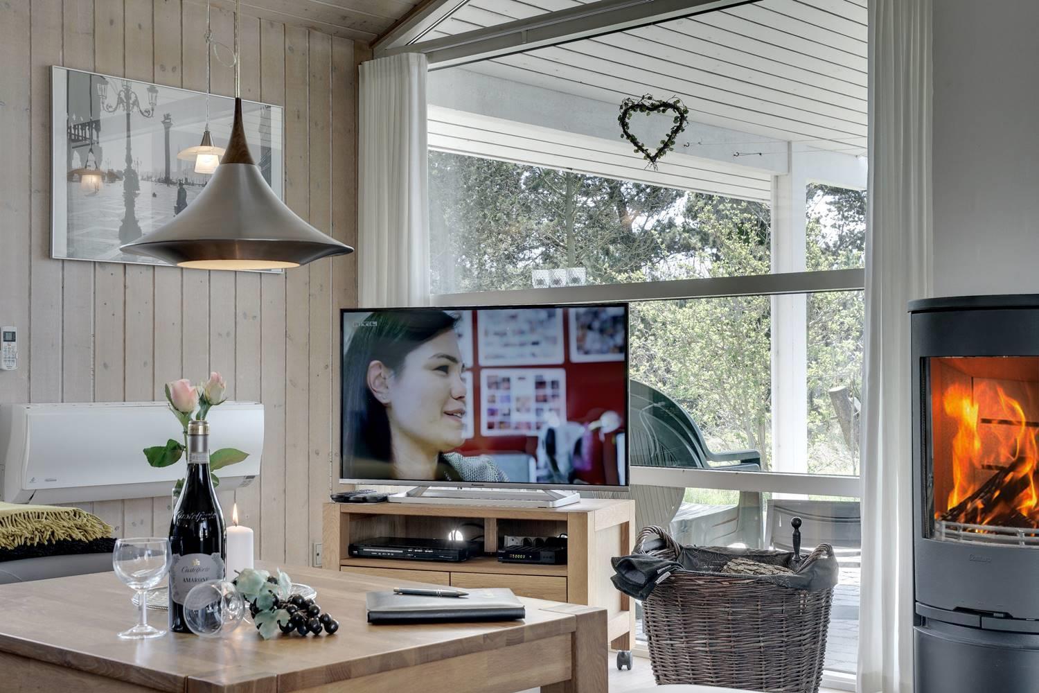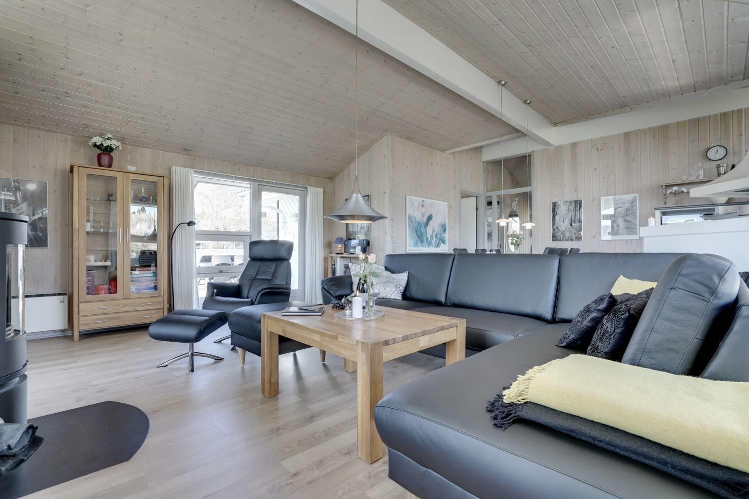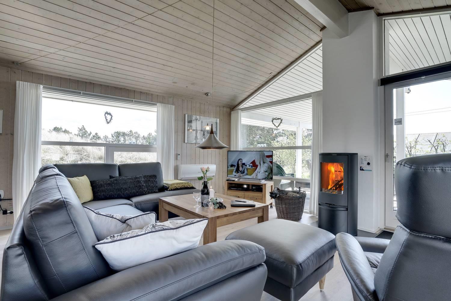 Huset er indrettet med et lyst og veludstyret køkken i åben forbindelse med en hyggelig stue, hvor brændeovn og varmepumpe sørger for komfort året rundt. Overalt er der loft til kip og store glaspartier, som inviterer lyset og naturen helt ind i opholdsrummene og skaber en behagelig og luftig atmosfære.