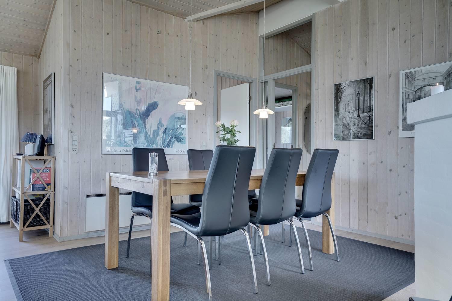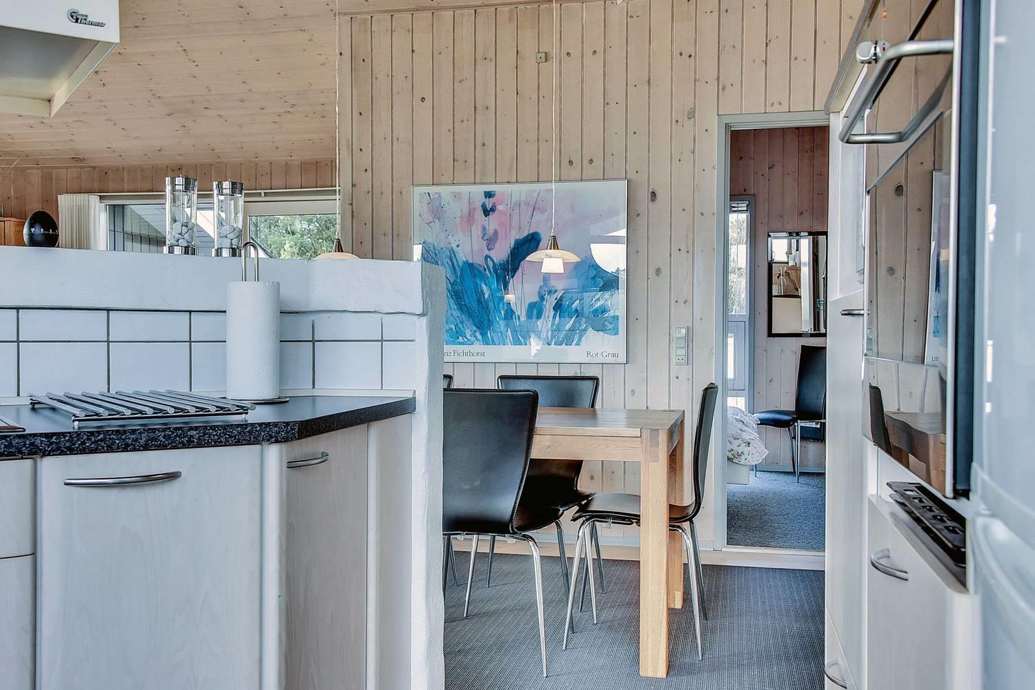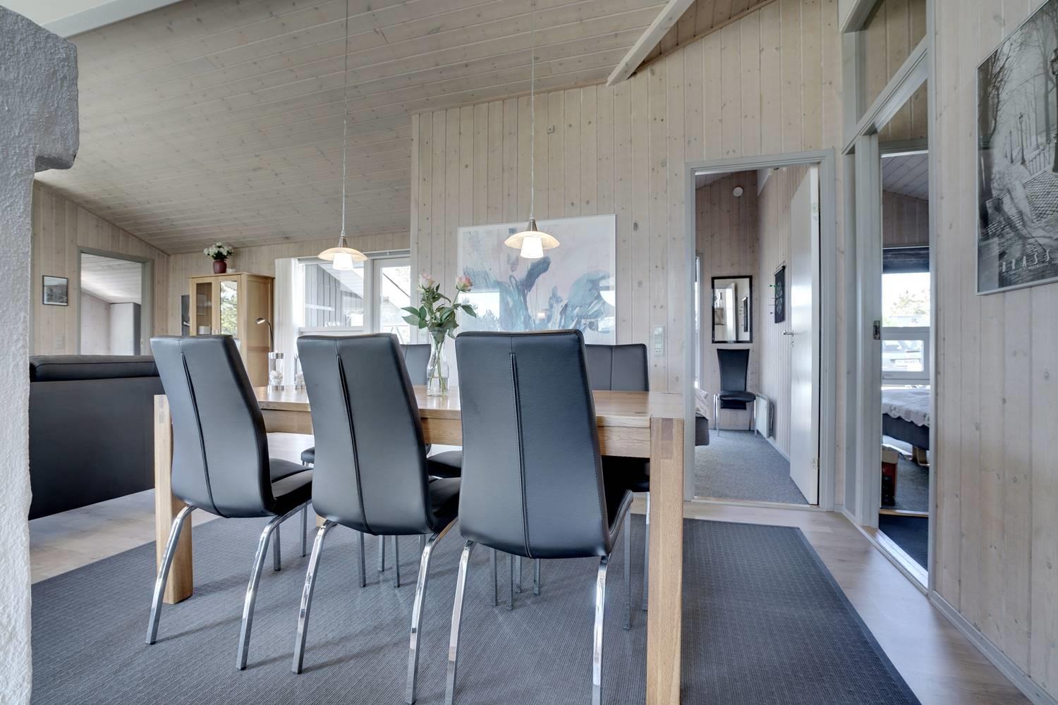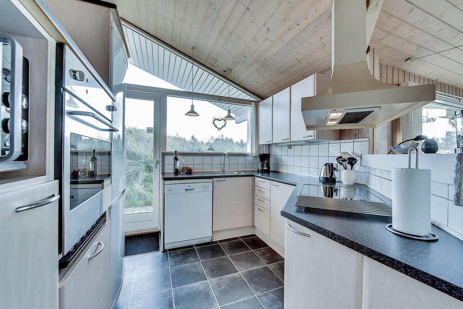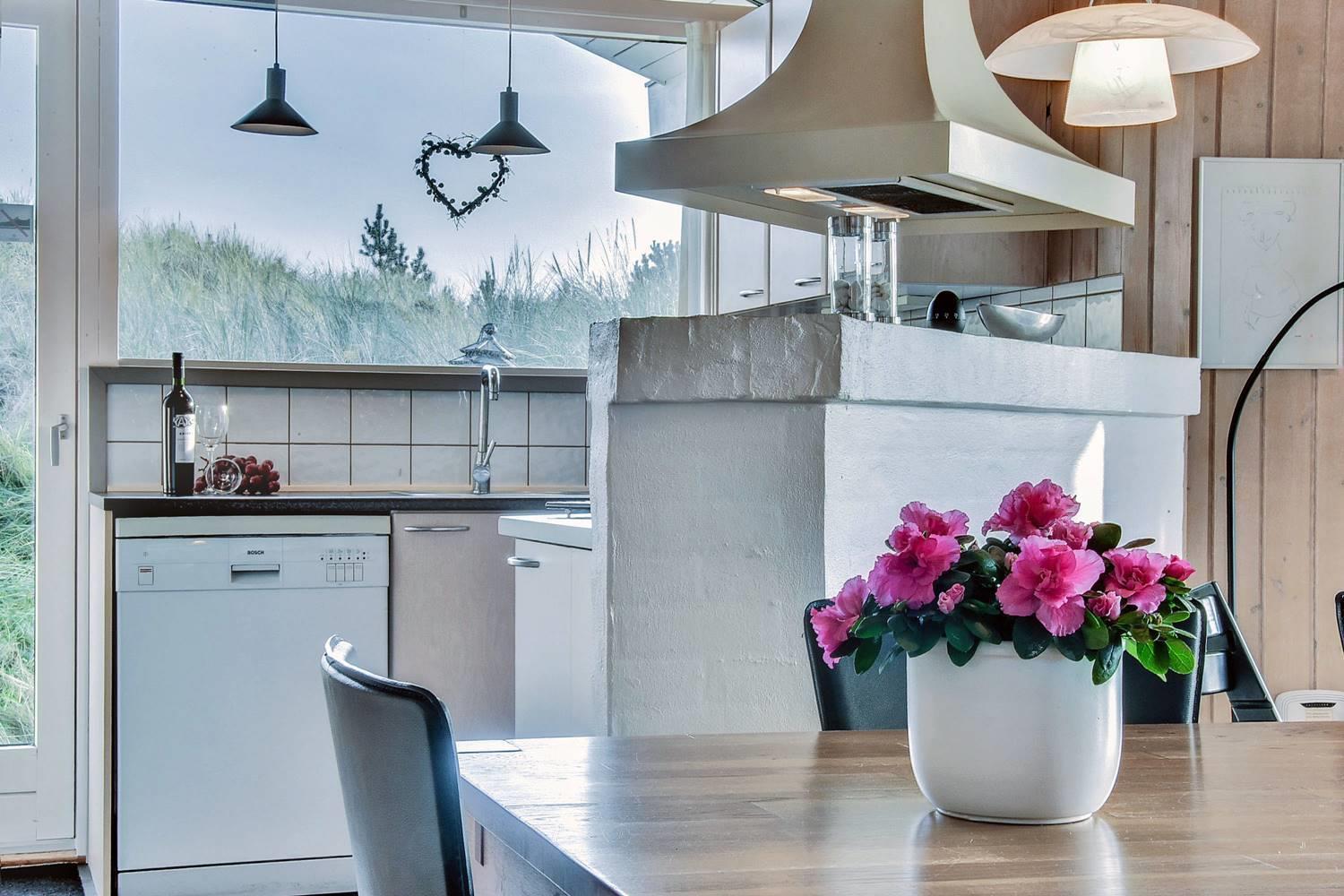 Huset er indrettet med et lyst og veludstyret køkken i åben forbindelse med en hyggelig stue, hvor brændeovn og varmepumpe sørger for komfort året rundt. Overalt er der loft til kip og store glaspartier, som inviterer lyset og naturen helt ind i opholdsrummene og skaber en behagelig og luftig atmosfære.