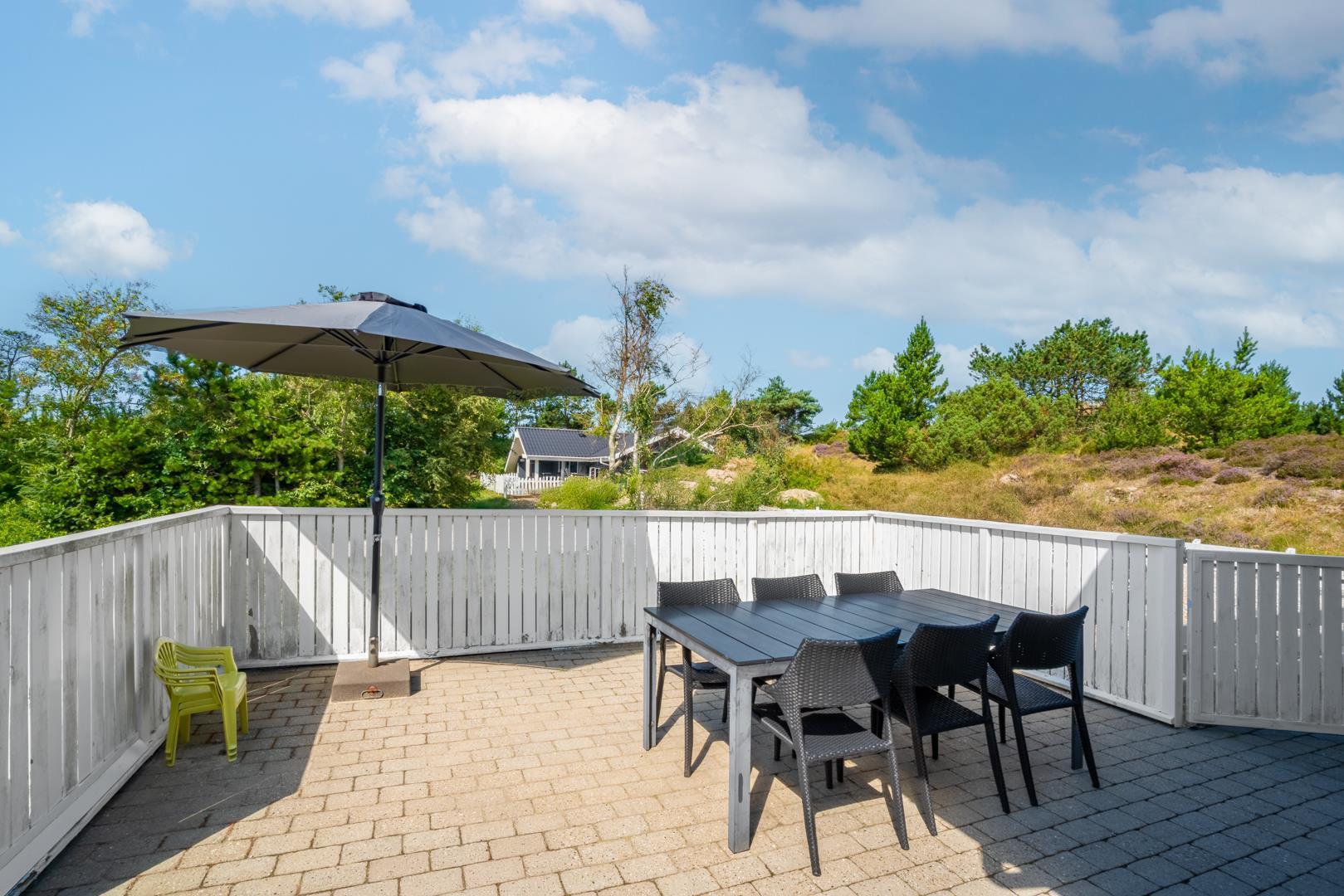 Fra husets egen klittop er der en fantastisk panoramaudsigt over området, og her kan solnedgangen nydes i ro og mag langt ud på aftenen – en sjælden naturoplevelse, lige uden for døren.