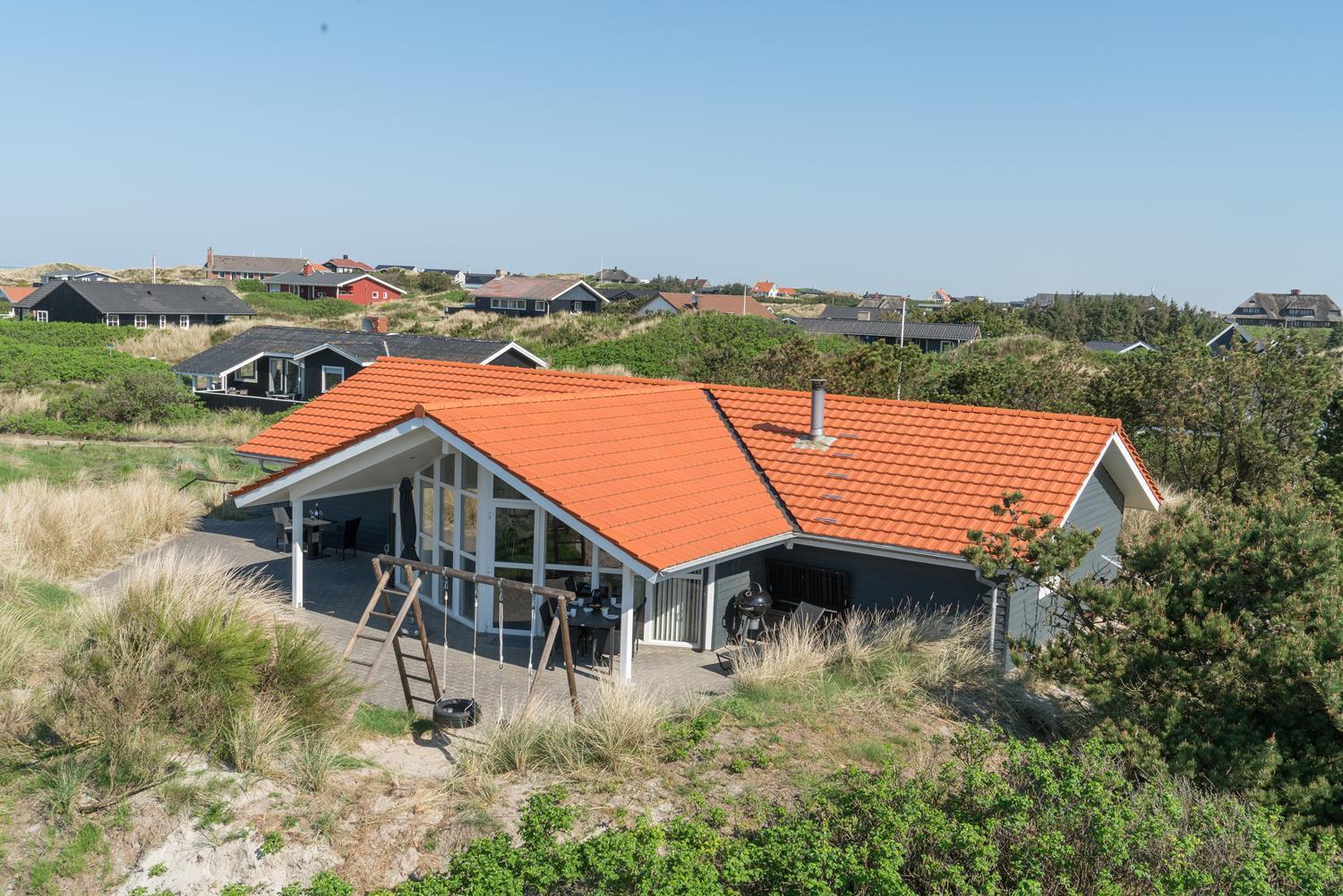 På en pragtfuld højtbeliggende kuperet klitgrund med udsigt over klitterne ligger dette pragtfulde og velholdte feriehus. Flot køkken kombineret med velmøbleret stue med loft til kip. Der er 2 flotte badeværelser med bruser, i det ene er der spa og sauna. 3 gode rummelige soverum. Fra stuen er der udgang til ugeneret terrasse, hvor udsigten og solen kan nydes. Gratis ADSL-Internetforbindelse.