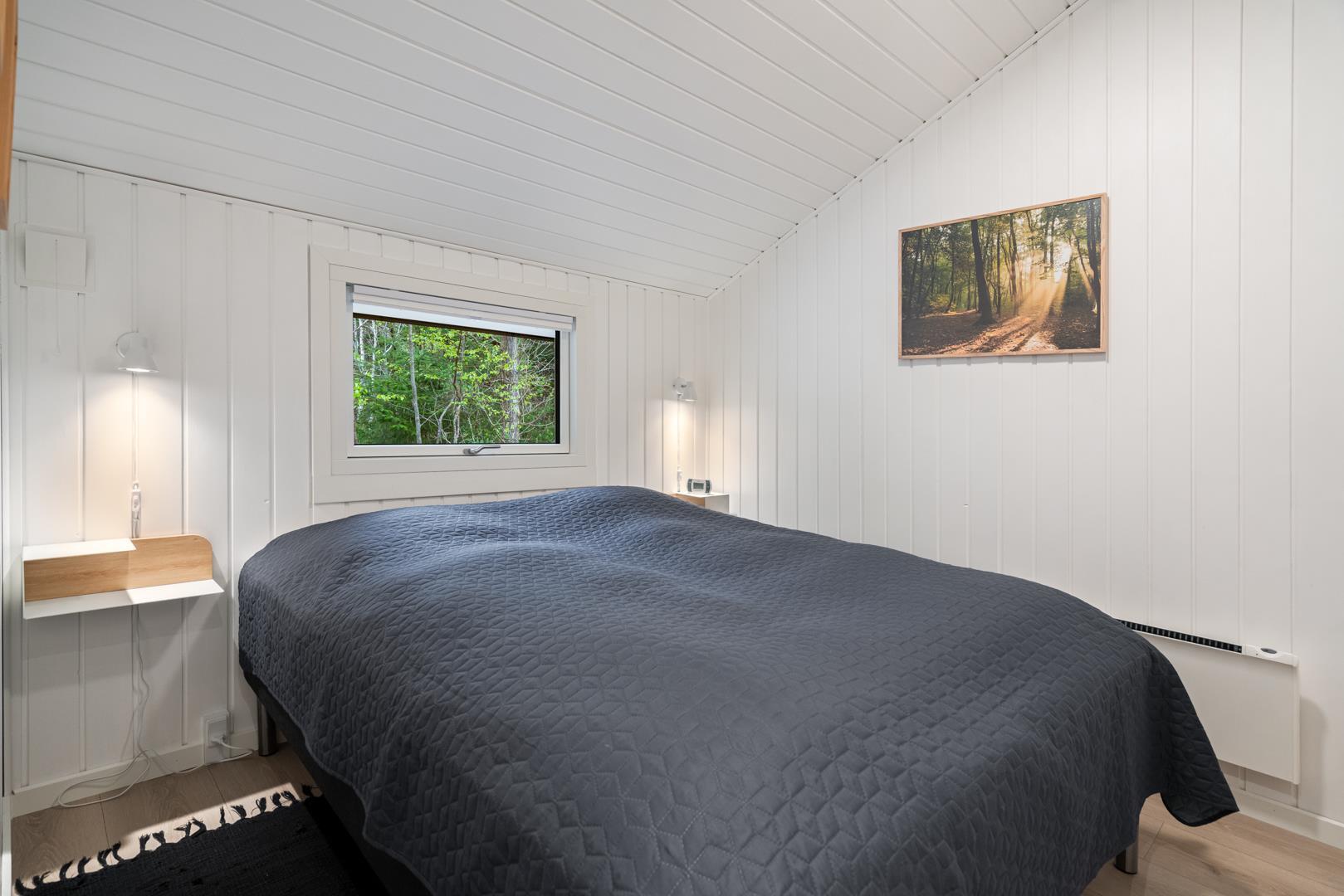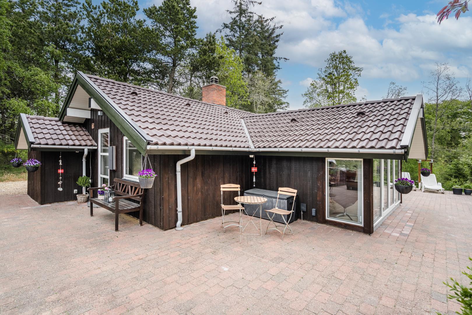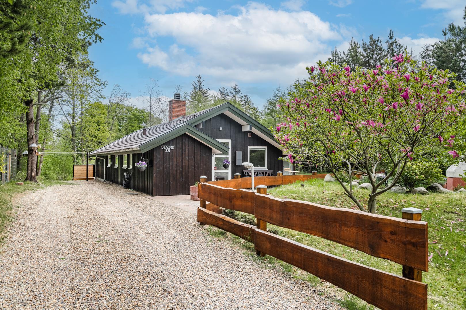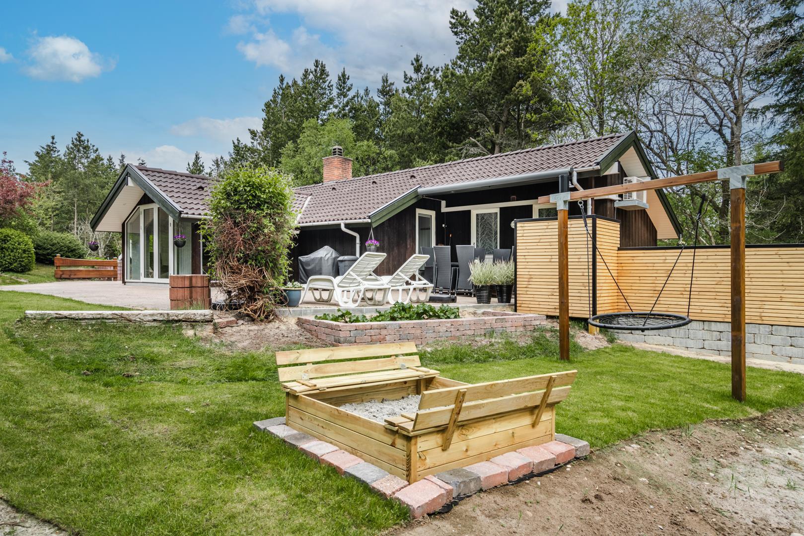 På en idyllisk grund i Henneby blandt træer og buske, som giver læ på de skønne terrasser finder I dette skønne sommerhus.