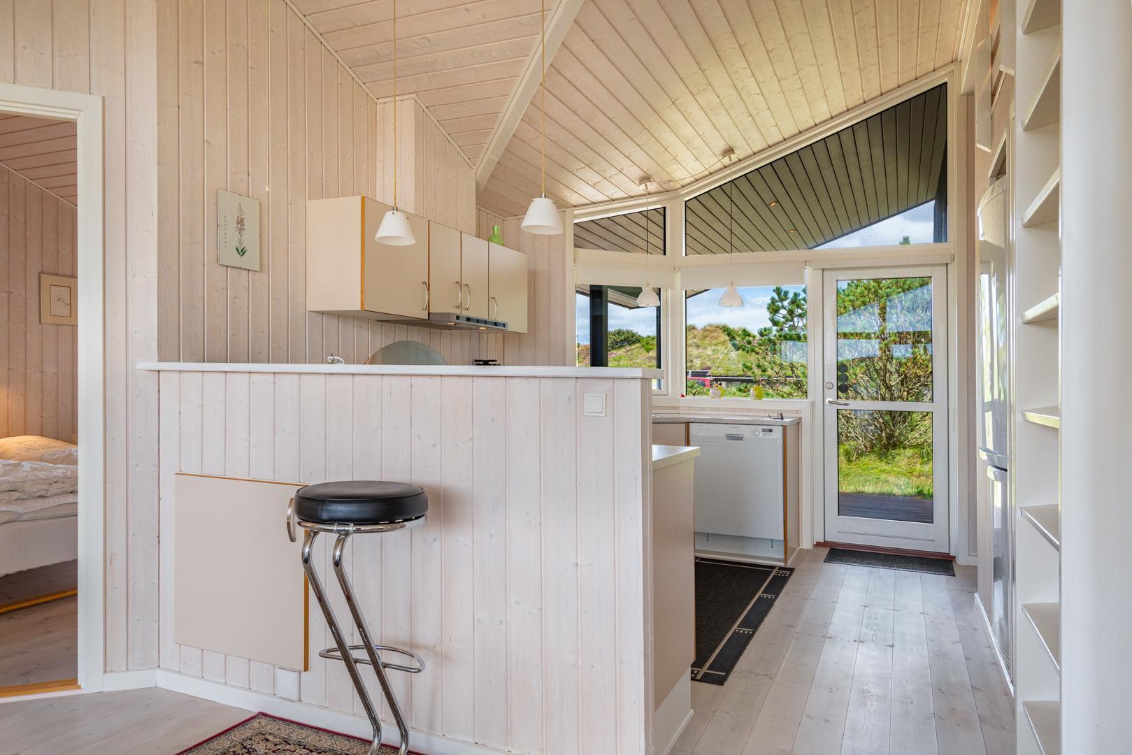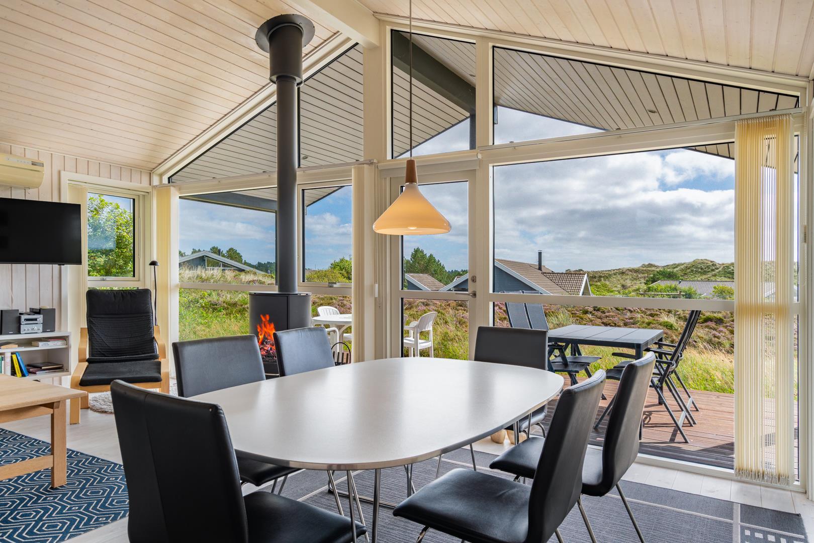 De store vinduer giver masser af naturligt lys og en smuk udsigt til klitlandskabet. Den åbne stue med brændeovn skaber en varm og indbydende stemning, mens varmepumpen sørger for behagelig temperatur året rundt.