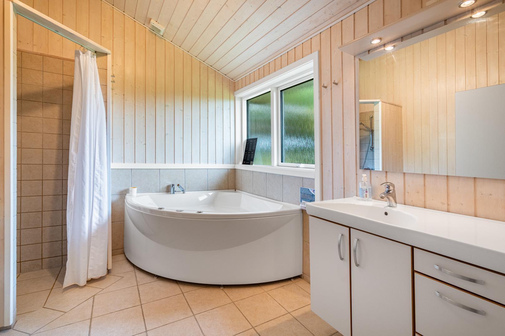 Badeværelset er mere end blot funktionelt – her finder I jeres egen lille wellness-oase med både sauna og spabad, hvor I kan slappe af efter en dag i naturen. Sommerhuset har desuden vaskemaskine, tørretumbler og værdiboks, som gør opholdet ekstra komfortabelt.
