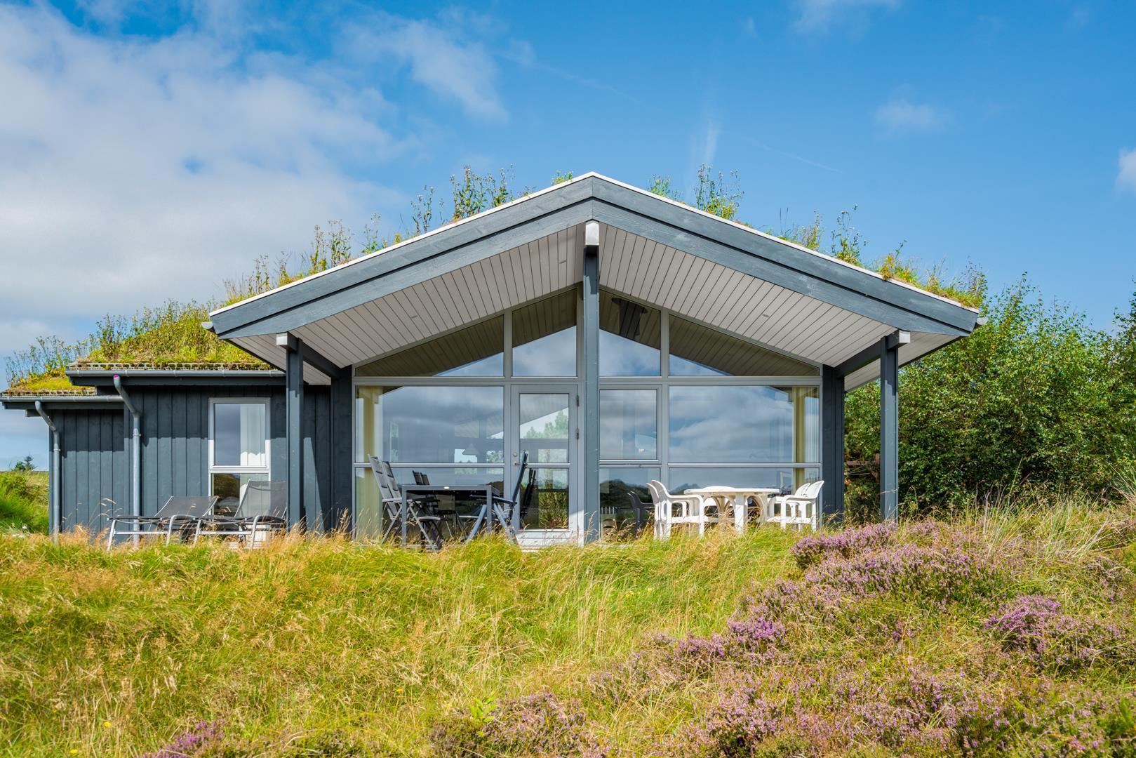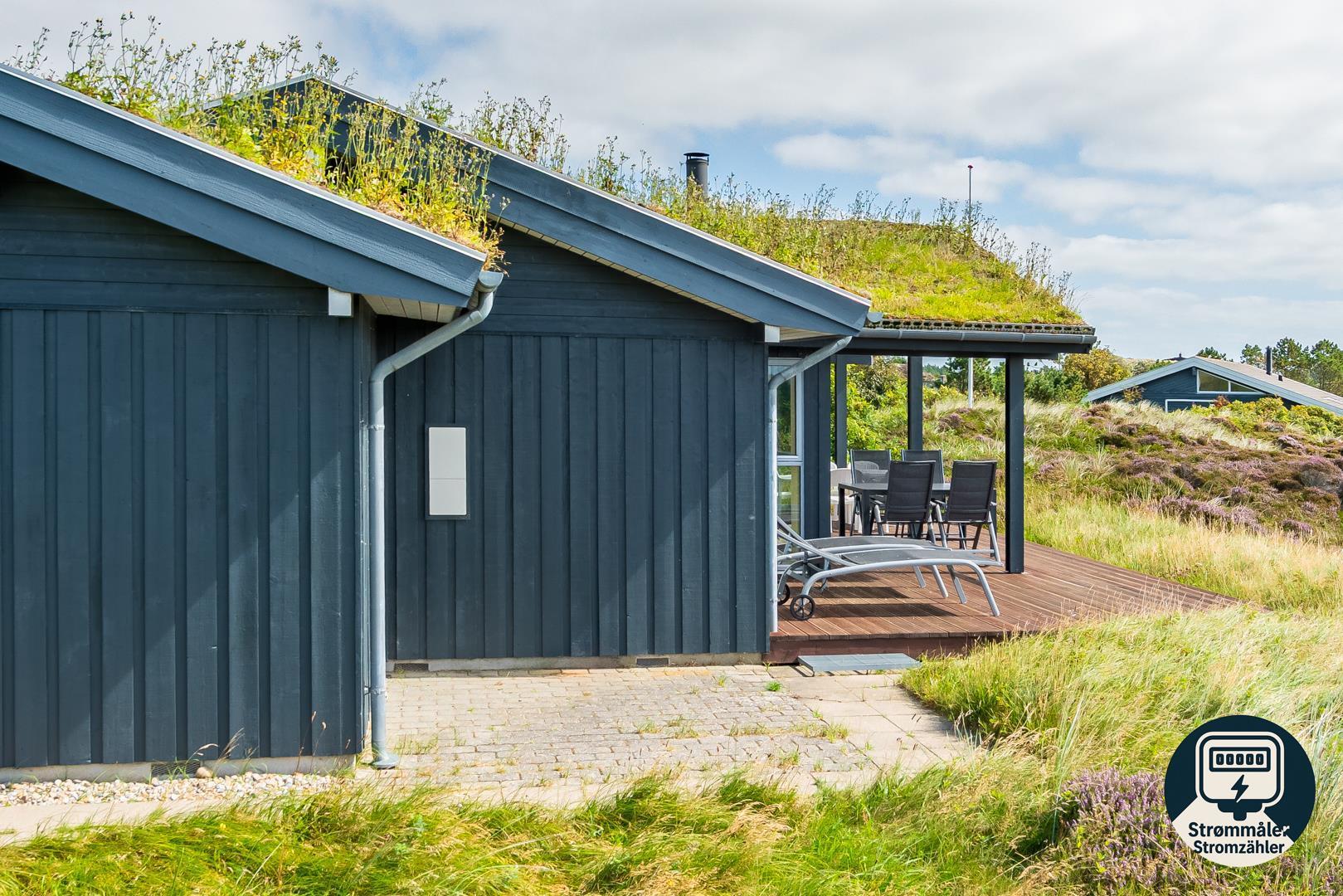 Udenfor venter en lukket og vindbeskyttet terrasse med havemøbler. Her kan I spise morgenmad i solen, nyde et glas vin om aftenen og bare slappe af i de rolige omgivelser. Udsigten til klitterne og naturen omkring sommerhuset gør terrassen til et helt særligt sted.