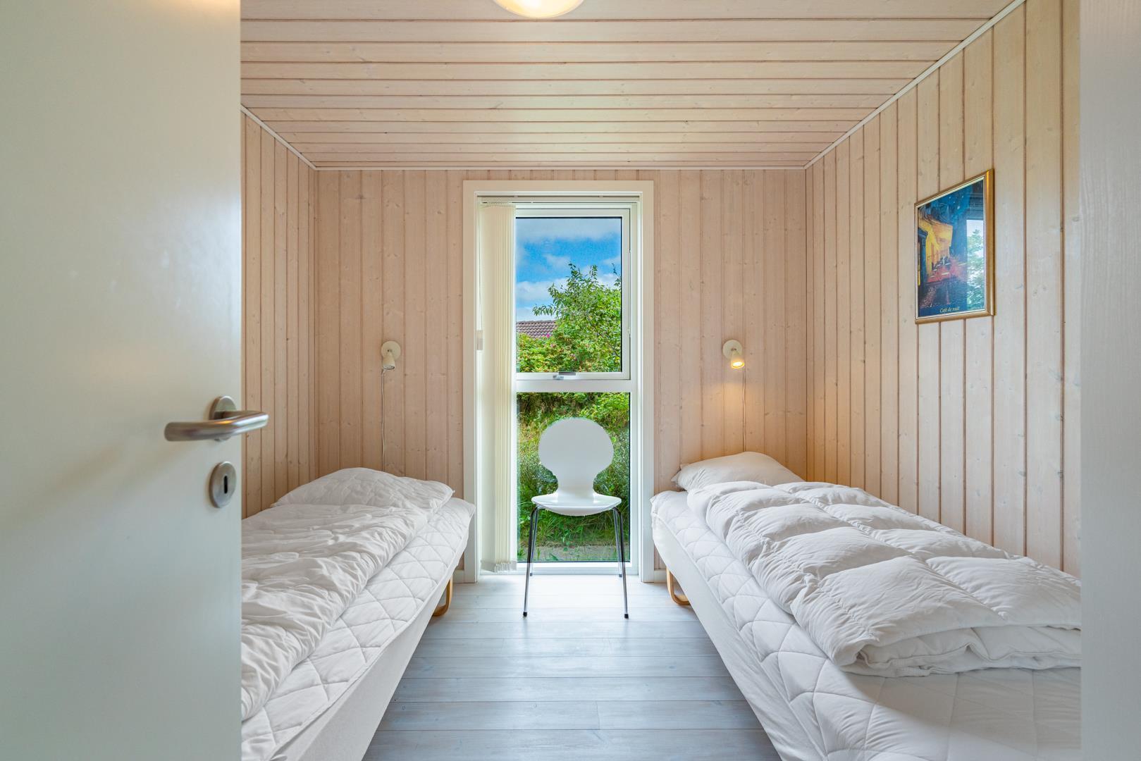 Sommerhuset har tre soveværelser – to med dobbeltsenge og ét med to enkeltsenge. Derudover er der en hyggelig hems, som især børn vil elske som ekstra soveplads eller lille gemmested.