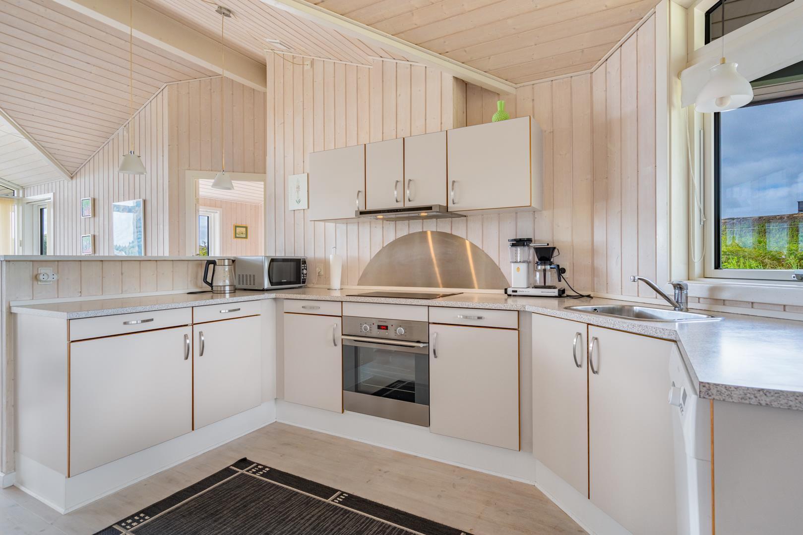 Det åbne køkken er moderne og fuldt udstyret med blandt andet opvaskemaskine og alt, hvad I behøver for at nyde ferien i jeres eget tempo.