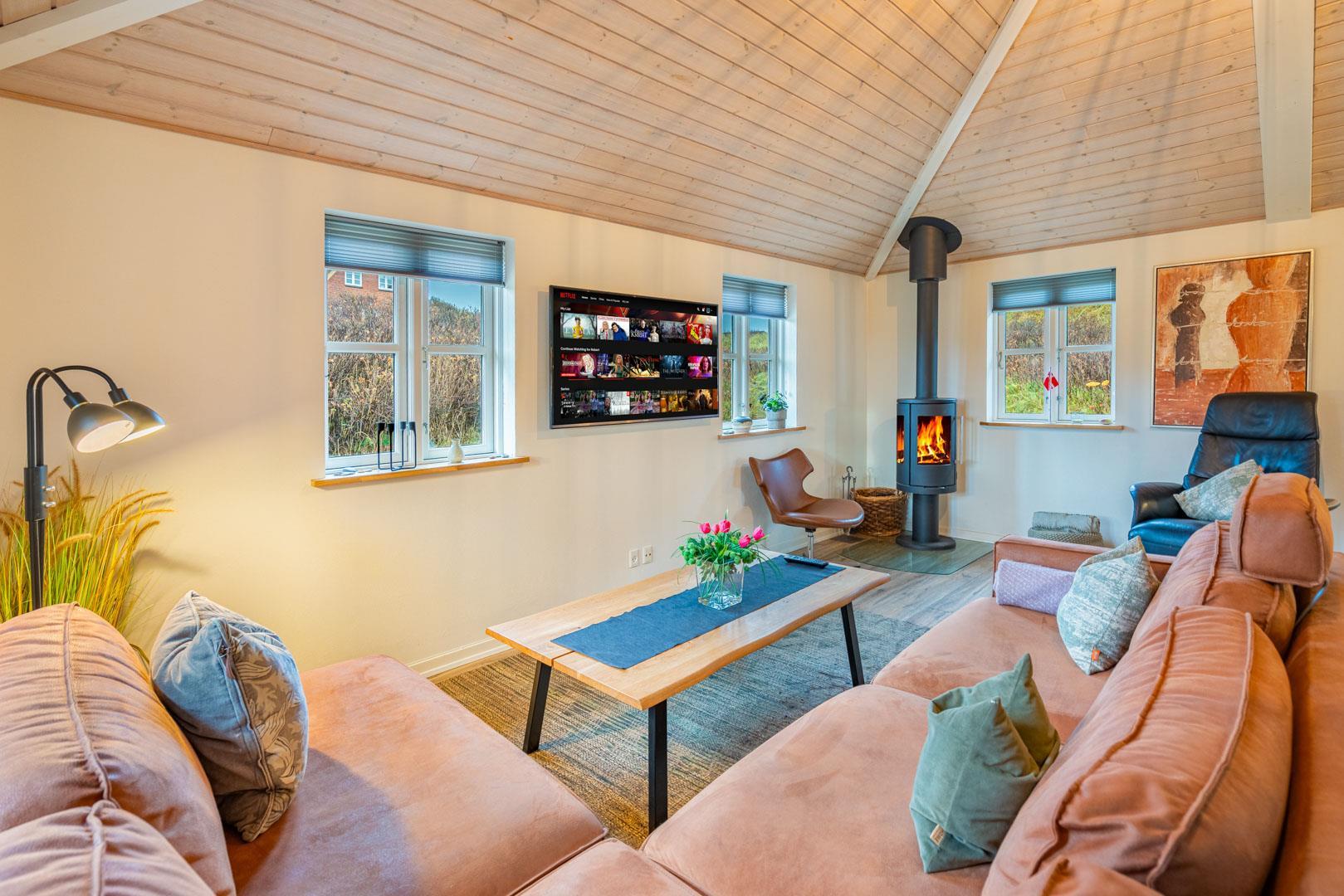 Velkommen til dette vidunderlige og hyggelige indrettede sommerhus i Henne Strand, der tilbyder den perfekte kombination af stil og funktionalitet. Beliggende meget tæt på både stranden og Henne Strand centrum, er dette sommerhus det ideelle tilflugtssted for din næste ferie. Hvert rum har en hyggelig atmosfære og sikre en behagelig ferieoplevelse. Den hyggelige stue med brændeovn og det lækre køkken ligger i åben forbindelse med hinanden, hvorfra der er udgang til flere skønne terrasser. Her er virkelig et lækkert udeområde hvor du kan nyde solen fra morgen til aften og suge den friske luft til dig. Fra liggestolene kan du nyde børnene lege i den store sandkasse med gynge og vippedyr – Perfekt underholdning til de mindste børn.