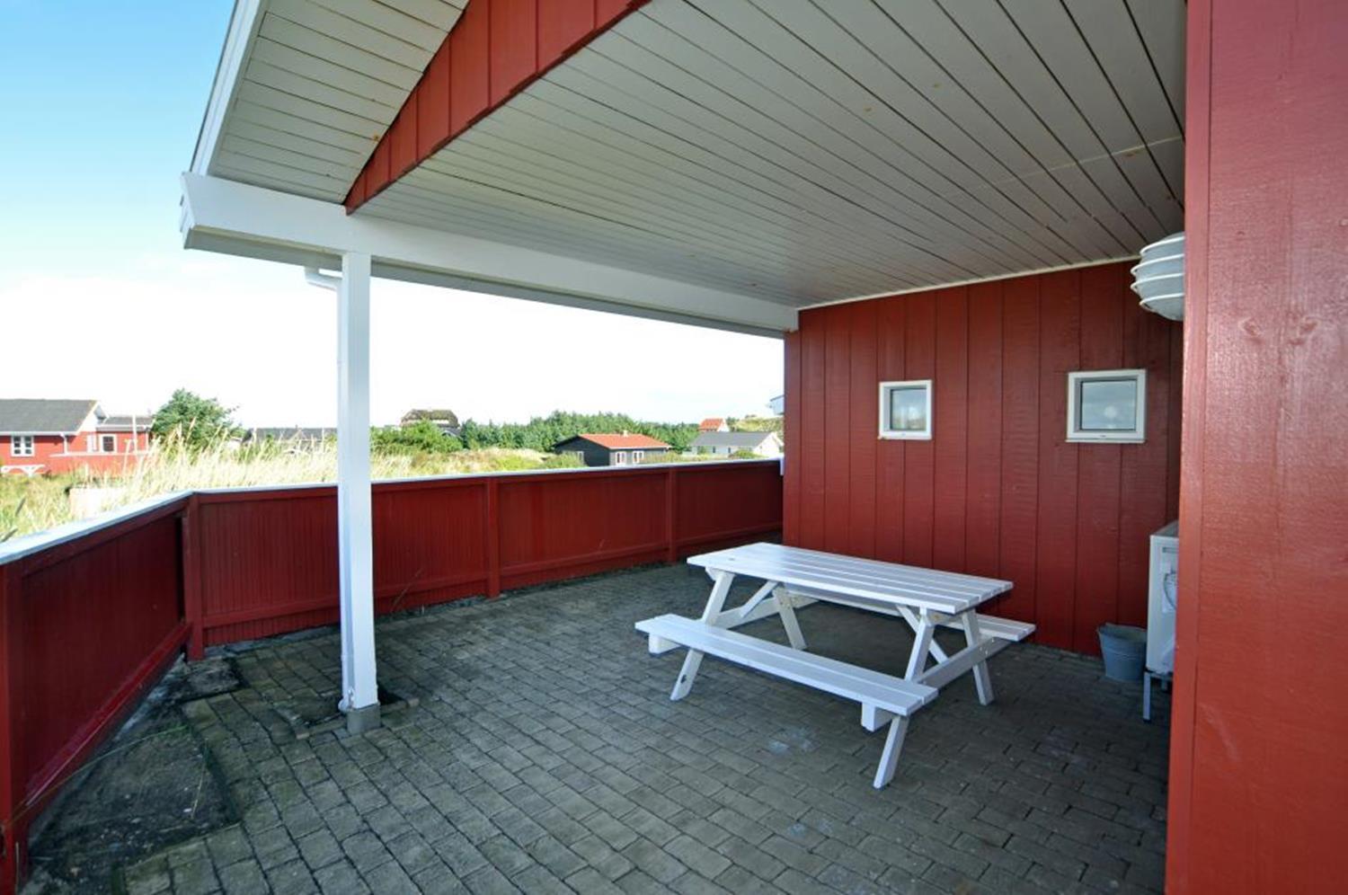 Fra spiseafdelingen er der adgang til en skøn, overdækket terrasse mod syd, som giver læ og en hyggelig atmosfære til måltider i det fri. Perfekt til lange sommeraftener!