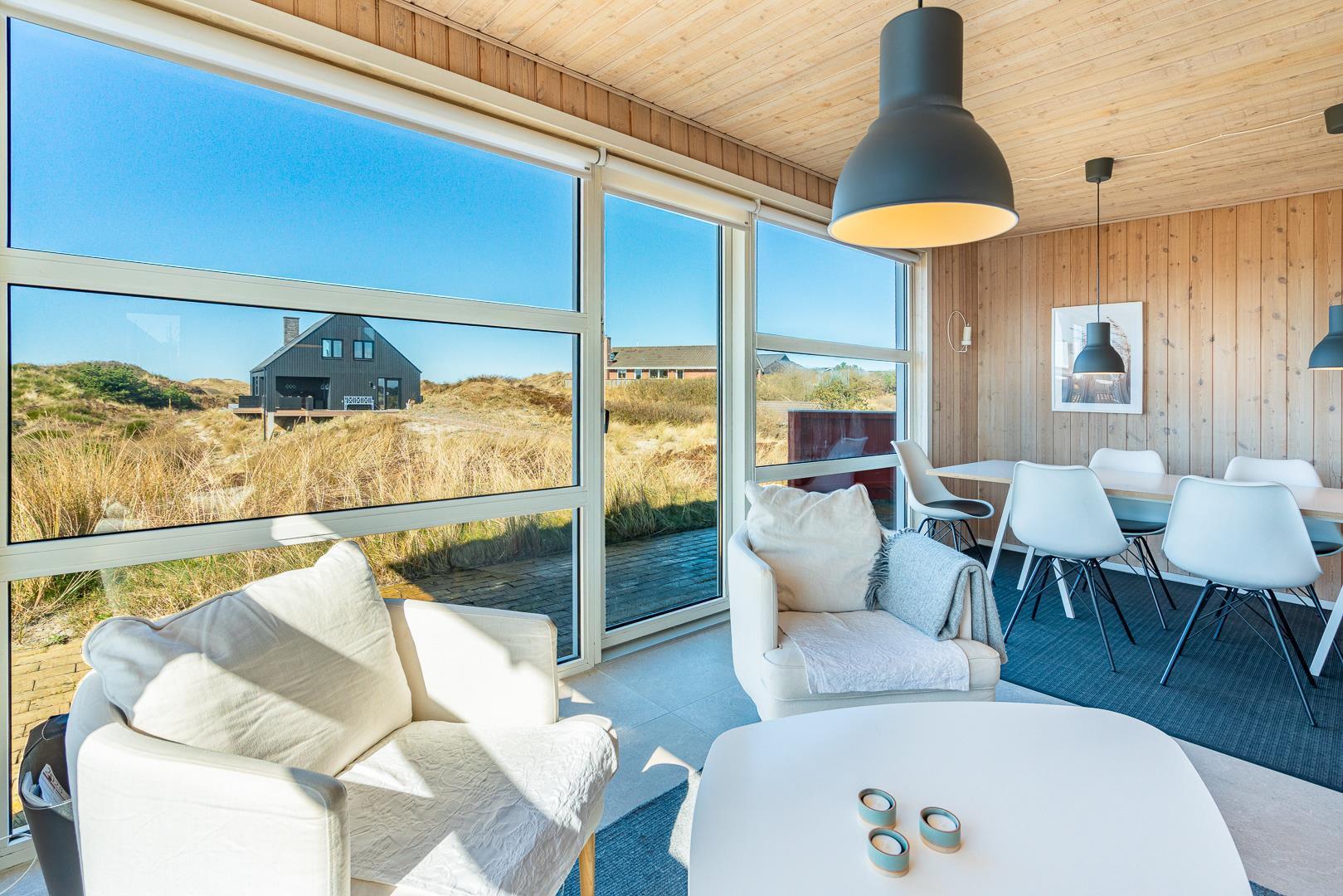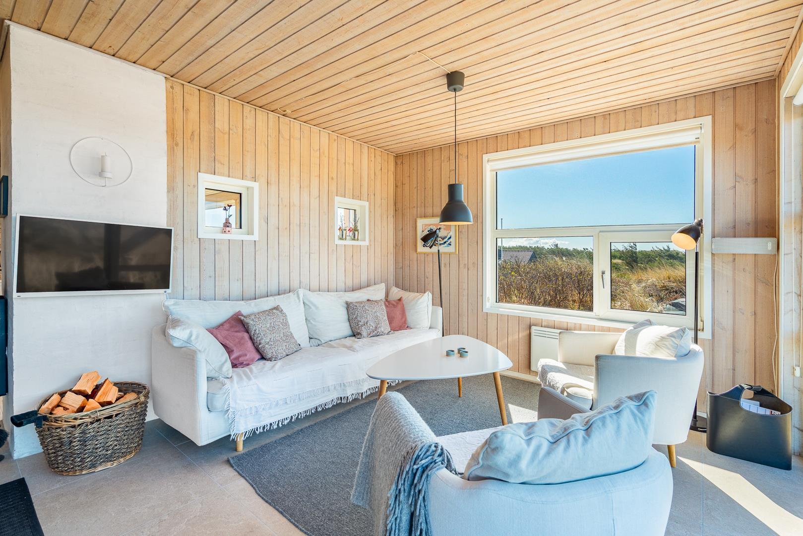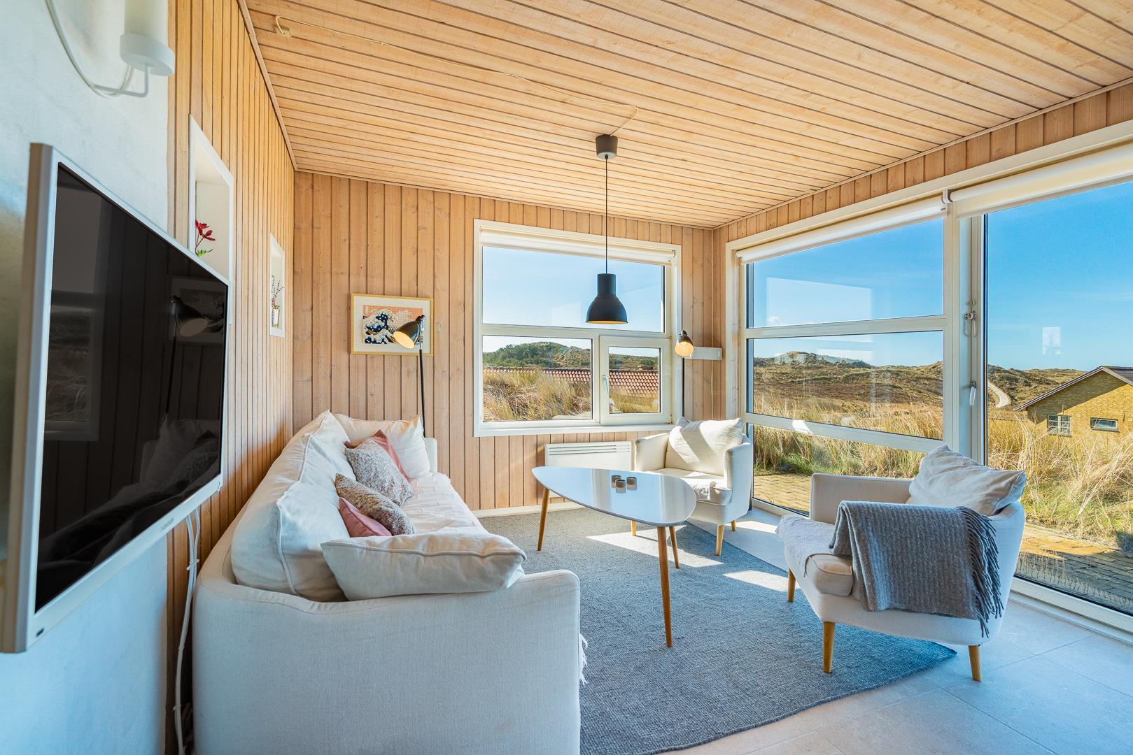 Fra stuen og terrassen kan du nyde en betagende udsigt over det smukke klitlandskab. Den lyse og rummelige stue er indrettet med gode møbler og har direkte udgang til en vestvendt terrasse, hvor du kan slappe af og nyde solnedgangen.