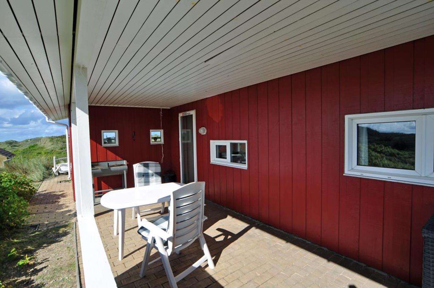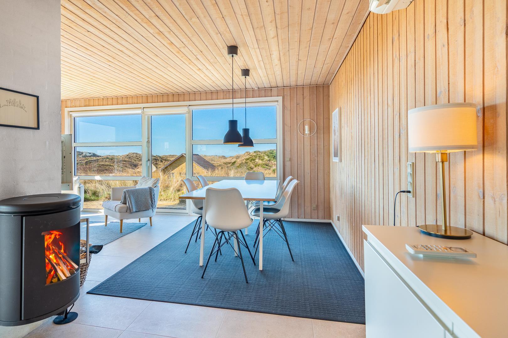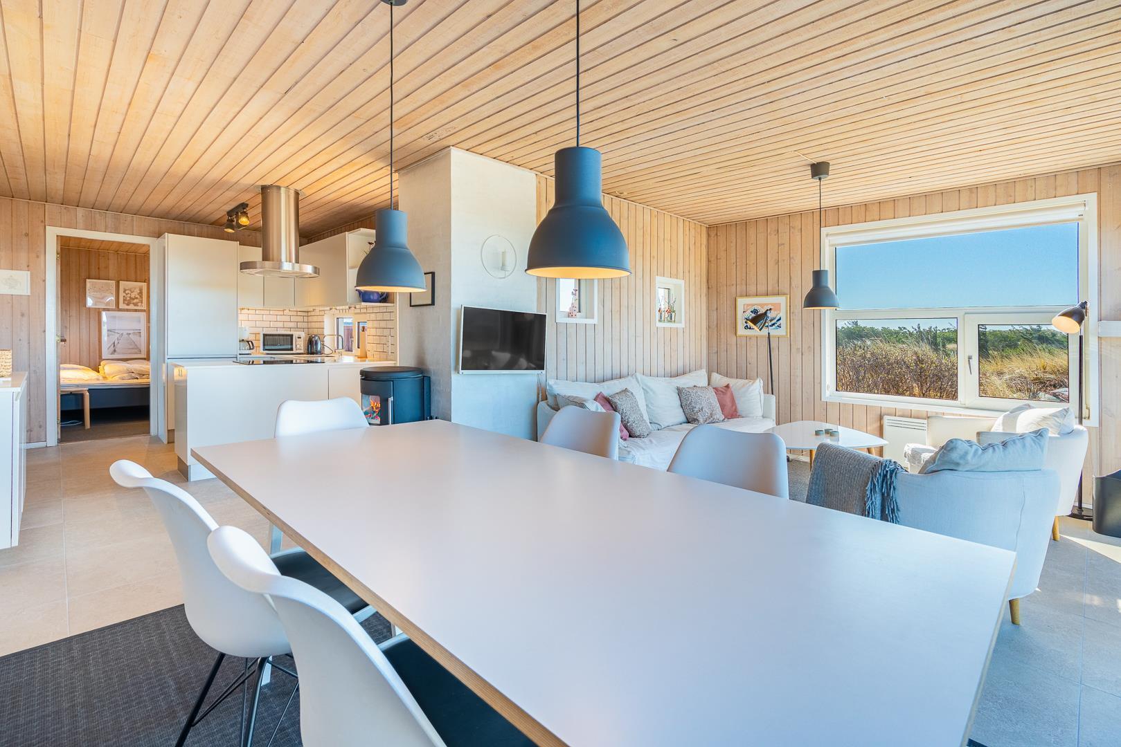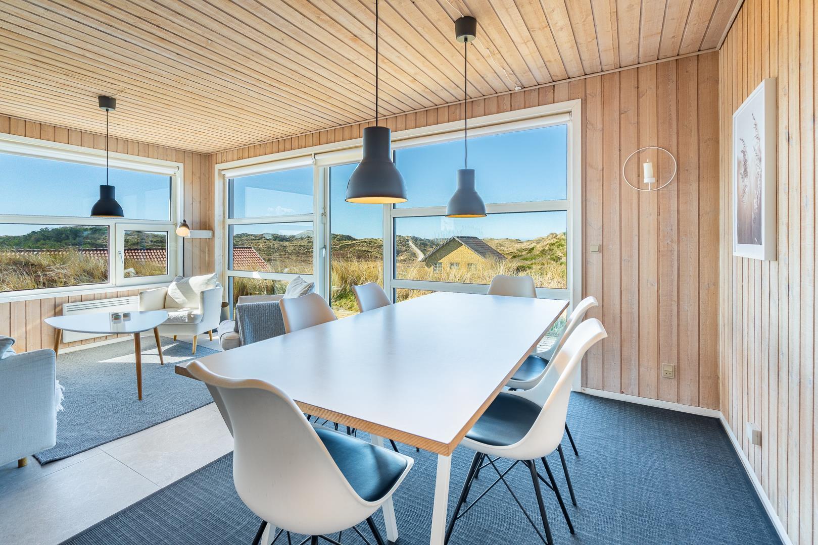 Fra stuen og terrassen kan du nyde en betagende udsigt over det smukke klitlandskab. Den lyse og rummelige stue er indrettet med gode møbler og har direkte udgang til en vestvendt terrasse, hvor du kan slappe af og nyde solnedgangen.