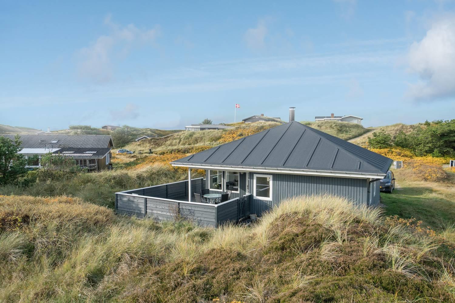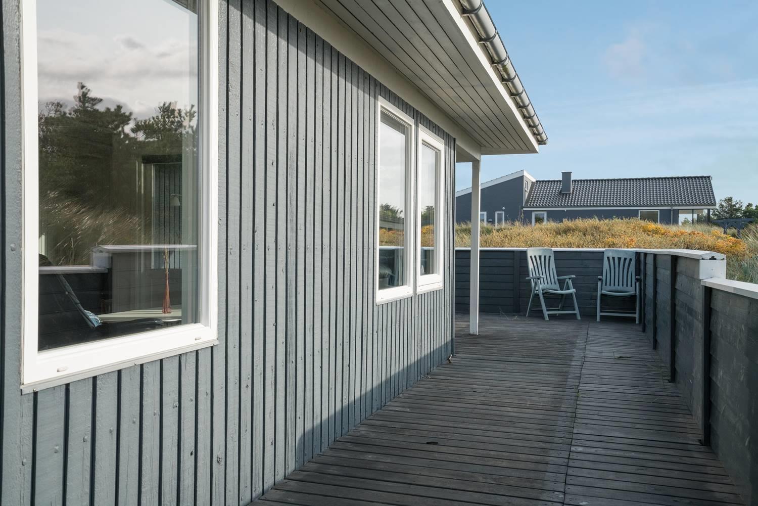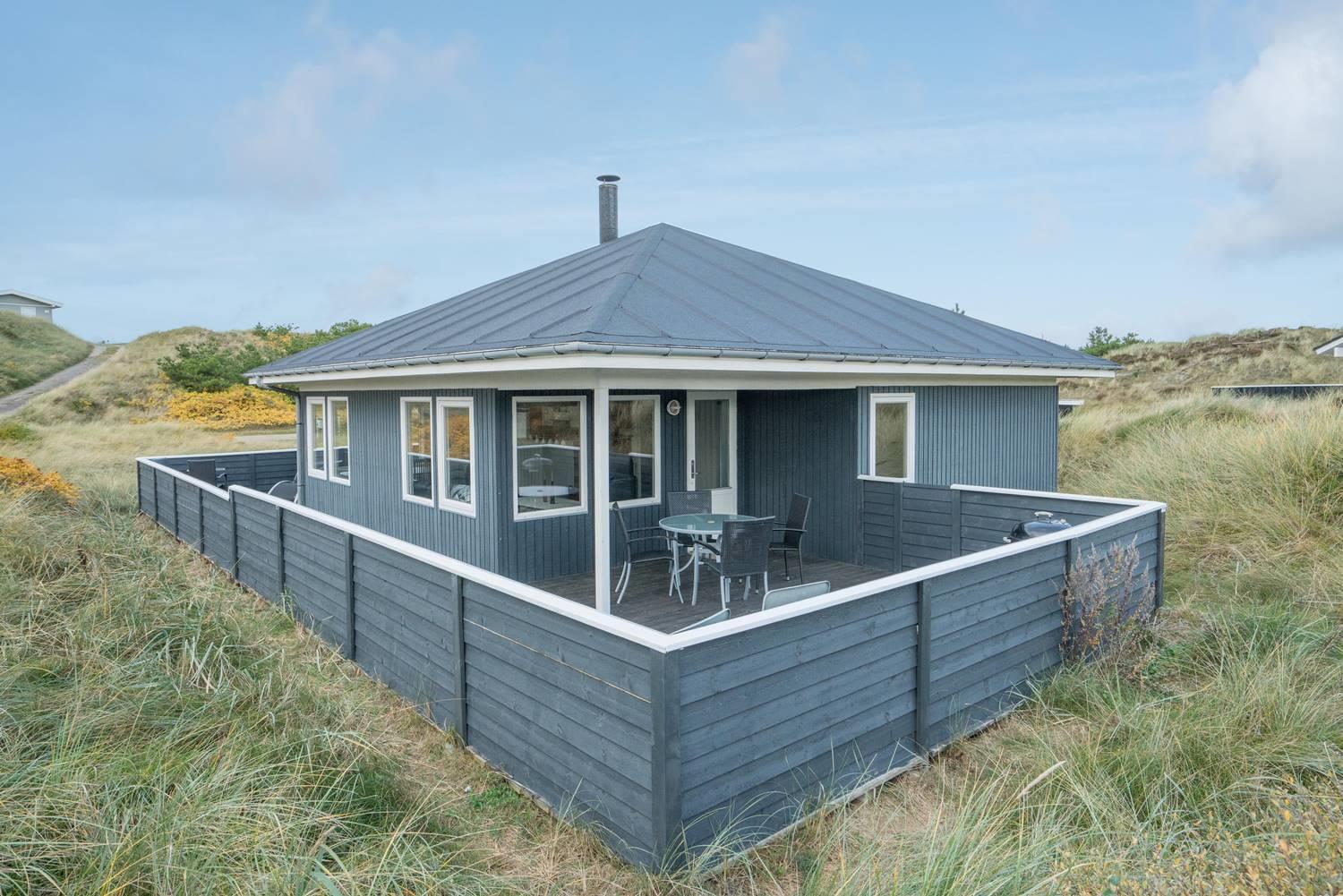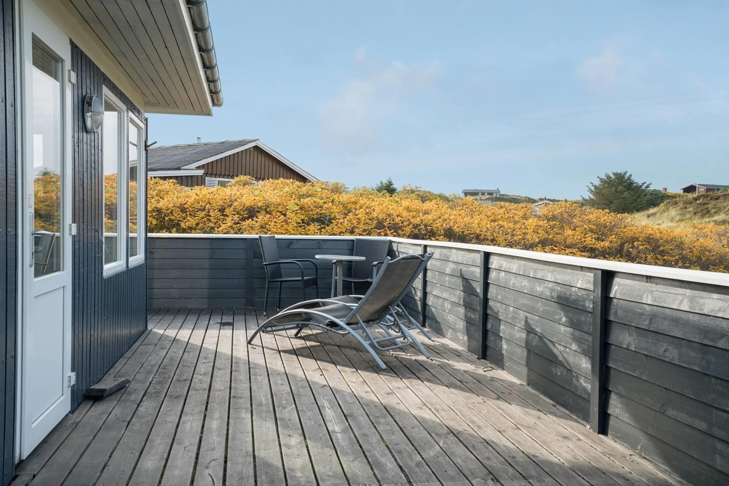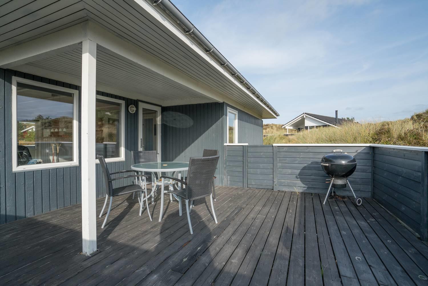 Flot feriehus i Henne Strand med sauna, skønne terrasser og tæt på stranden, perfekt til afslapning i naturskønne omgivelser.