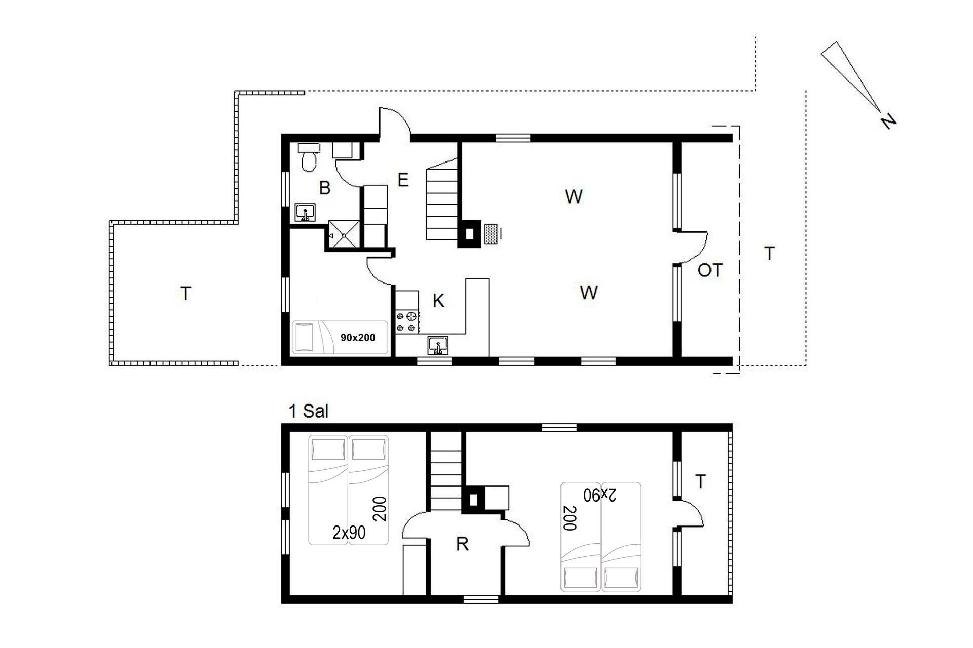Sengestørrelser: 2 dobbeltsenge med 2 madrasser 90 x 200 cm + 1 enkeltseng 90 x 200 cm