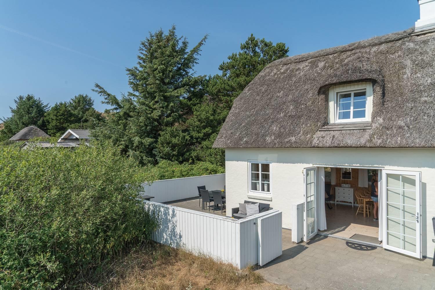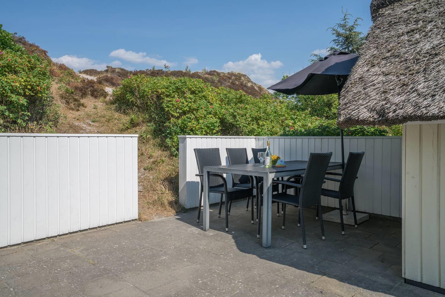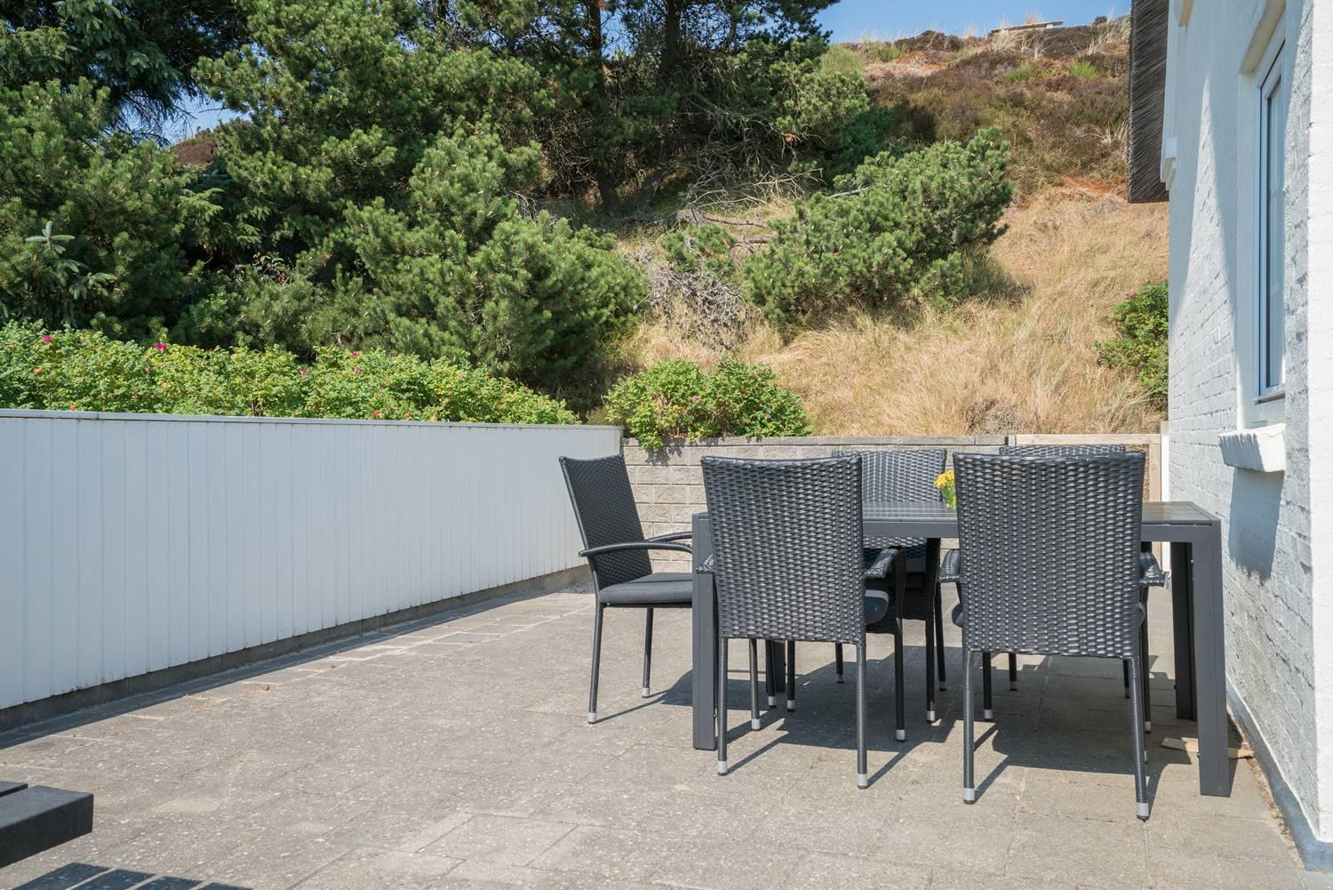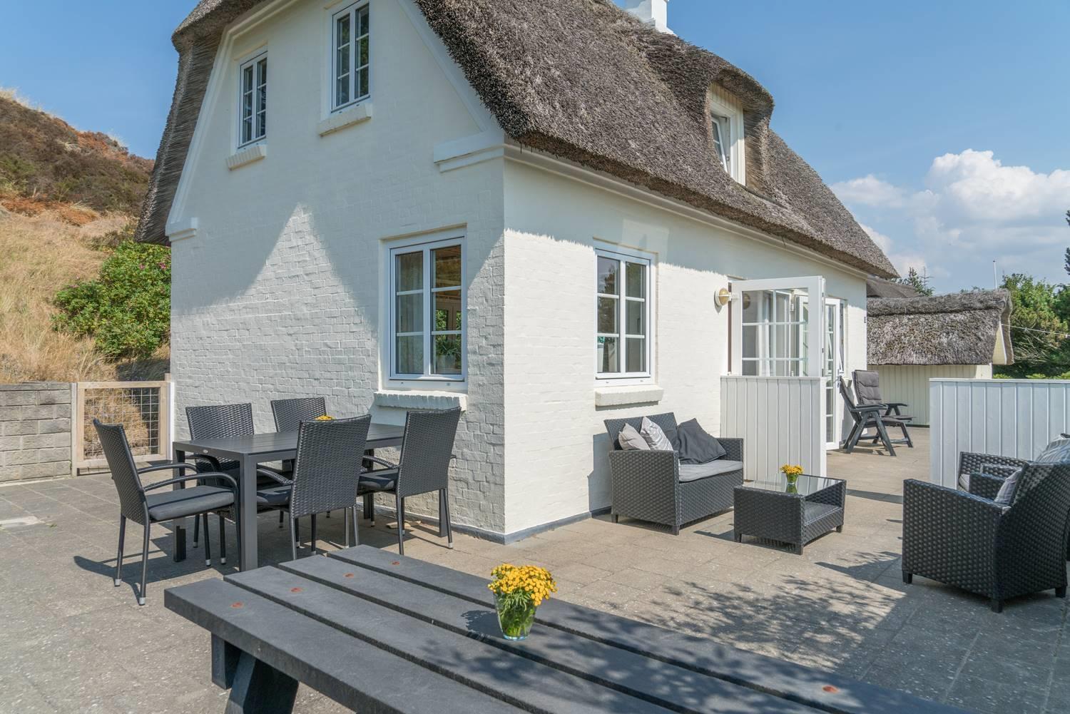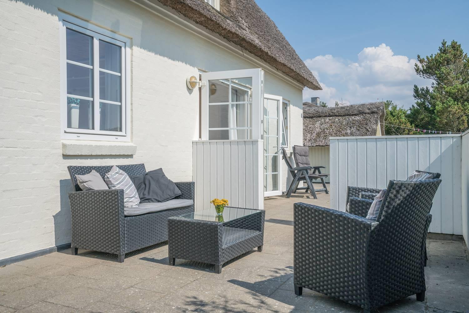 Huset er omkranset af en stor, solrig og helt lukket terrasse, hvor man altid kan finde læ og nyde udelivet i fred og ro. Her er plads til både afslapning, grillhygge og leg for de mindste.