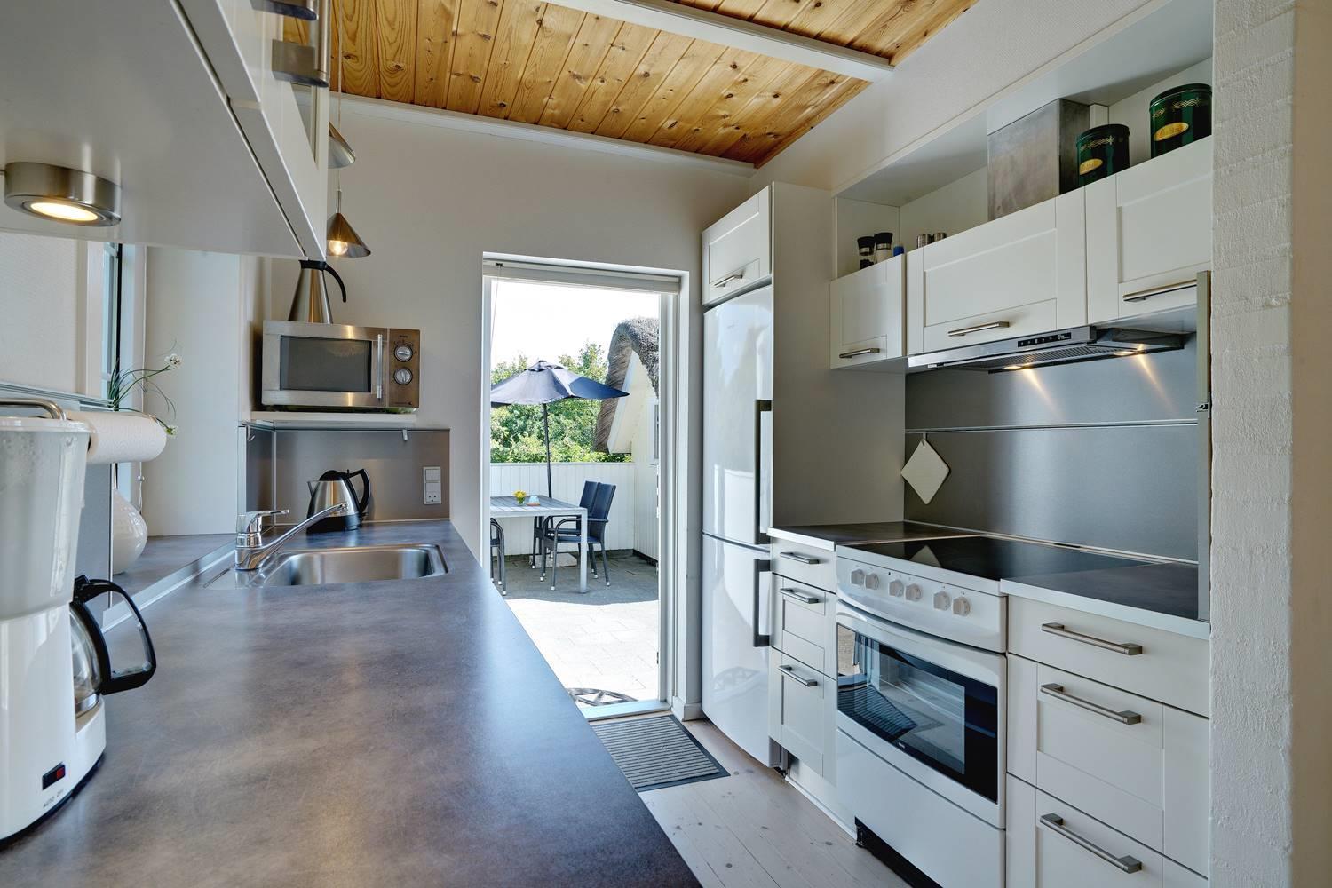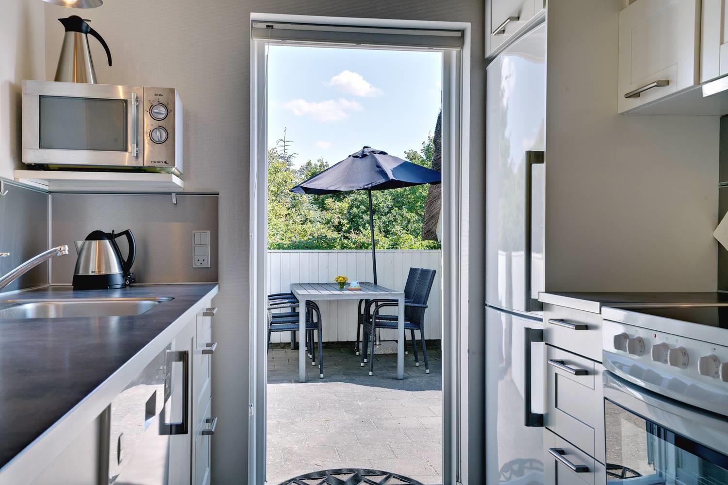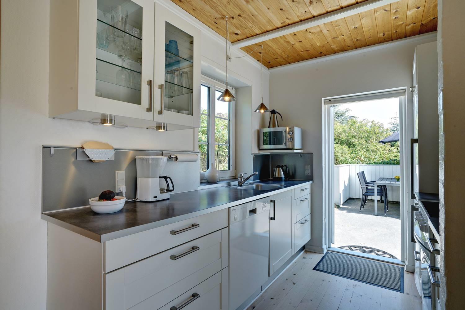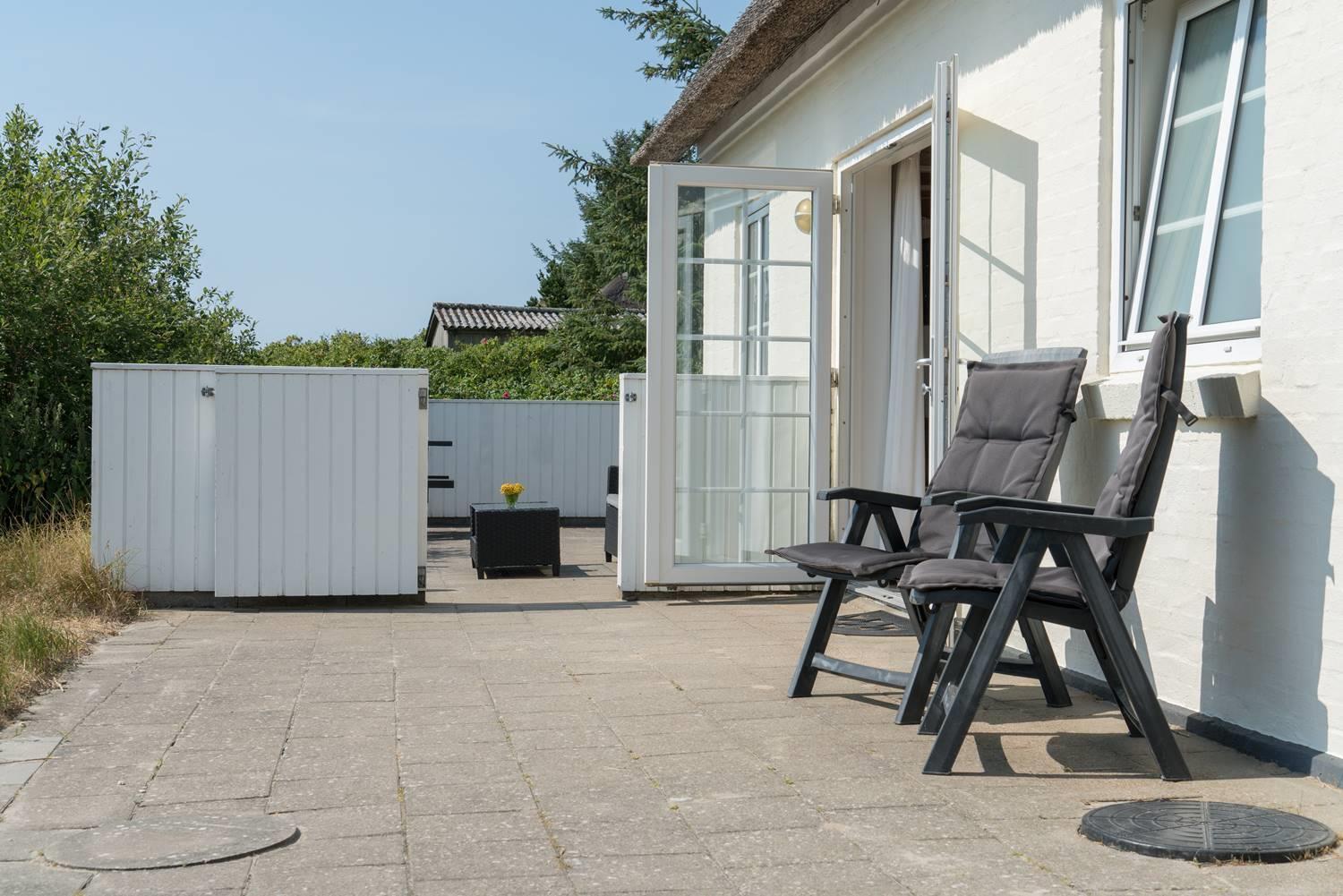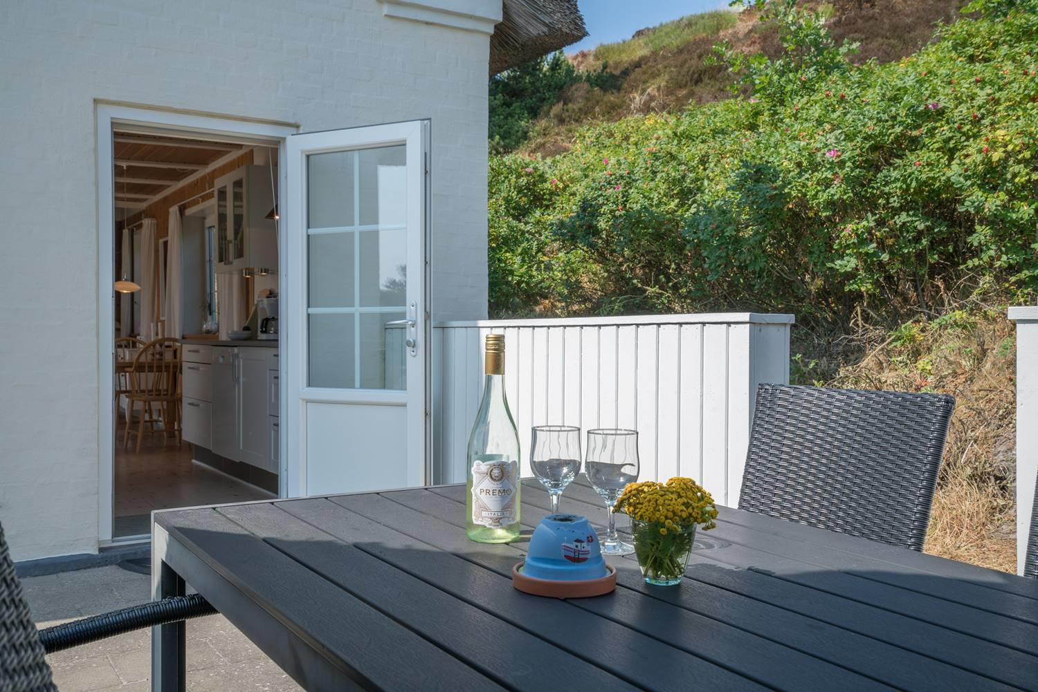 Huset er omkranset af en stor, solrig og helt lukket terrasse, hvor man altid kan finde læ og nyde udelivet i fred og ro. Her er plads til både afslapning, grillhygge og leg for de mindste.