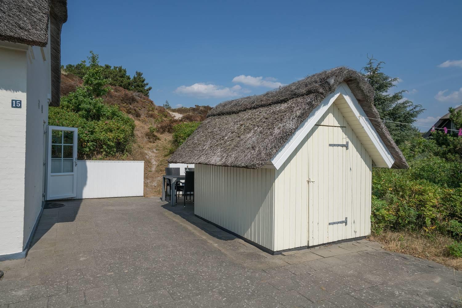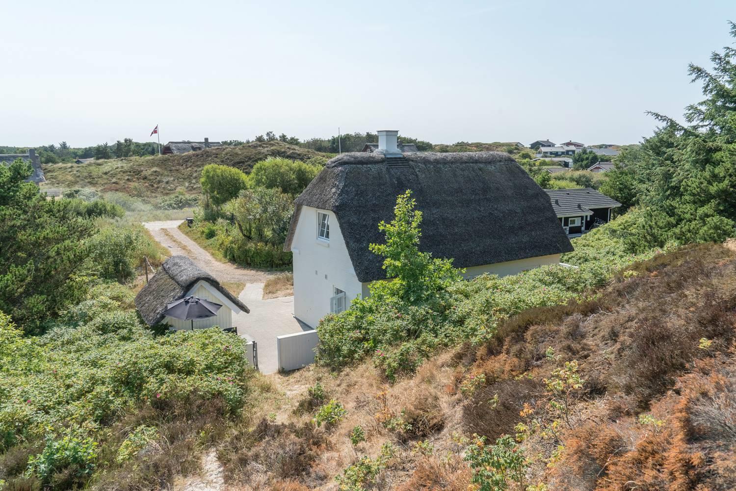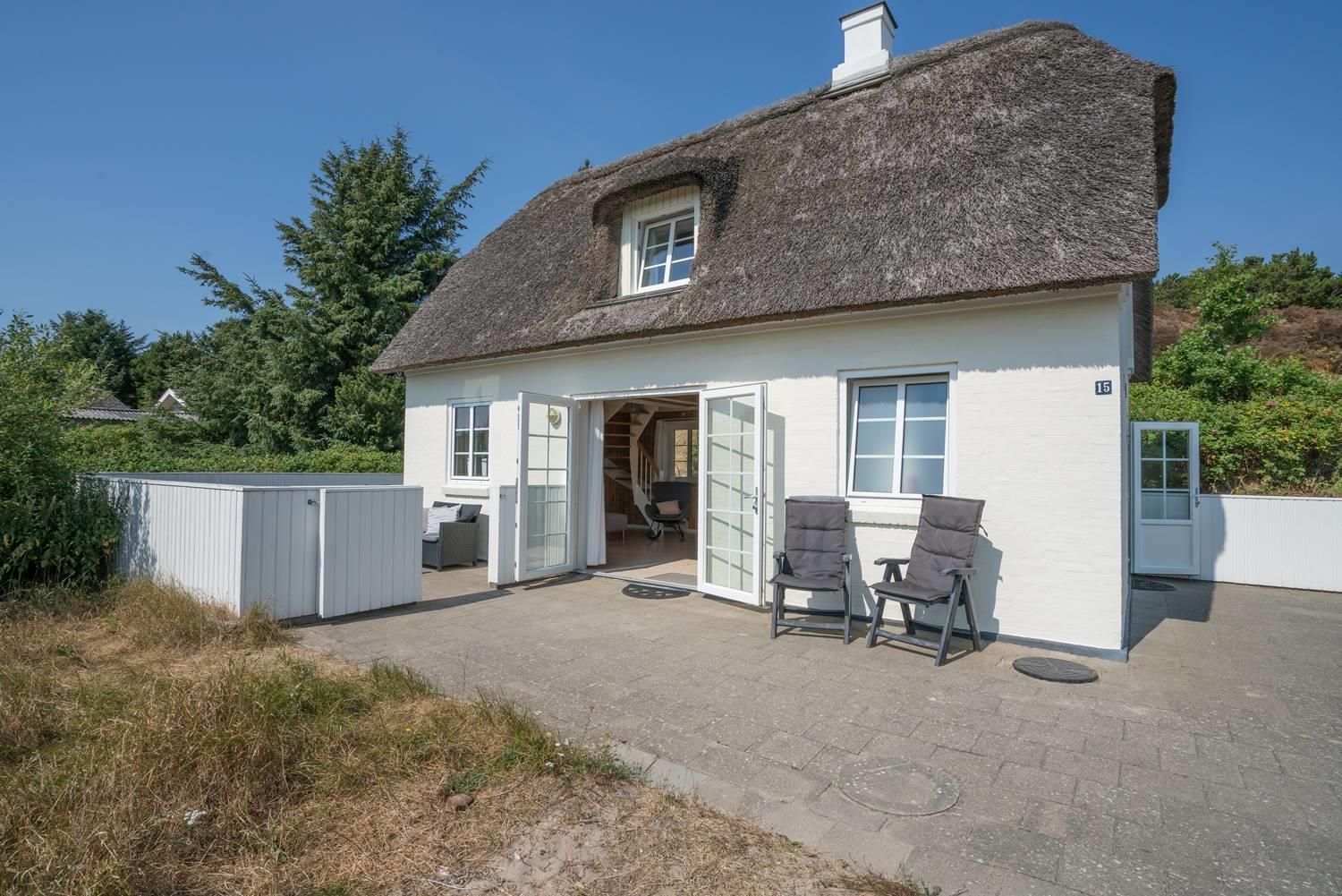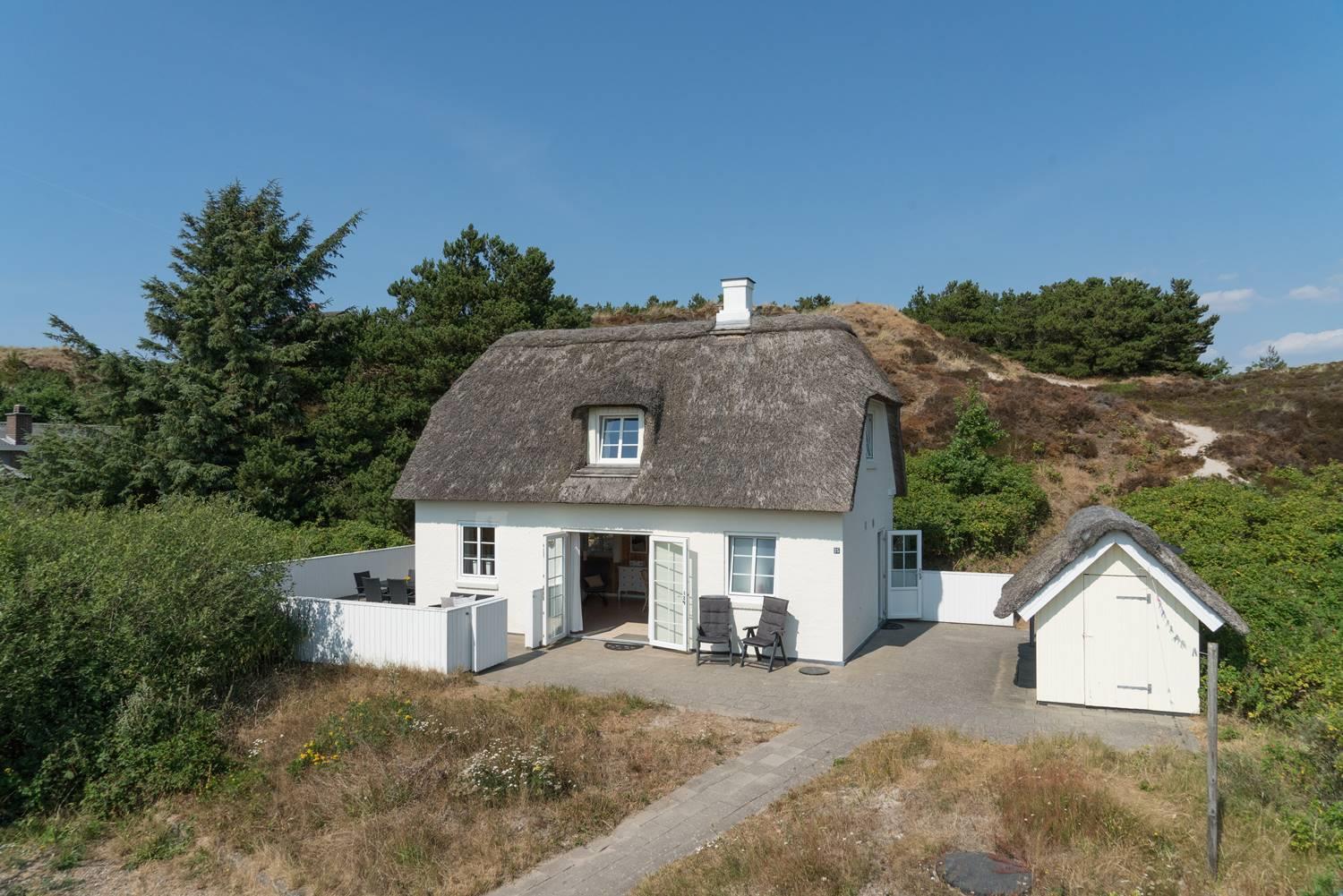 Hyggeligt stråtækt sommerhus med stor lukket terrasse nær Henne Strand, ideelt til fred og afslapning i naturskønne omgivelser.