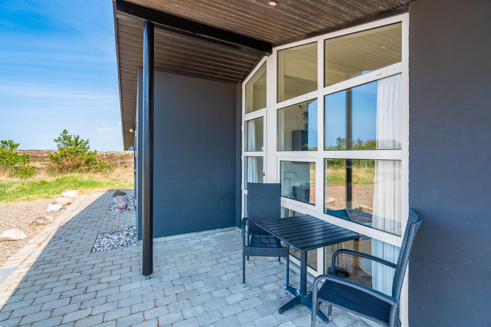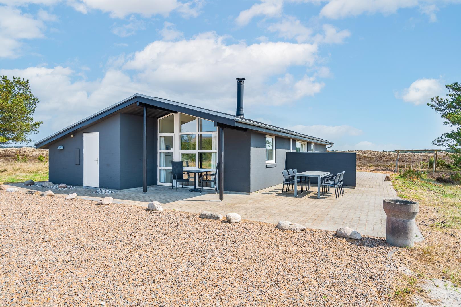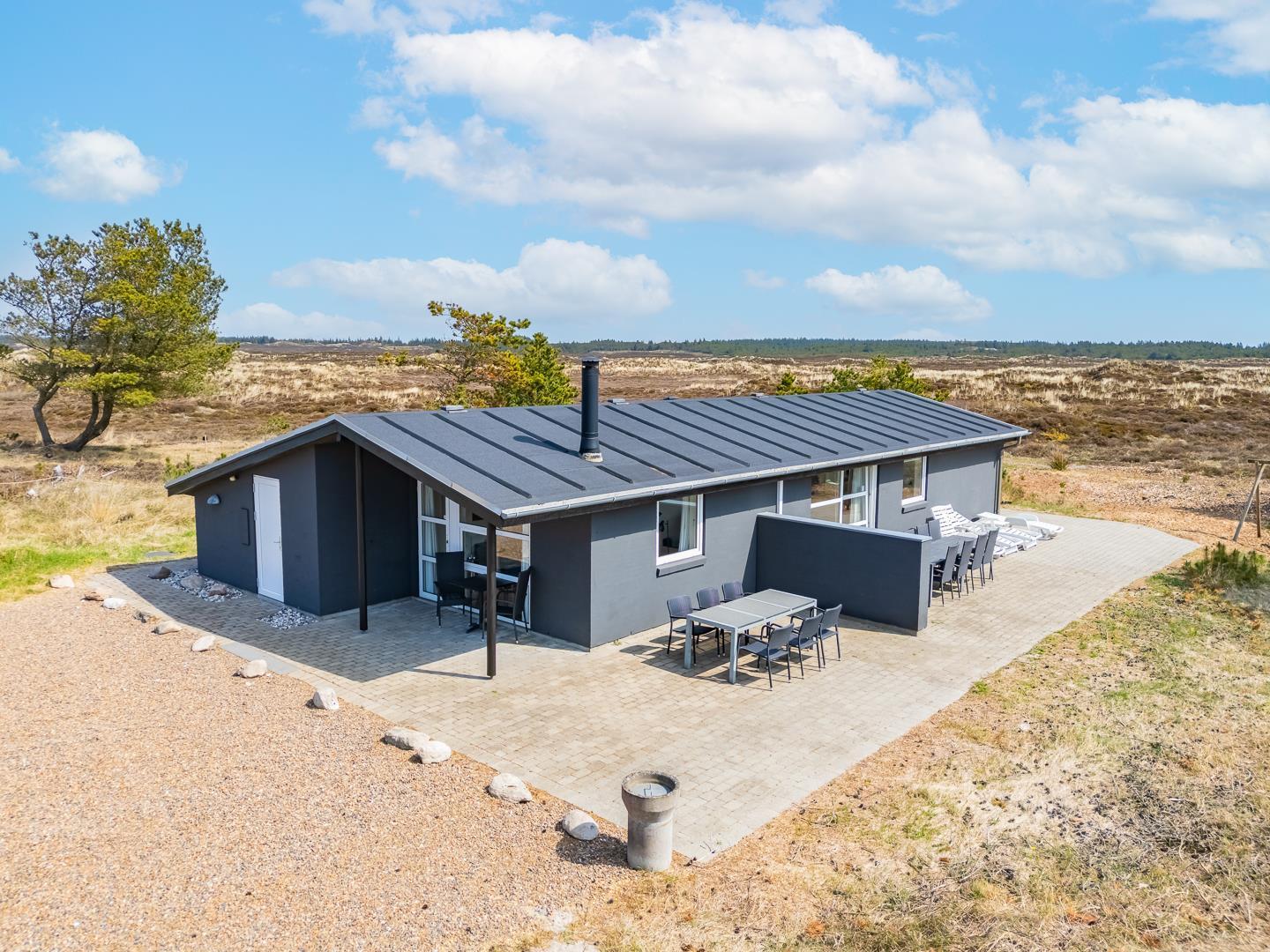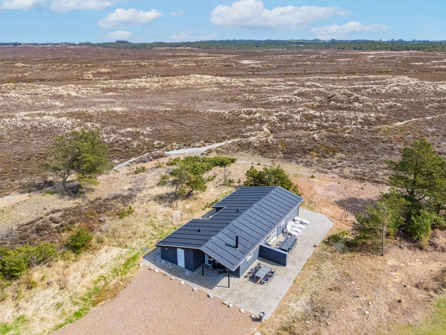 Feriehuset er indrettet med en stor, lys stue med komfortable møbler, et veludstyret køkken med direkte udgang til en skøn terrasse med udsigt over heden, samt en værelsesafdeling tæt på det lille badeværelse. Derudover byder huset på et stort badeværelse med sauna og en rummelig spa – perfekt til afslapning efter en dag i den friske luft.