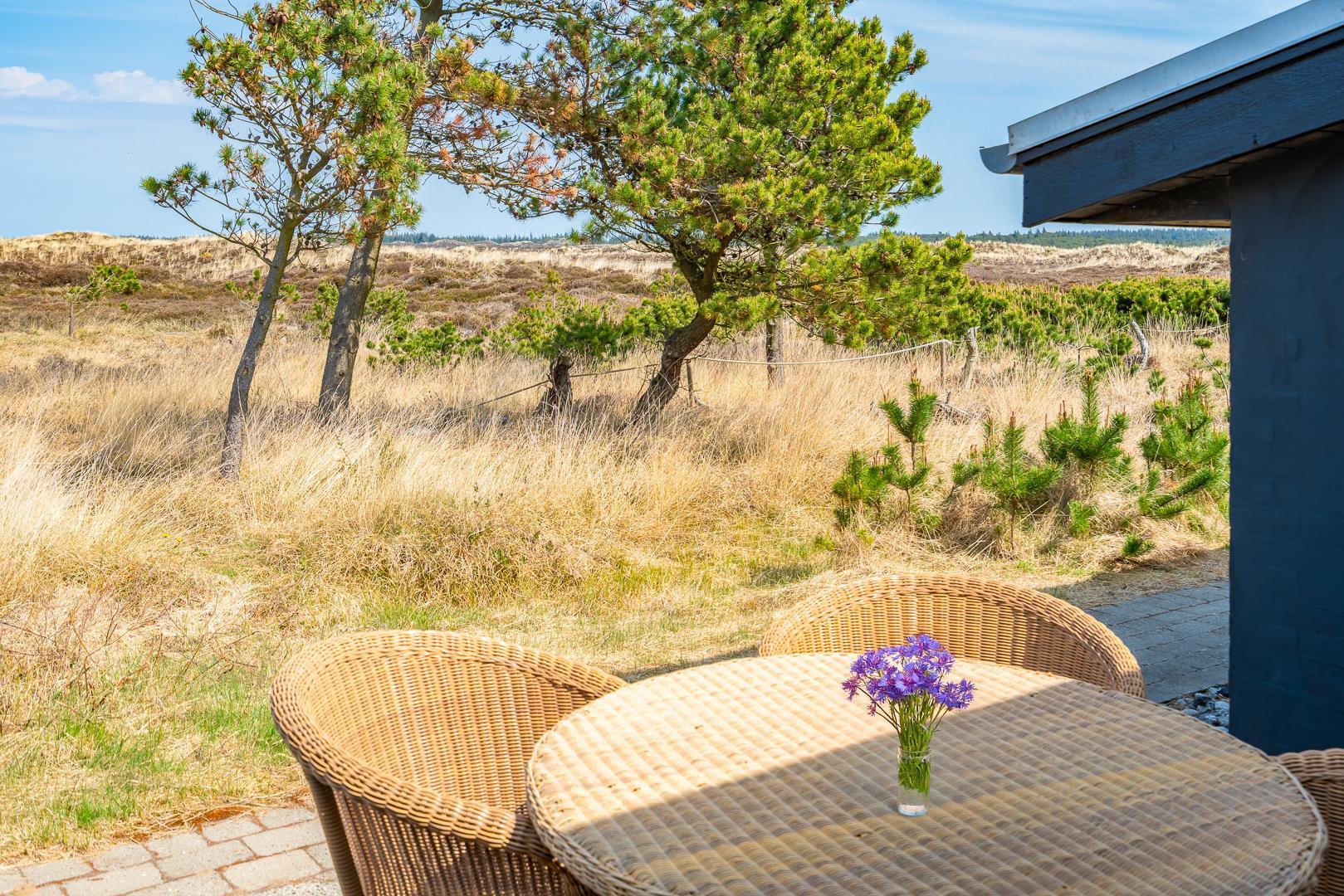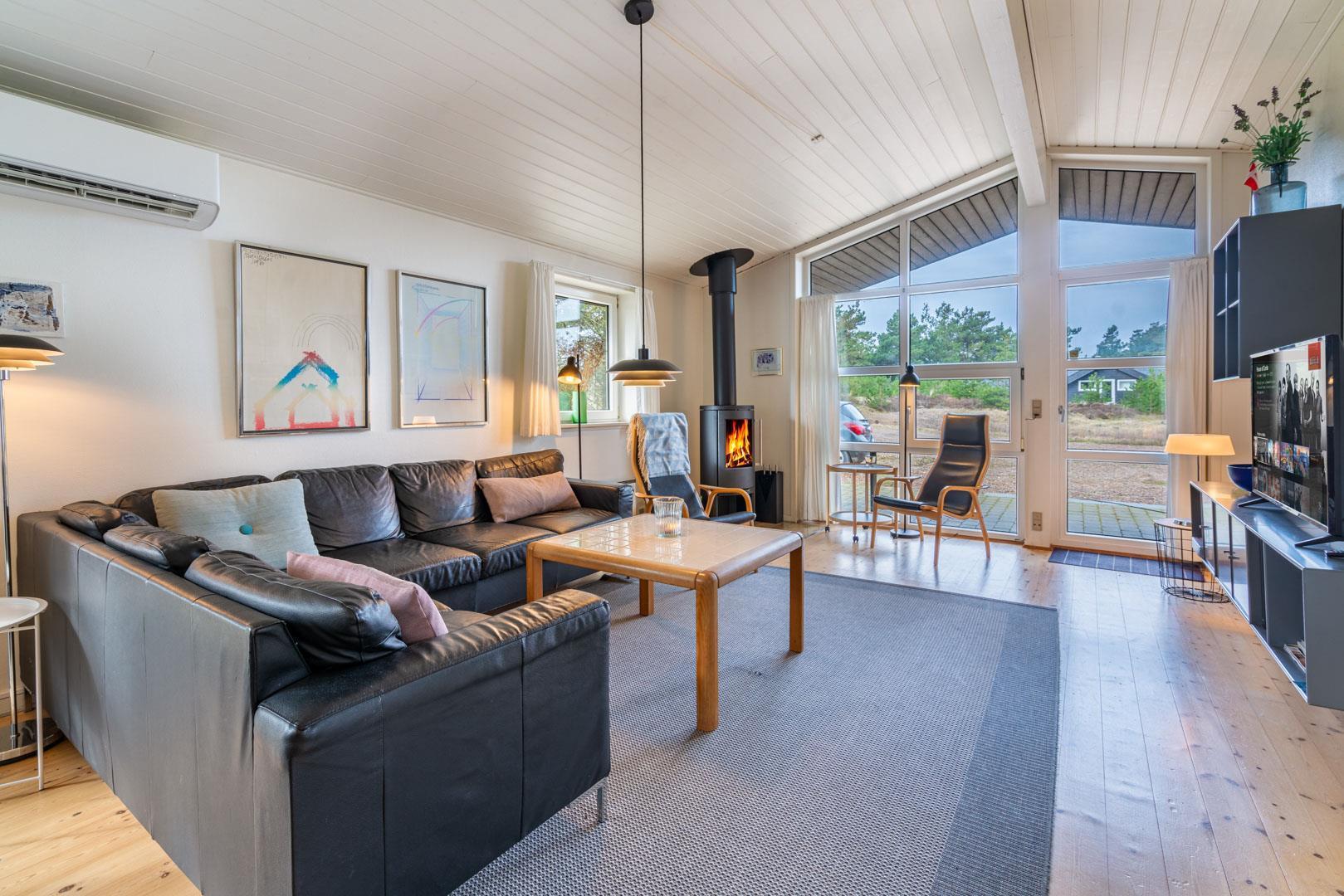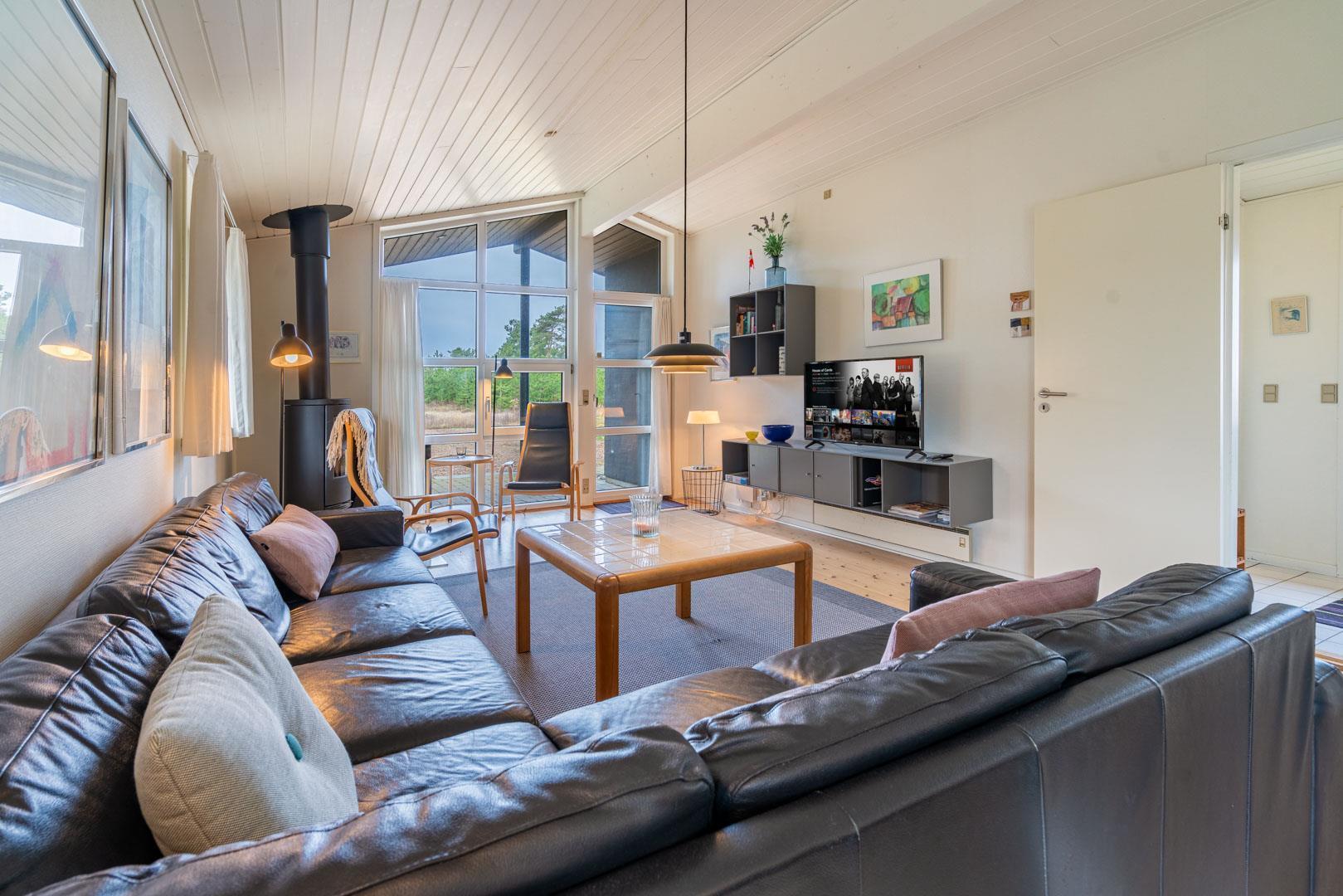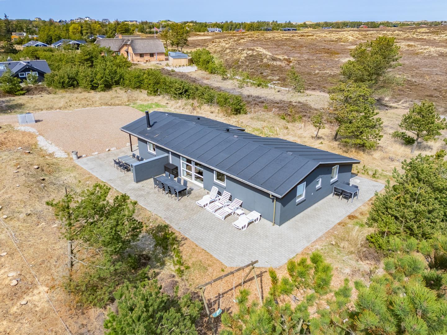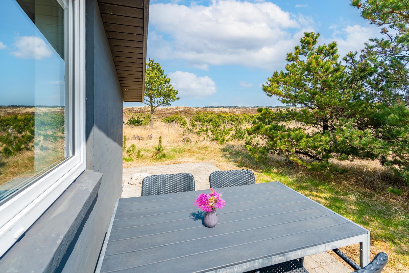 Feriehuset er indrettet med en stor, lys stue med komfortable møbler, et veludstyret køkken med direkte udgang til en skøn terrasse med udsigt over heden, samt en værelsesafdeling tæt på det lille badeværelse. Derudover byder huset på et stort badeværelse med sauna og en rummelig spa – perfekt til afslapning efter en dag i den friske luft.