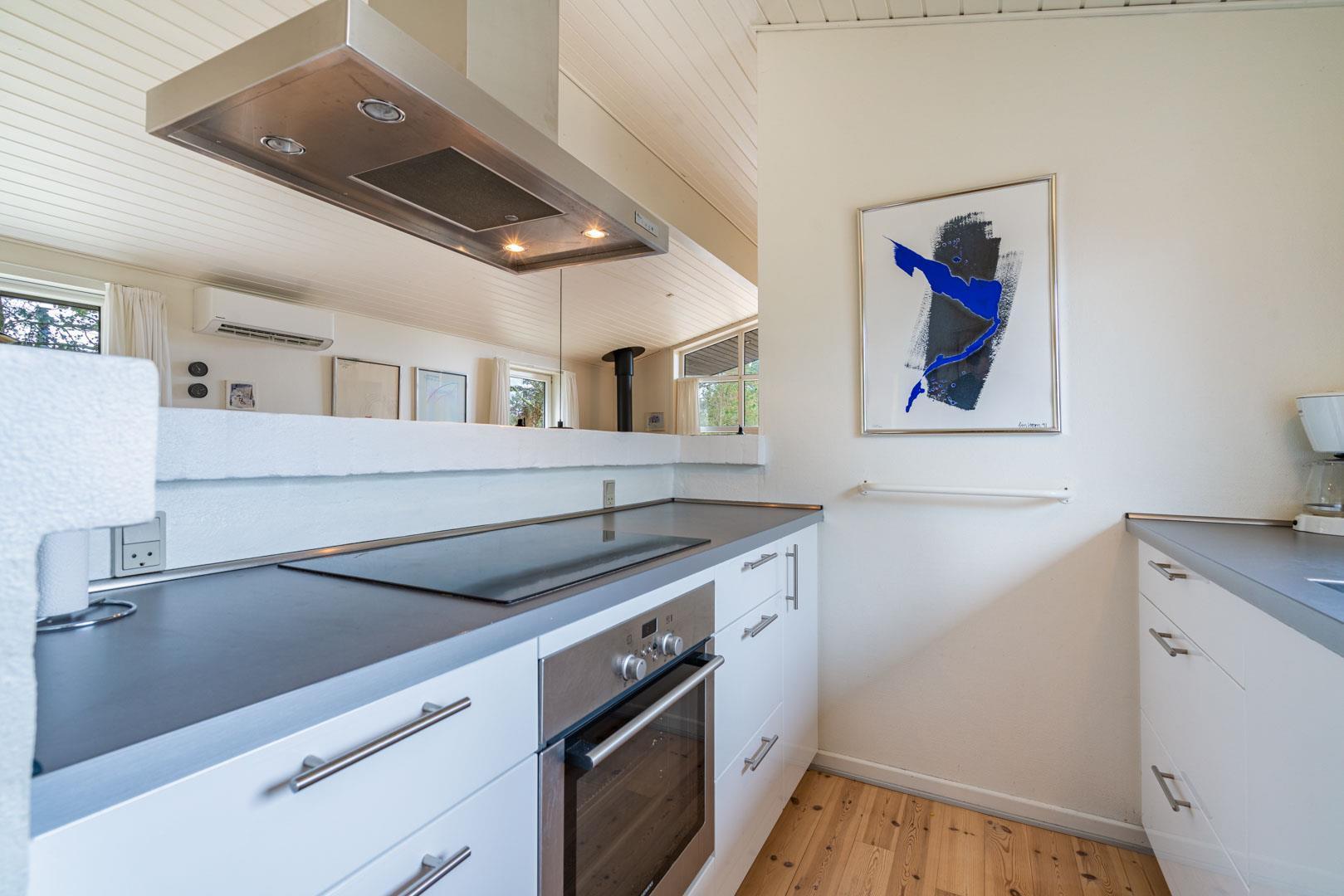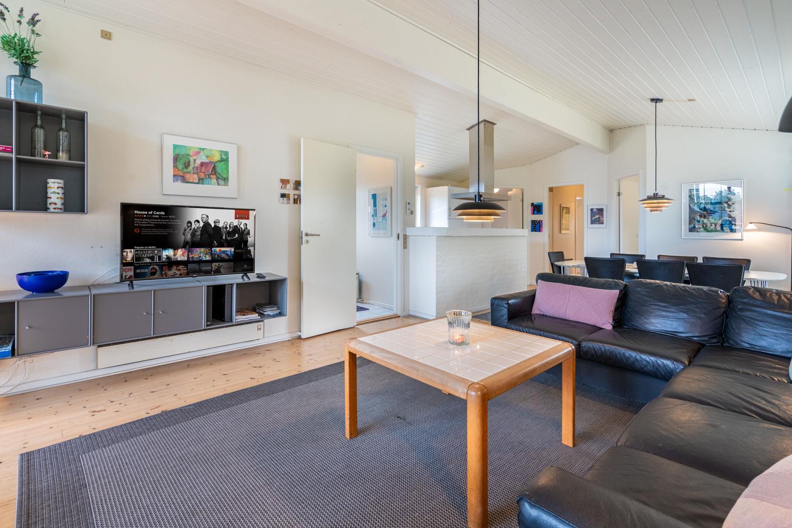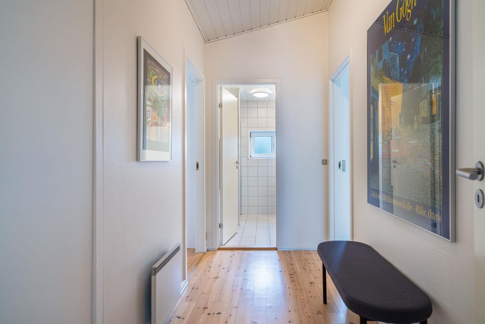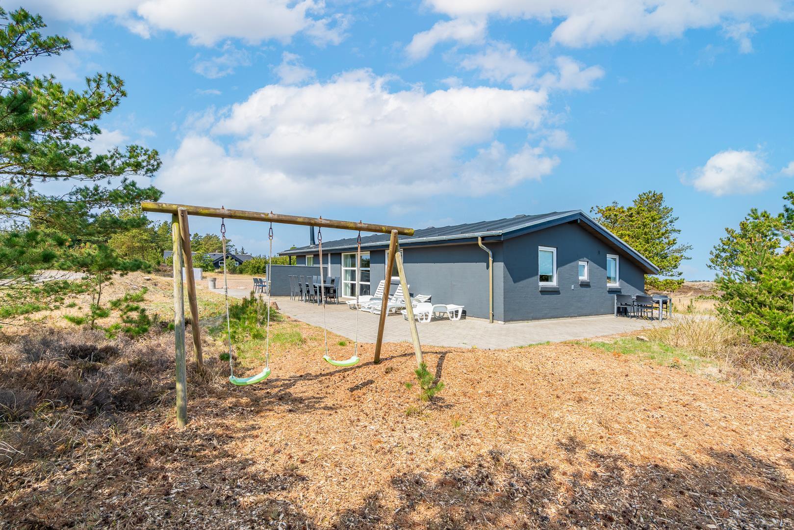 Feriehuset er indrettet med en stor, lys stue med komfortable møbler, et veludstyret køkken med direkte udgang til en skøn terrasse med udsigt over heden, samt en værelsesafdeling tæt på det lille badeværelse. Derudover byder huset på et stort badeværelse med sauna og en rummelig spa – perfekt til afslapning efter en dag i den friske luft.