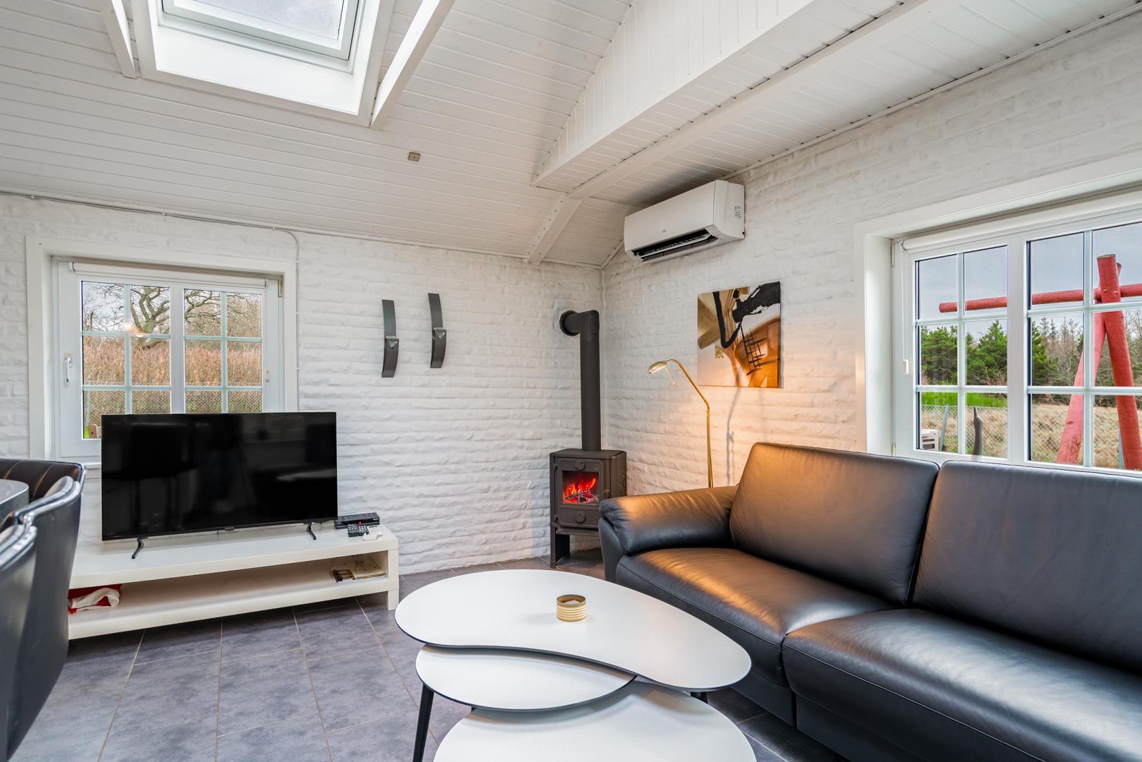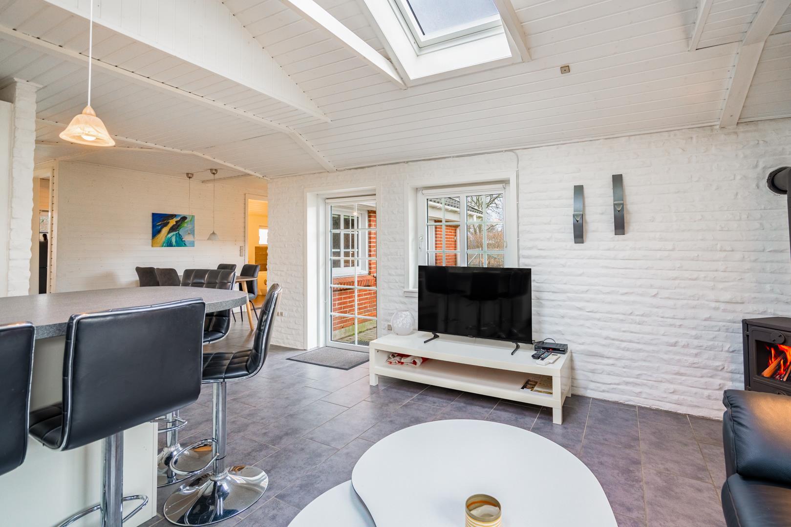 Der helle Wohnbereich mit Kamin sorgt zu jeder Jahreszeit für echte Ferienhaus-Atmosphäre. Besonders an kühleren Tagen ist ein Abend am knisternden Feuer ein Highlight. Zusätzlich verfügt das Ferienhaus über eine energiesparende Wärmepumpe.