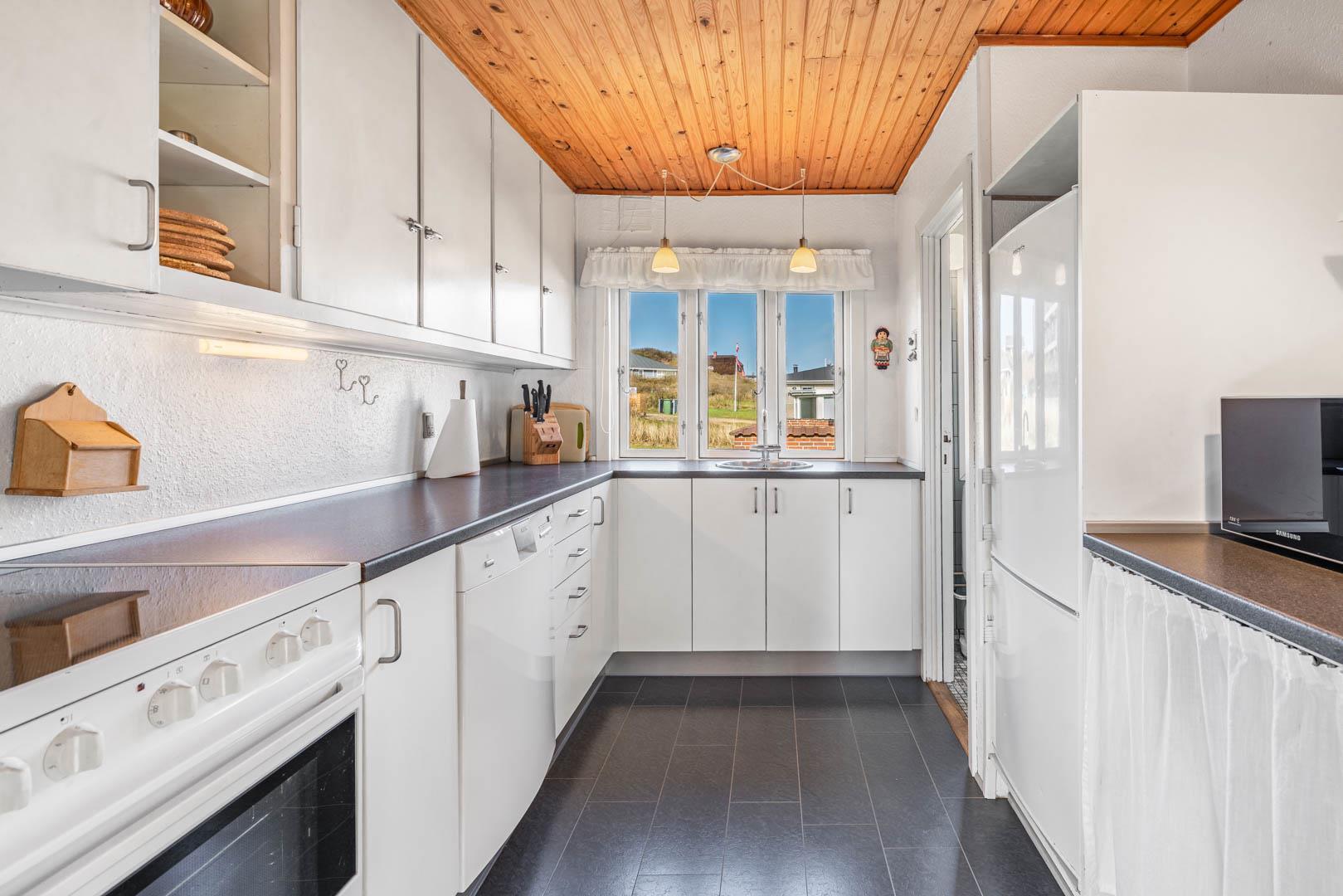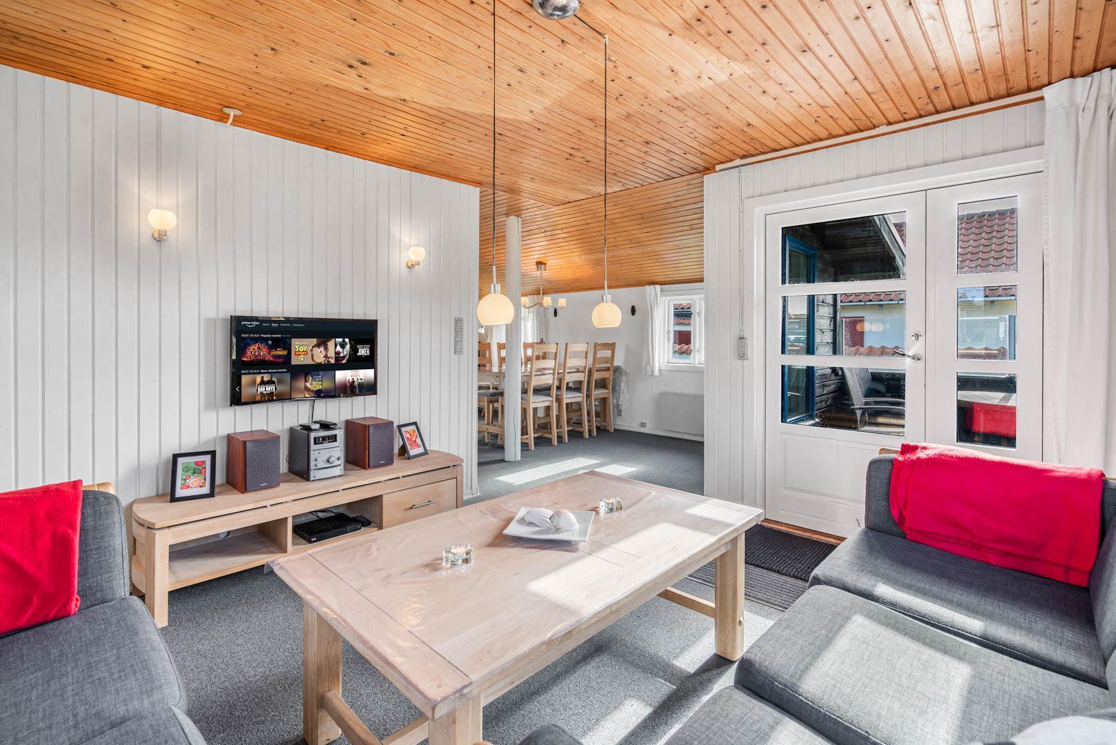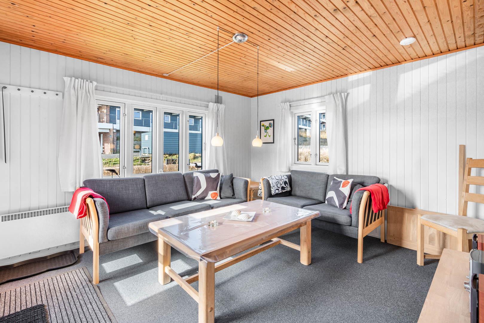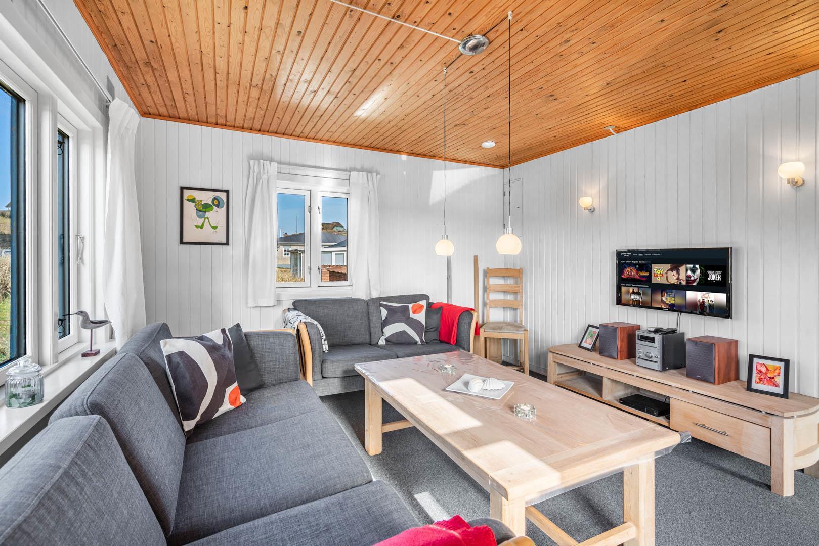 Indenfor finder du et veludstyret køkken med alt, hvad du har brug for til madlavning i ferien, samt en hyggelig stue med komfortable møbler, hvor hele familien kan samles.