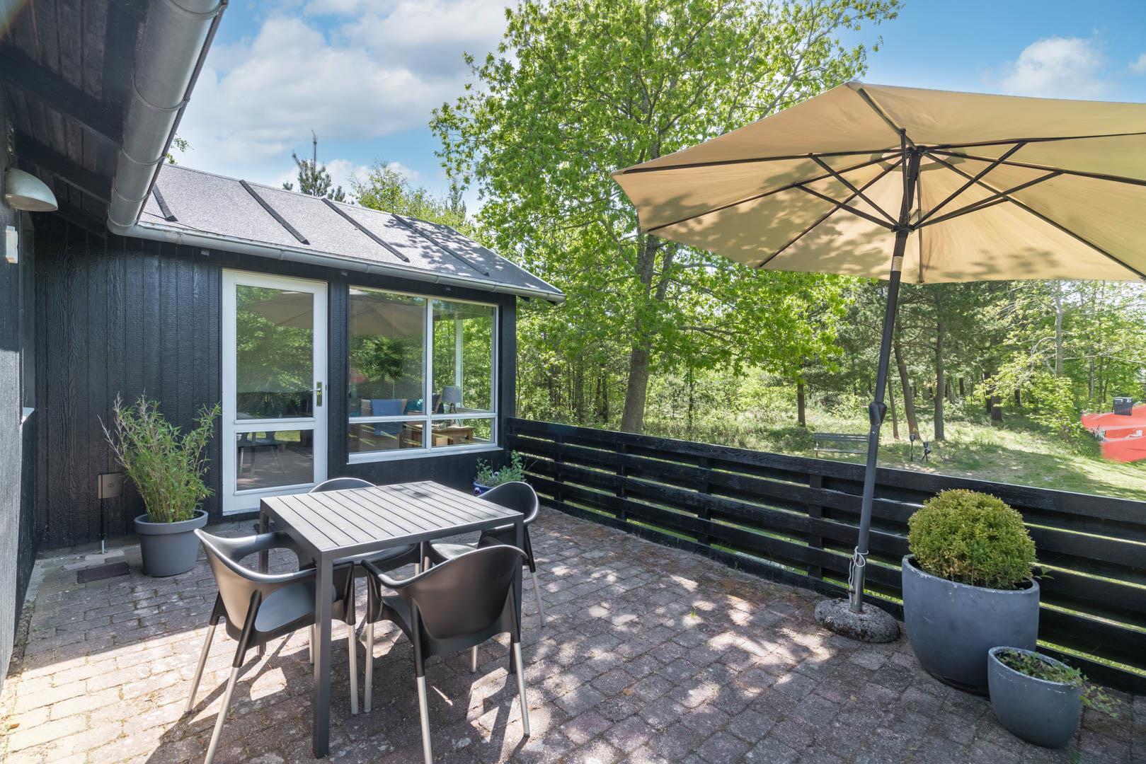 Charmerende sommerhus i Henne Strand med pejs, flere terrasser og petanquebane på stor naturgrund.