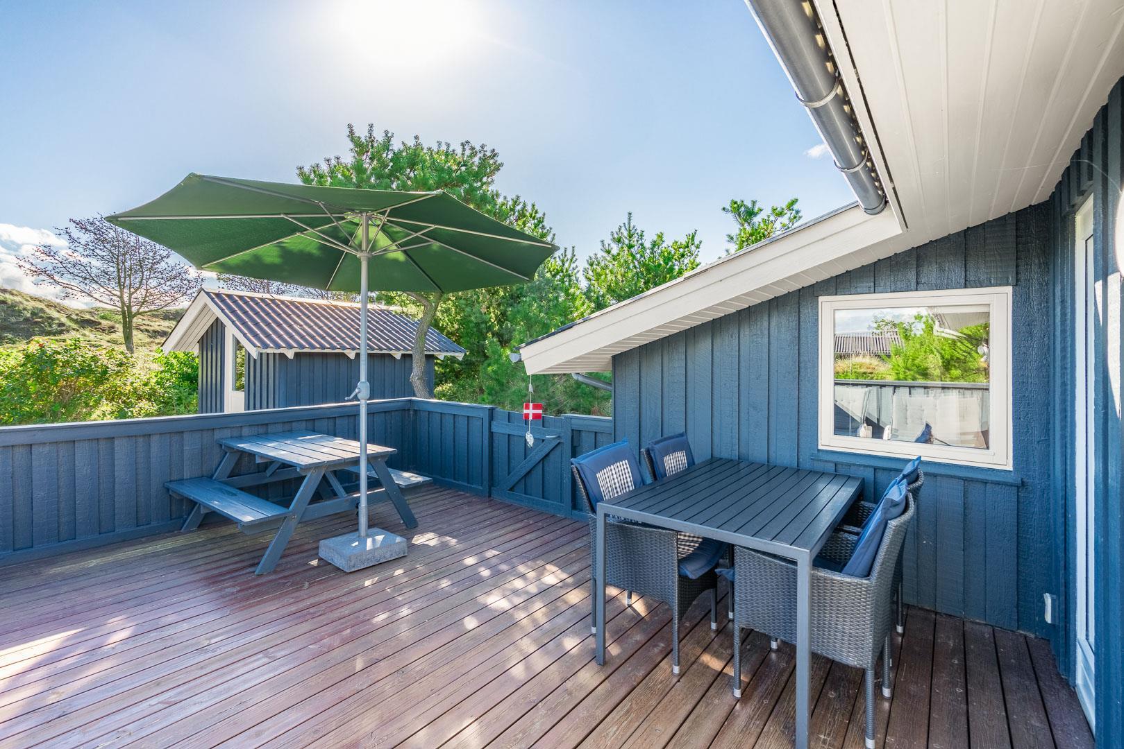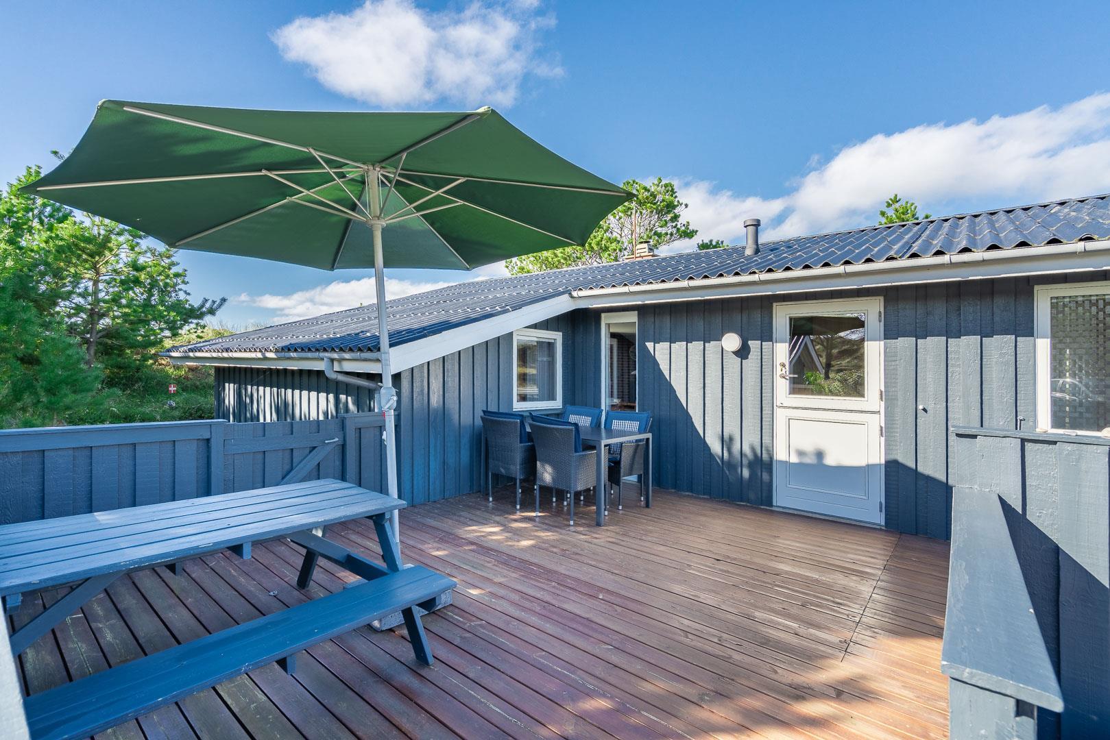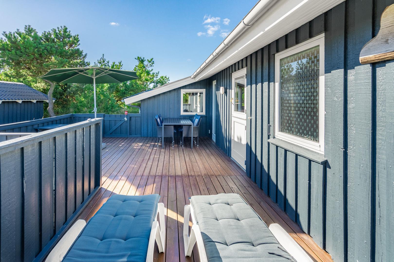 Hyggeligt og velholdt feriehus i Henne Strand med stor lukket terrasse, nyt køkken og børnevenlige faciliteter.