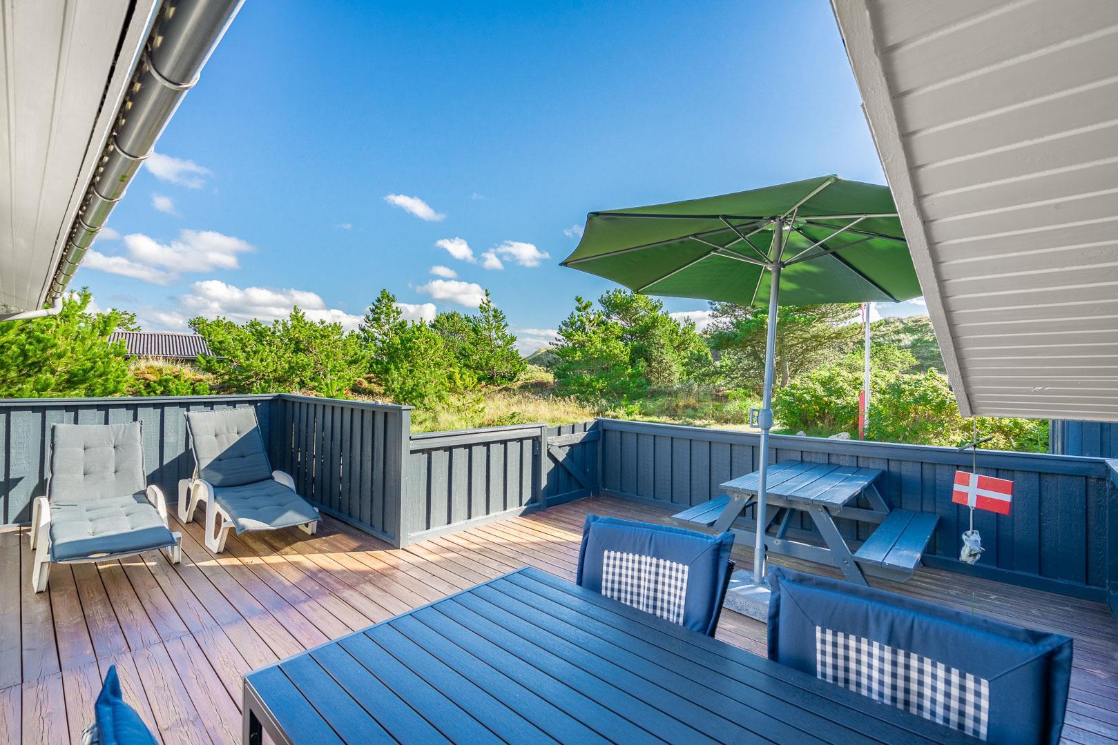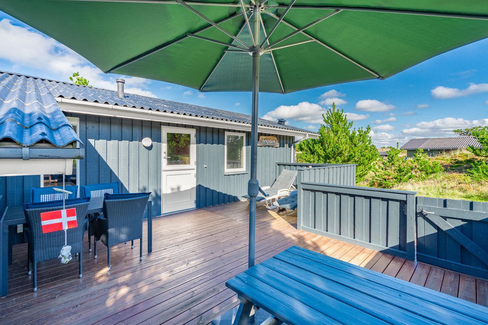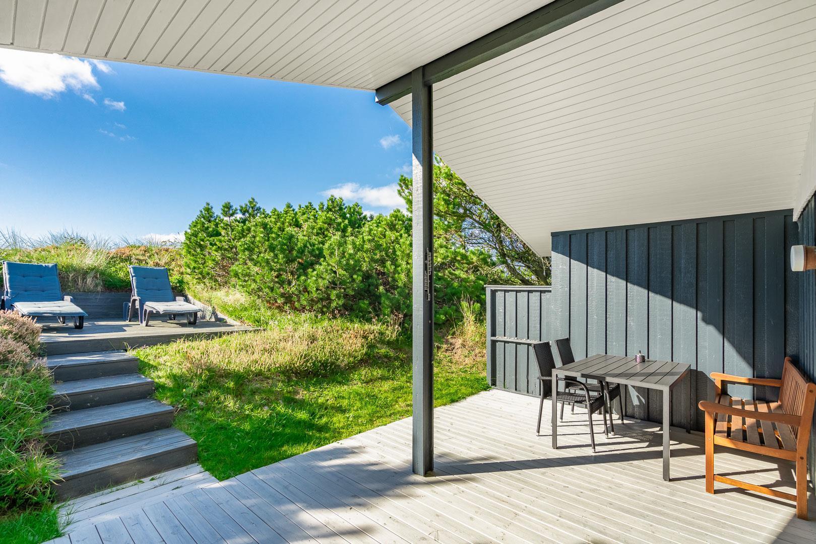 Hyggeligt og velholdt feriehus i Henne Strand med stor lukket terrasse, nyt køkken og børnevenlige faciliteter.