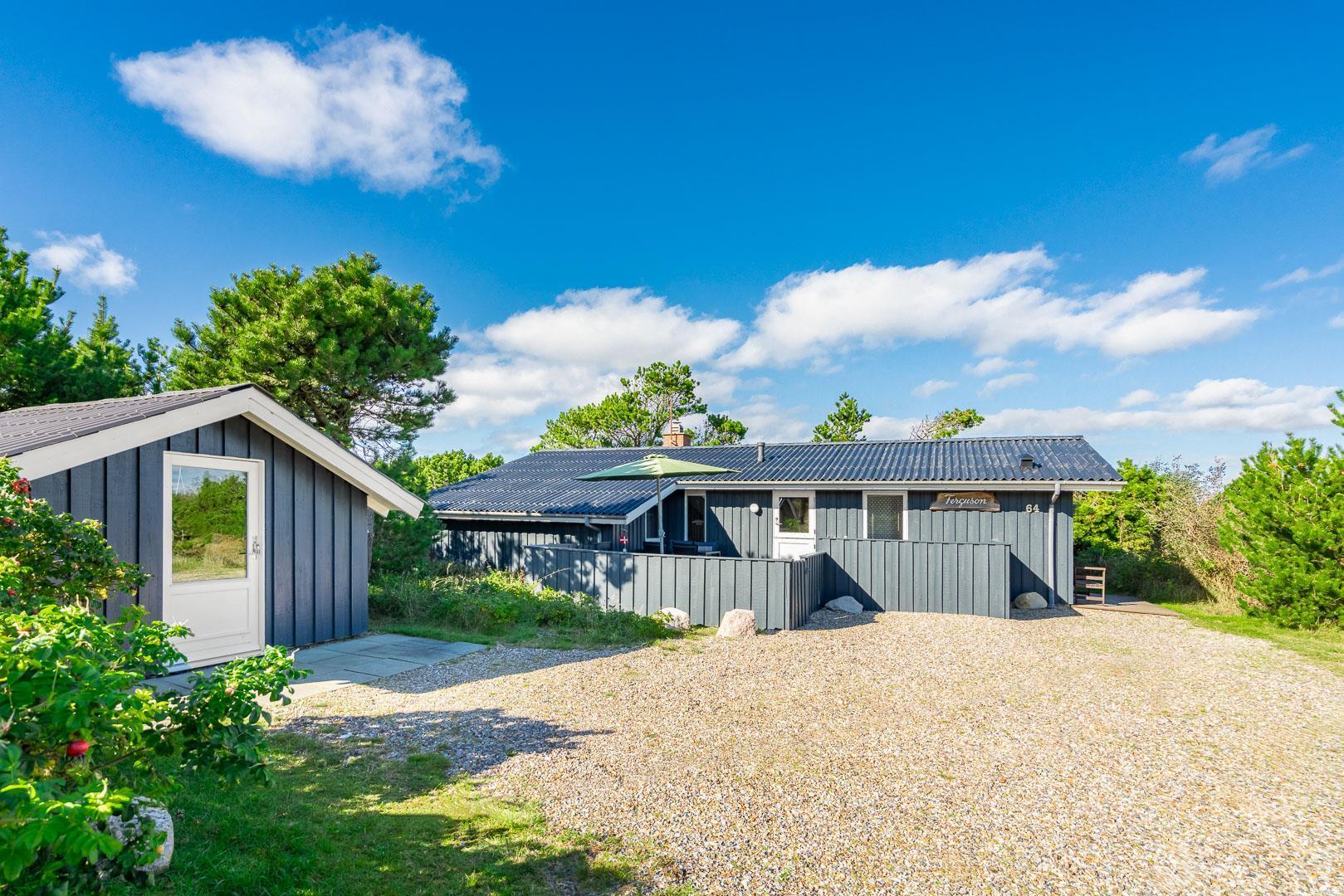 I rolige omgivelser på en flot og kuperet naturgrund ligger dette meget velholdte og løbende renoverede feriehus. Til huset hører stor, lukket samt en mindre overdækket terrasse. Flot nyere badeværelse. Det nye køkken (2025) er kombineret med stuen. Den hyggelige opholdsstue er indrettet med gode møbler. 3 værelser 2 med dobbeltseng og 1 med 2 enkeltsenge. Til børnene findes der barneseng og høj barnestol samt gynge på grunden. Skur til bl.a. cykler.