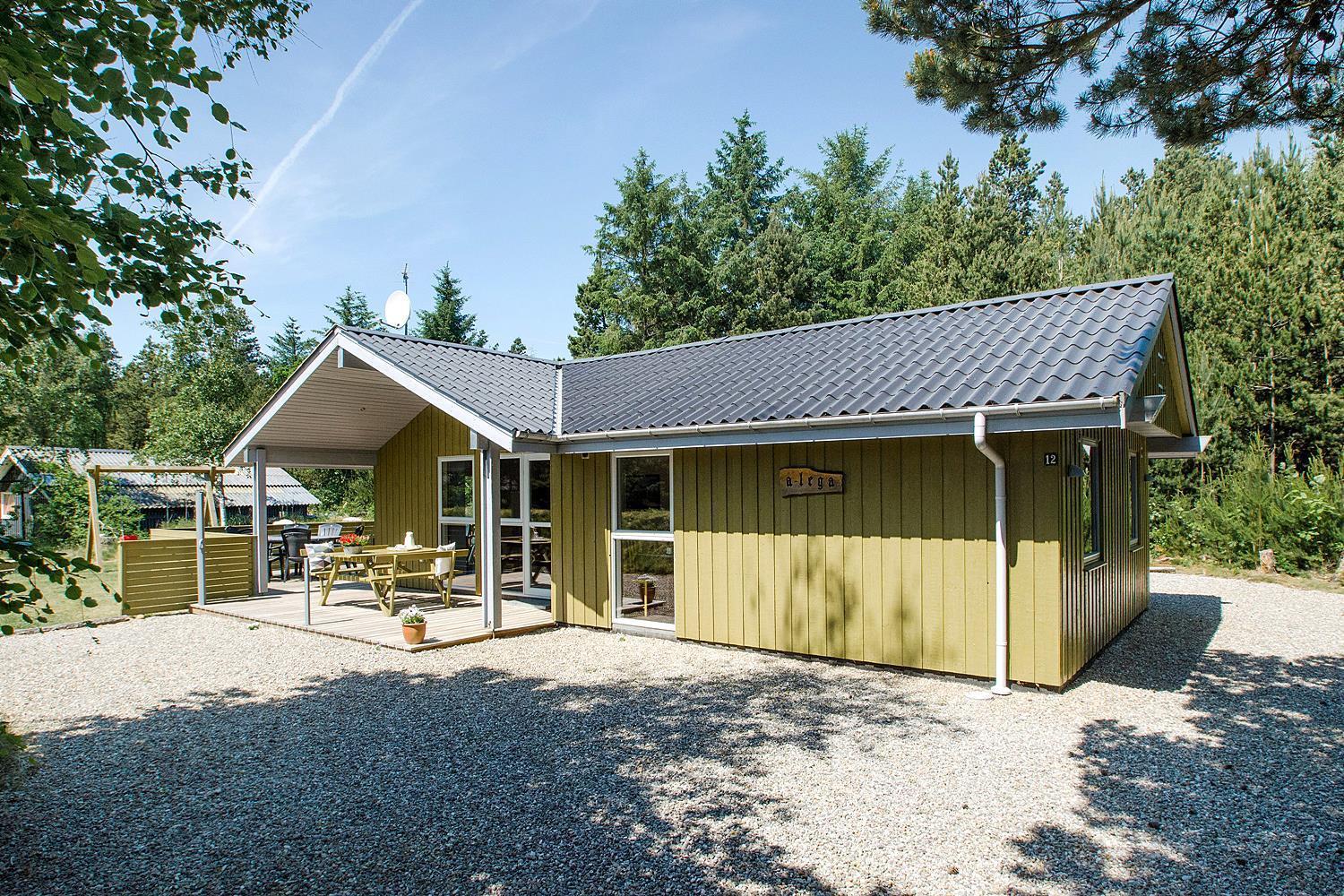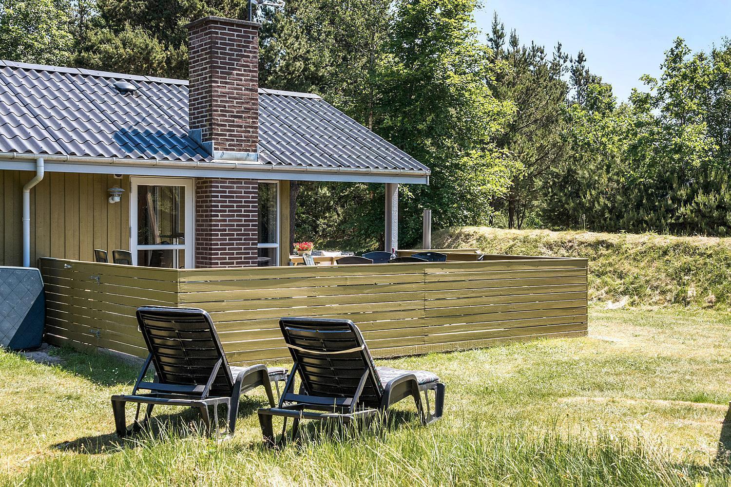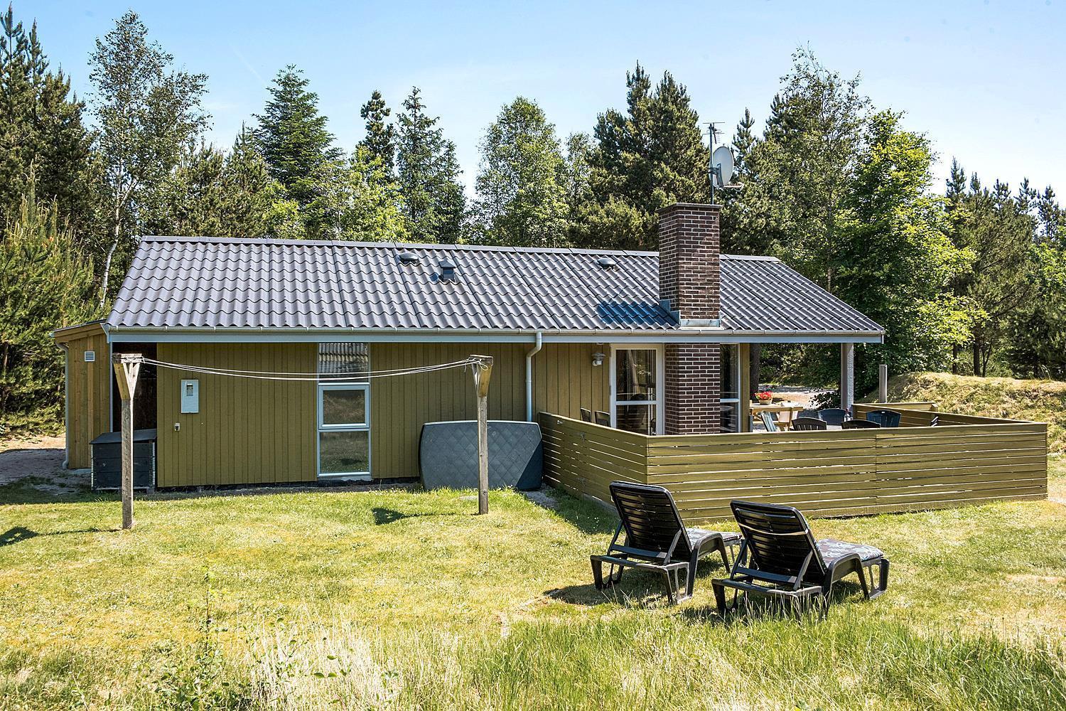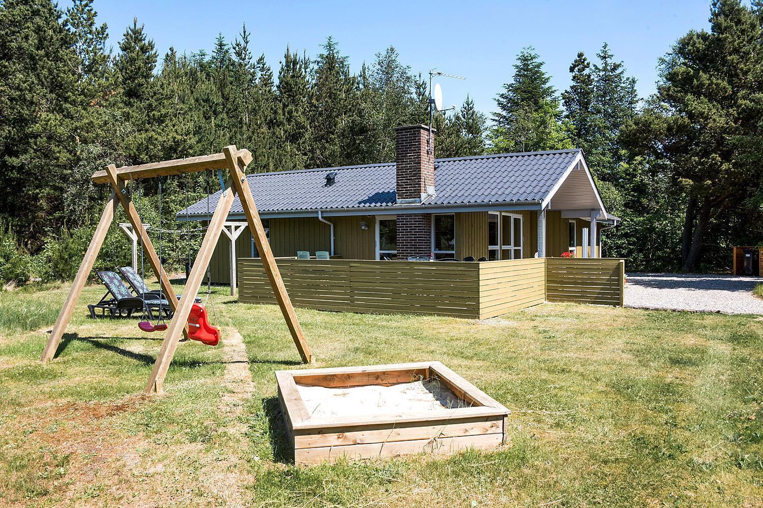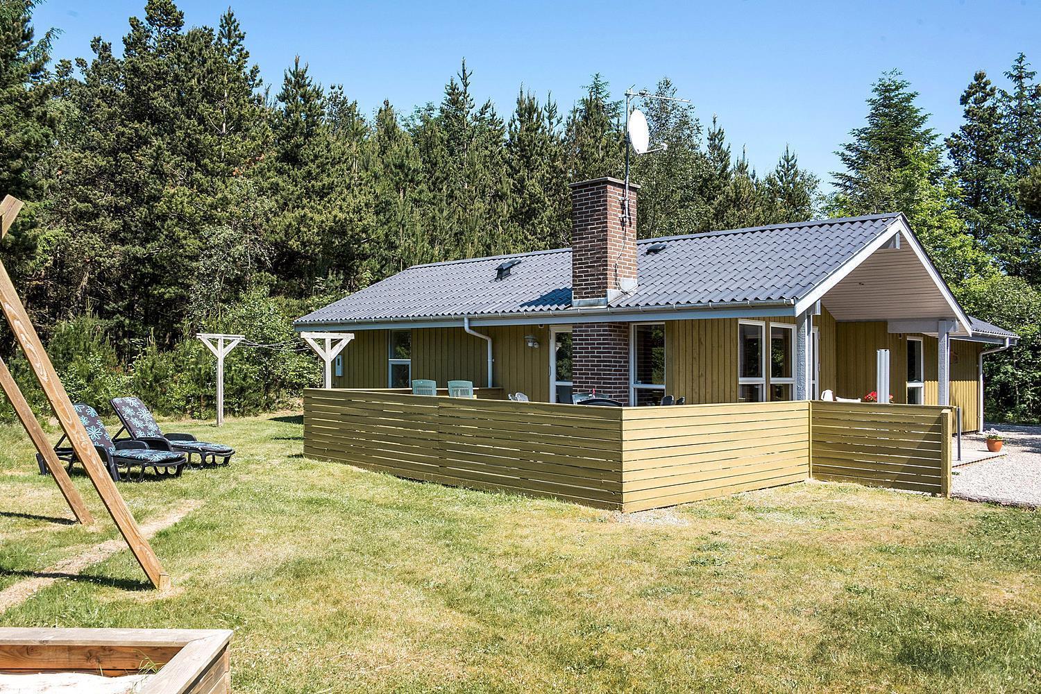 Hyggeligt feriehus i Henne Strand med brændeovn, sauna og stor naturgrund med aktiviteter for børn.