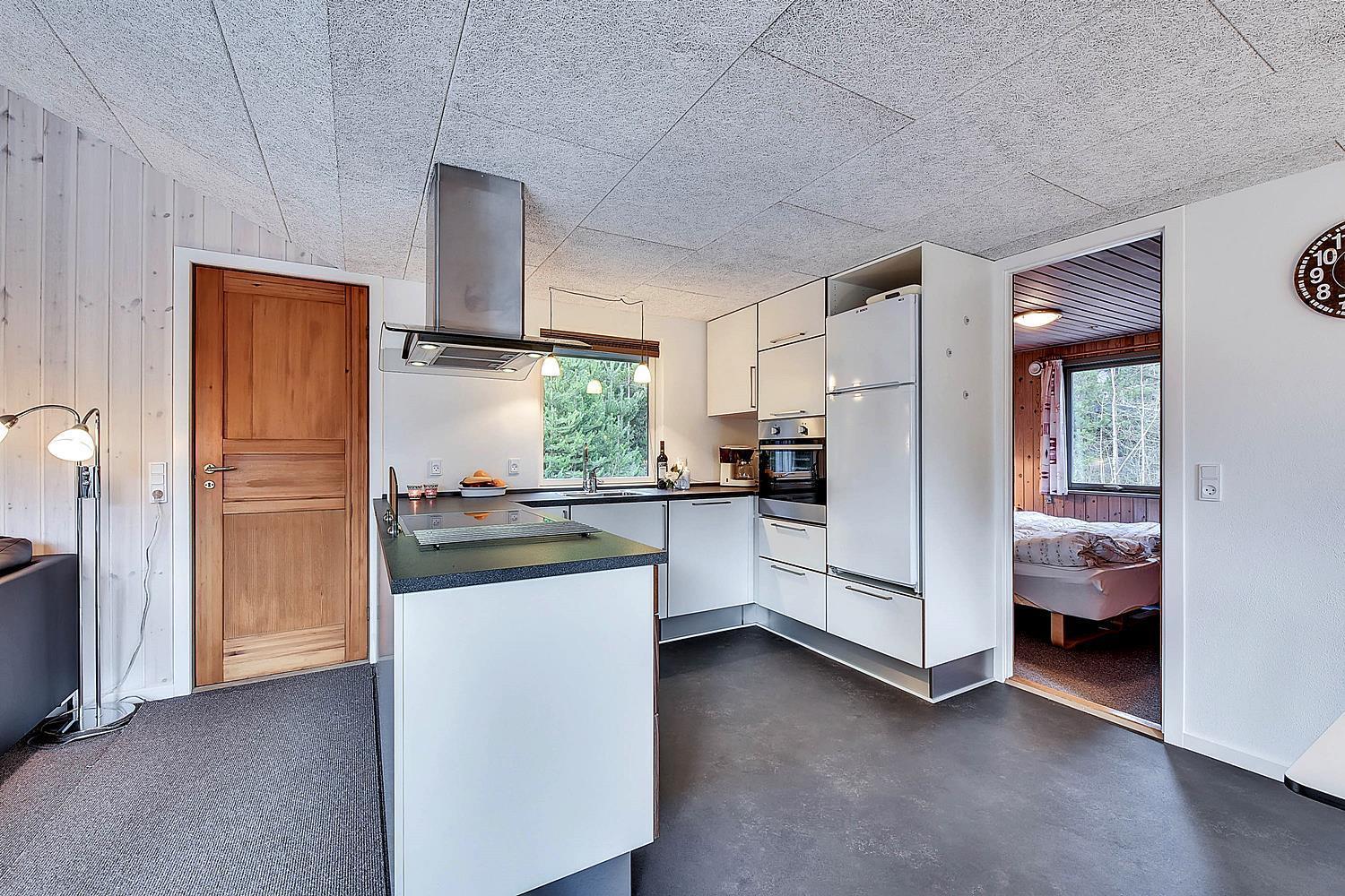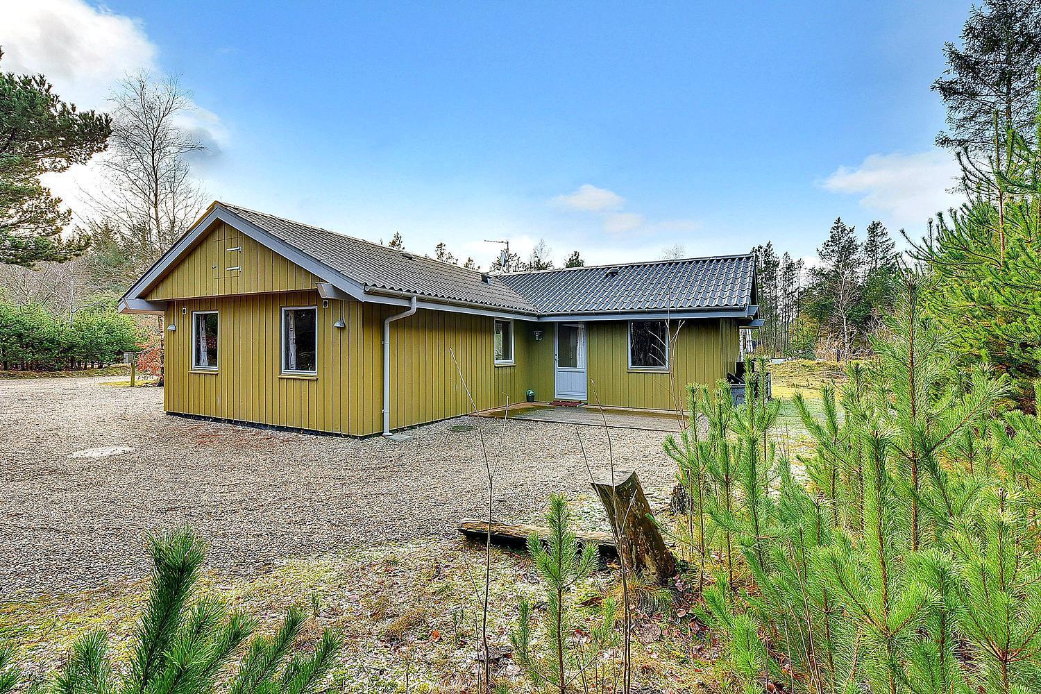 På ugeneret grund, delvis omkranset af træer, ligger dette velholdte og hyggelige feriehus. Feriehuset har nyere køkken/alrum og i husets stue med loft til kip er der opsat brændeovn. Feriehuset indeholder nyere og flot badeværelse. Stue og køkken ligger i åben forbindelse med hinanden. Veludstyret køkken. 3 gode og rummelige soverum. Fra stuen er der udgang til dejlig læ fyldt og delvis indhegnet terrasse. På den store naturgrund er der opsat flere aktiviteter for de mindste, bl.a. trampolin, gynger samt sandkasse.