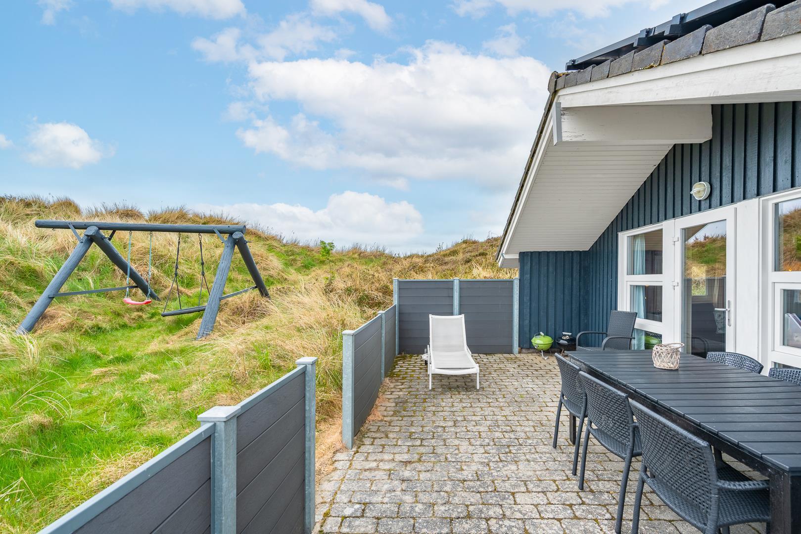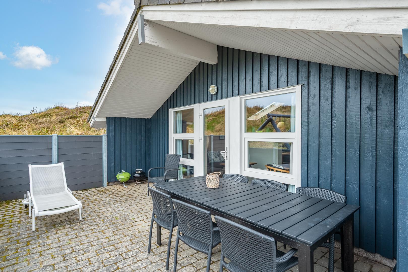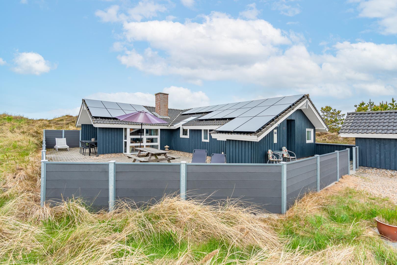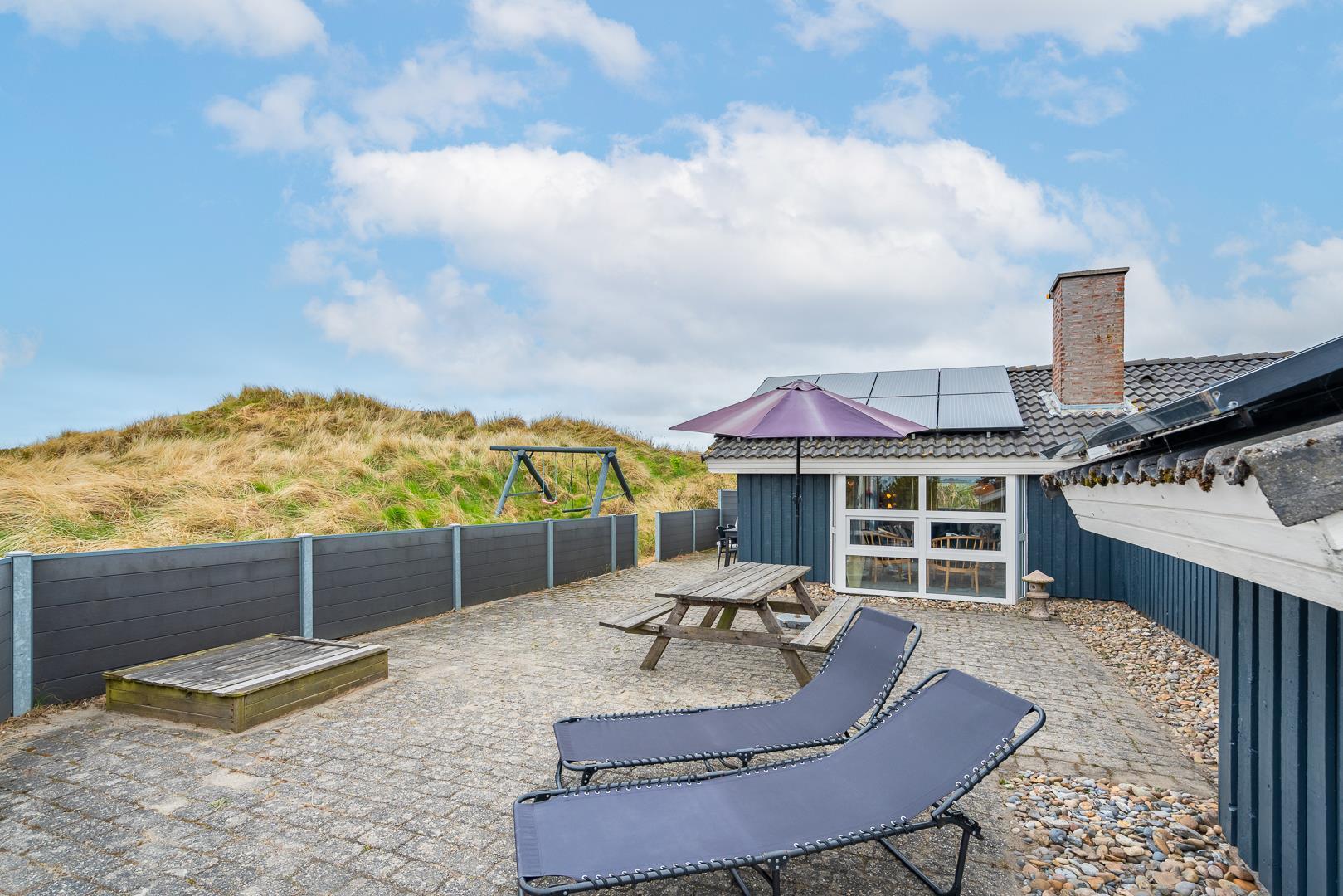 Hyggeligt feriehus med sauna, spa og stor sydvendt terrasse nær Henne Strand.