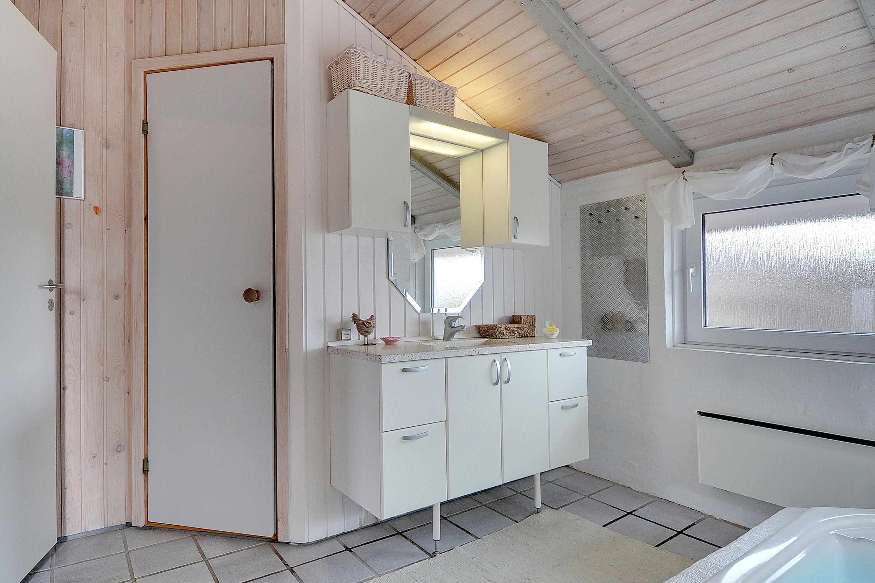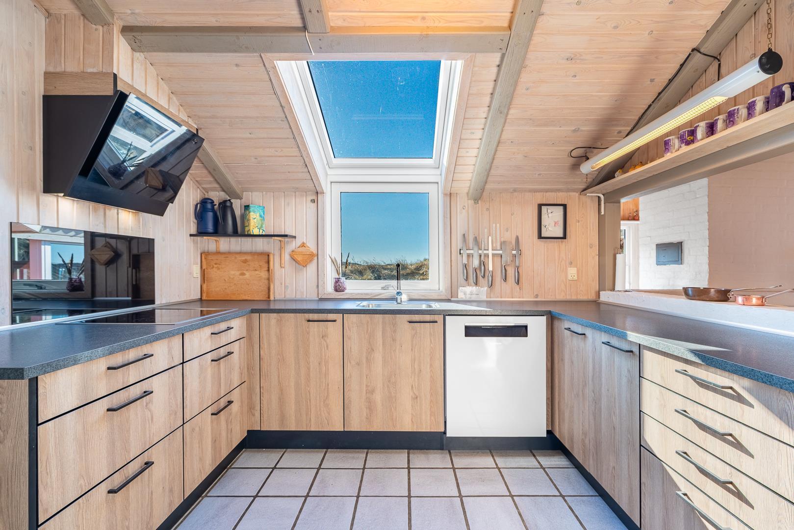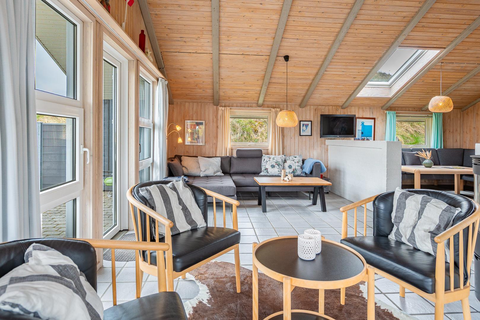 Hyggeligt højtbeliggende feriehus med flot udsigt over sommerhusområdet. Til huset hører en stor dejlig sydvendt terrasse. Dejligt køkken med god bordplads i åben forbindelse til spiseafdeling og opholdsafdeling med TV. 1 trin ned har man endnu en opholdsafdeling med stor brændeovn med glasrude så man kan se ilden fra hjørnesofaen. Desuden er der herfra udgang til terrassen. Huset rummer et stort badeværelse med stor 4 personers spa og sauna samt et ekstra toilet. Baggang med vaskemaskine og tørretumbler. Værdiboks.
