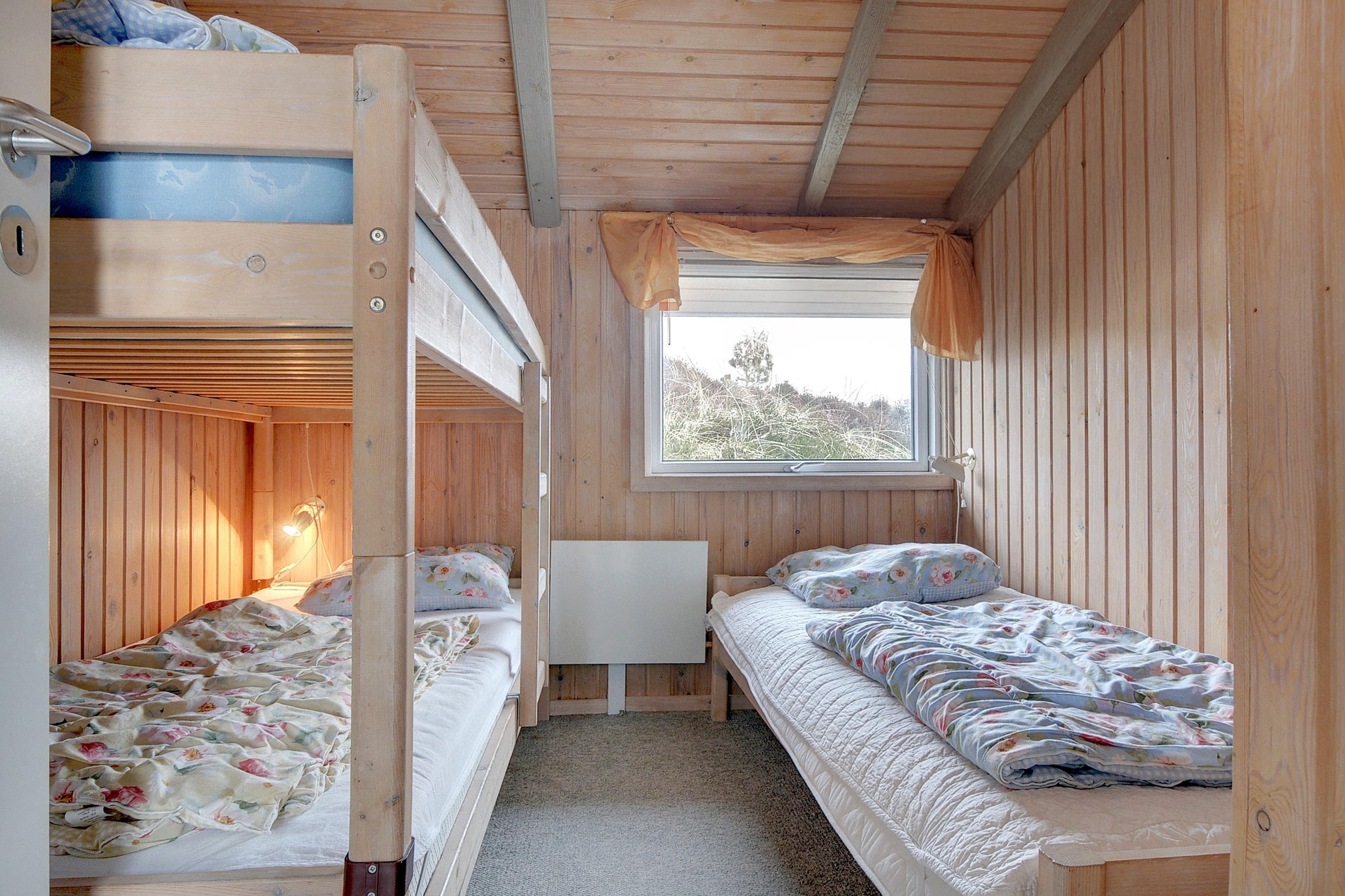 Sengestørrelse: 2 dobbeltsenge med 2 madrasser 90 x 200 cm + 1 enkeltseng 75 x 200 cm + 1 køjeseng 90 x 200 cm.