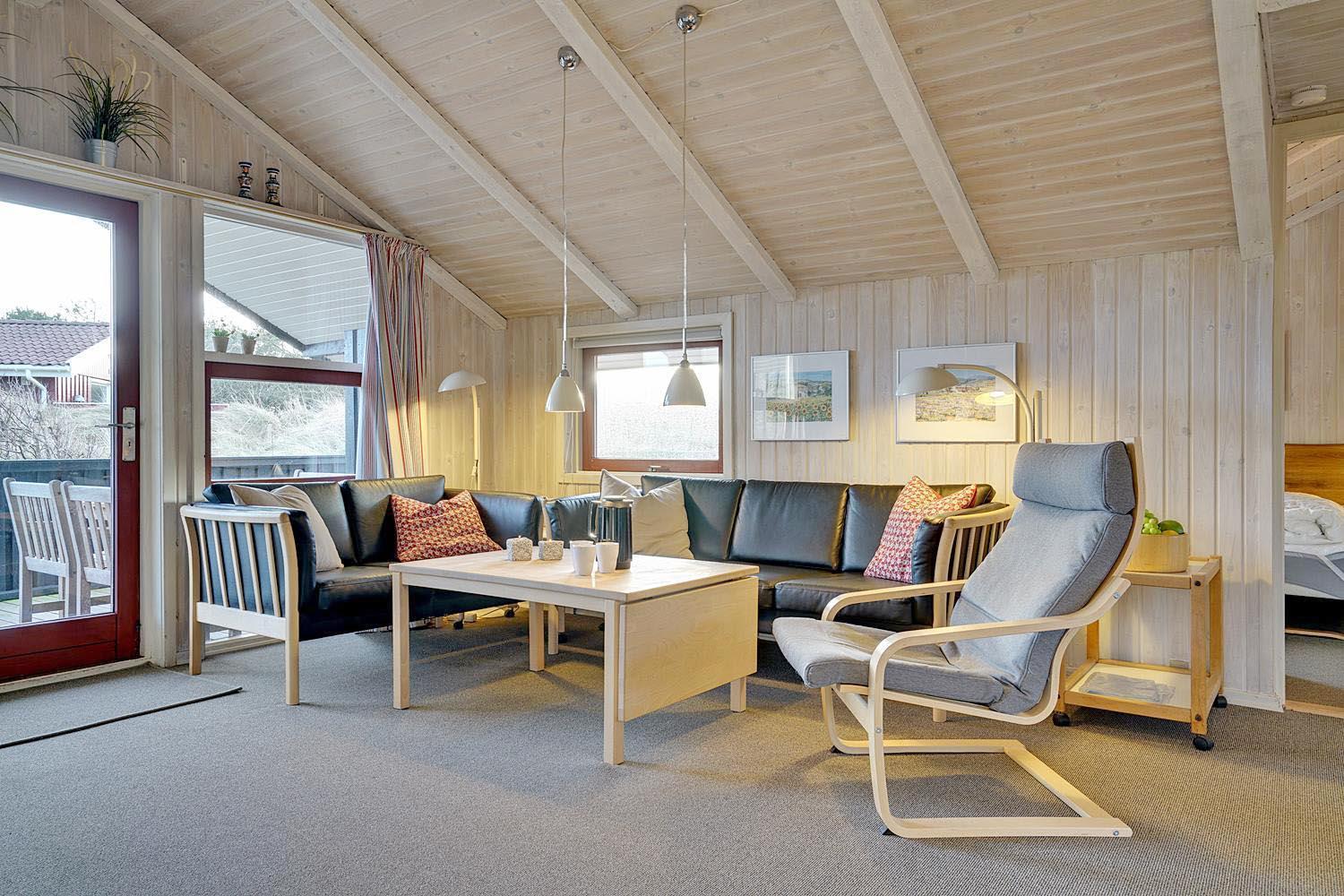 Huset byder på en lys og hyggelig stue med komfortable møbler og direkte adgang til terrassen.