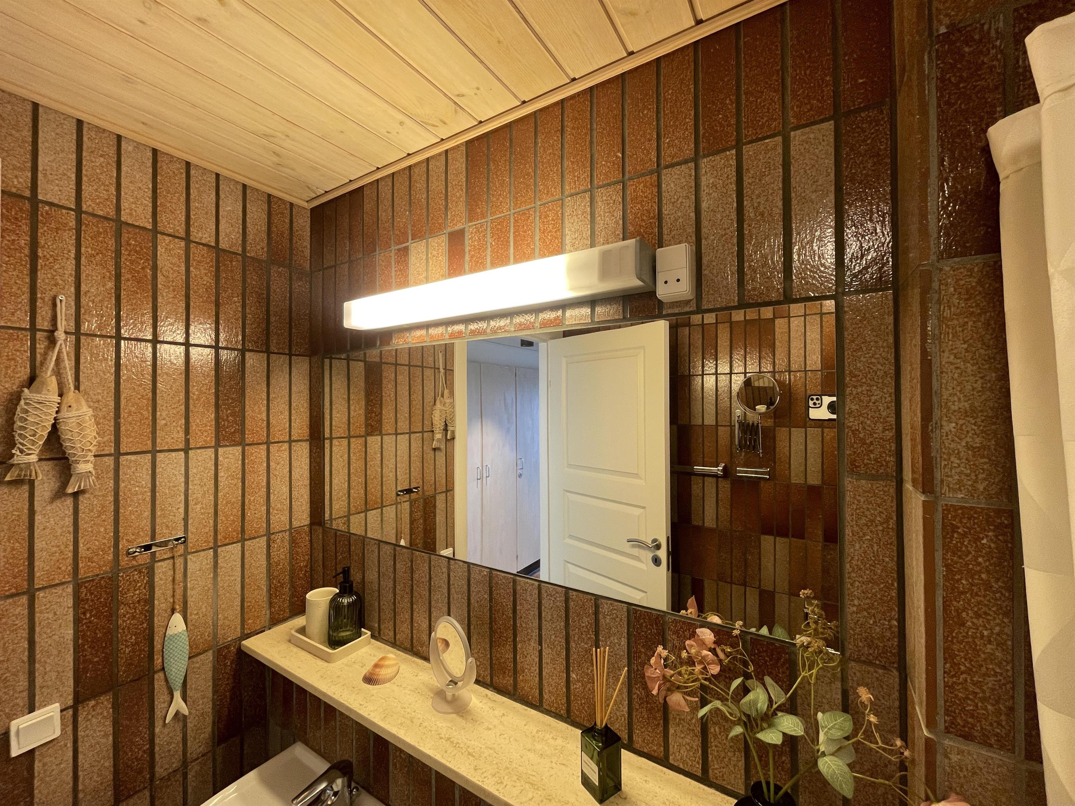 Badeværelset er udstyret med toilet, håndvask og badekar.