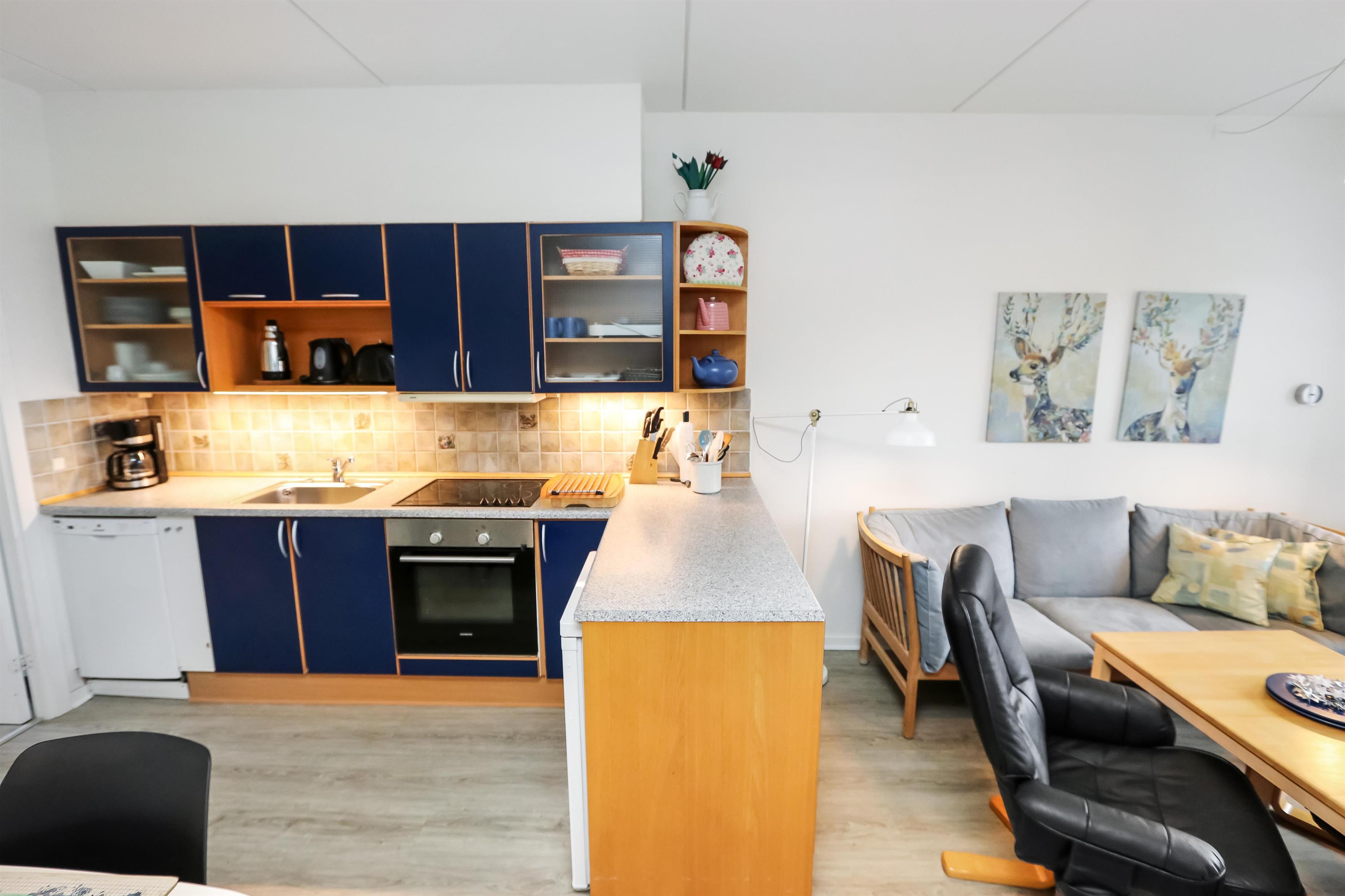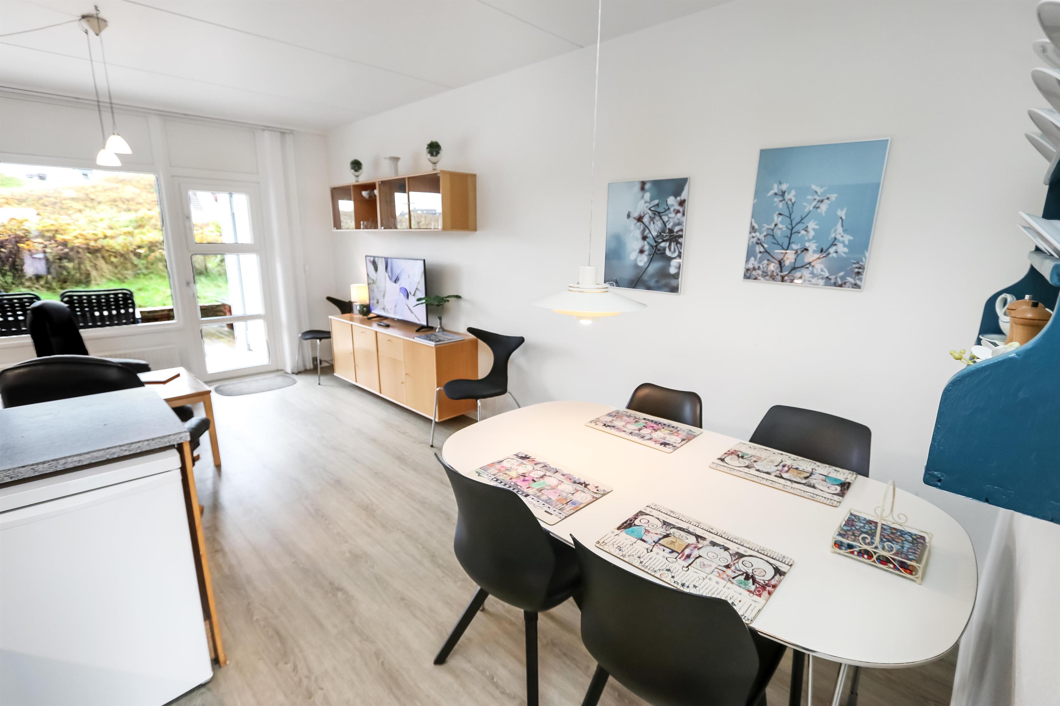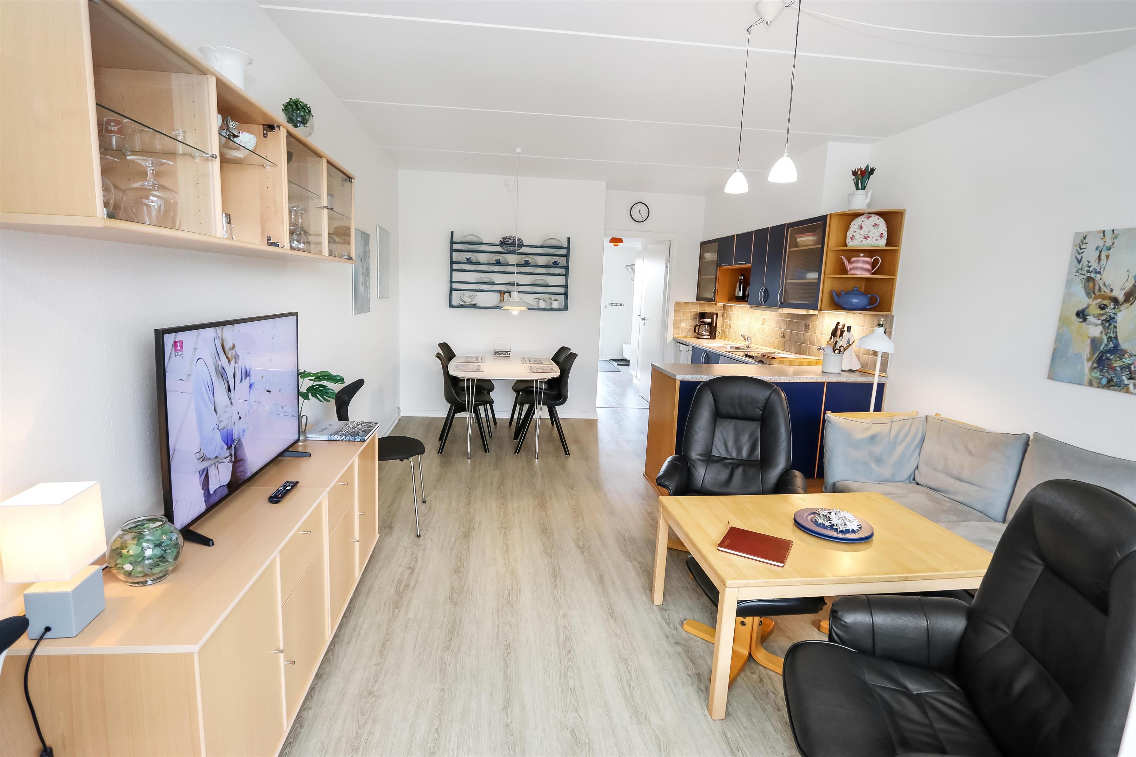 Rigtig pæn og fin lejlighed til 6 personer beliggende i stueplan. 2 Soverum: 1DS og pergogulv og 1 3/4 seng med 1 overkøje. Badeværelse med toilet, håndvask og bruser. Køkken med glaskeramisk komfur, køleskab med lille frostbox, opvaskemaskine, emhætte og linoleumsgulv. Stue med læder og polstermøbler, kabel-TV kun via streaming, DVD og linoliumsgulv. Sofa i stuen kan slåes ud til 2 sovepladser. Fra stuen er der udgang til lille delvis overdækket terrasse med havemøbler. Trappen til 1. sal består af 10 trappetrin.