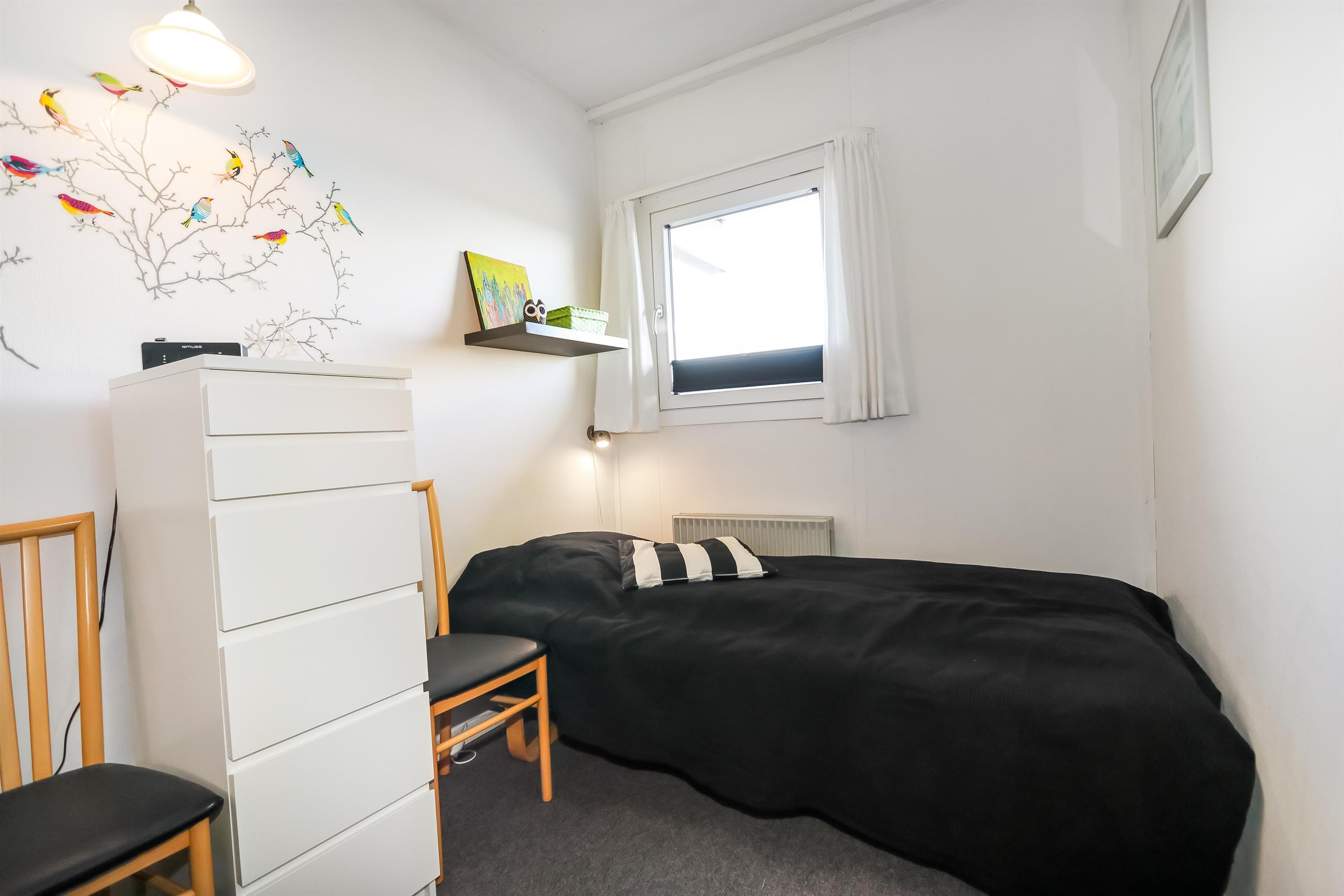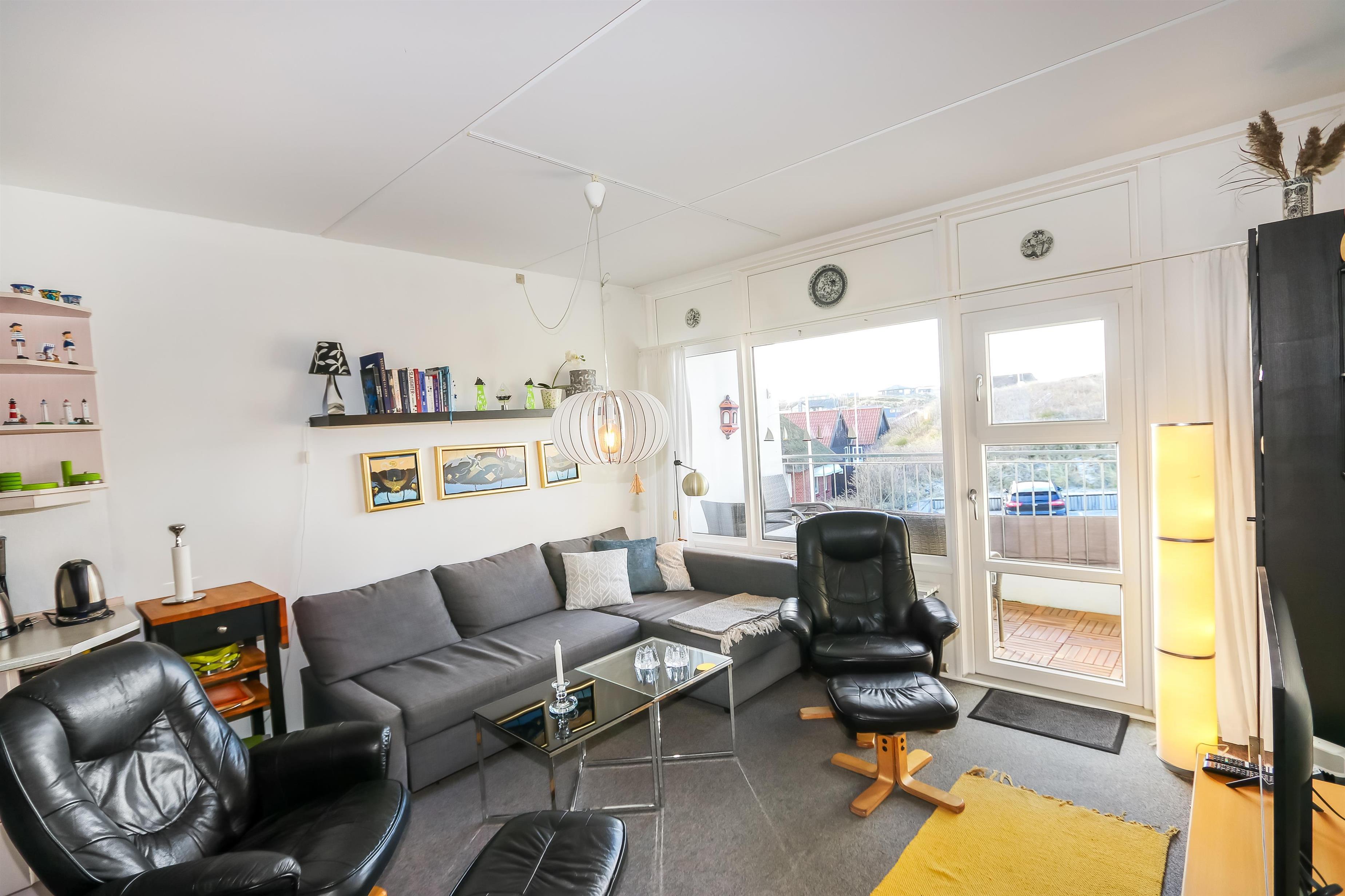 Pæn ferielejlighed beliggende på 1. sal med plads til 4 personer. Kombineret stue og køkken. Stuen er indrettet med læder og polstermøbler, kabel-TV, DVD samt sovesofa med plads til 2 personer, gulvtæppe. Køkkenet er indrettet med el-keramisk kogeplade, miniovn, emhætte, køleskab med 10 l frostboks, opvaskemaskine og linoleumsgulv. Badeværelse med toilet, håndvask og bruser. 1 soverum: 2S og gulvtæppe. Fra stuen er der udgang til overdækket balkon med havemøbler. Trappen til 1. sal består af 14 trappetrin.