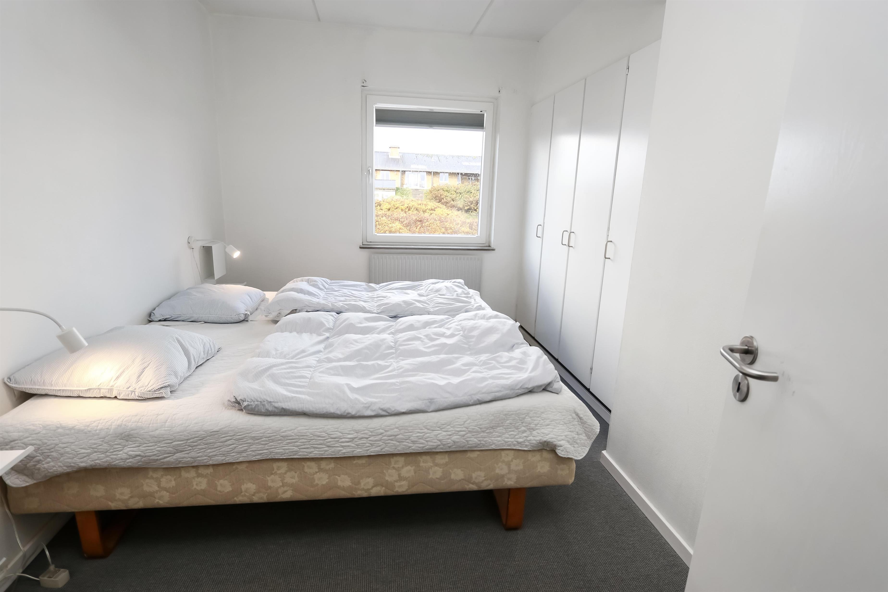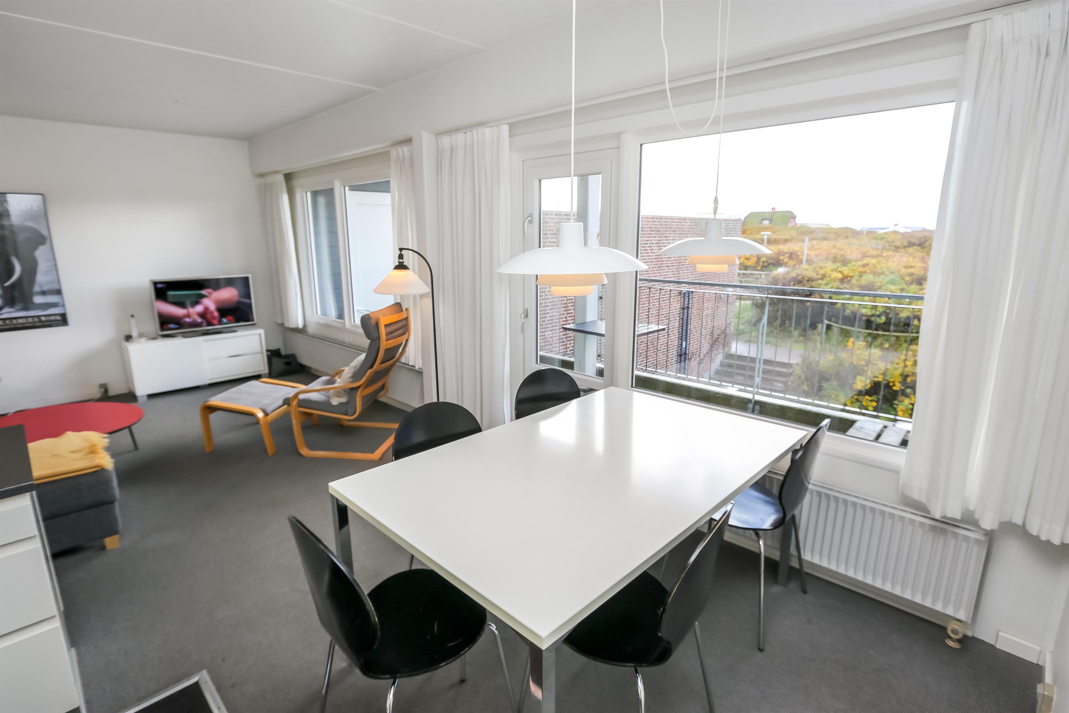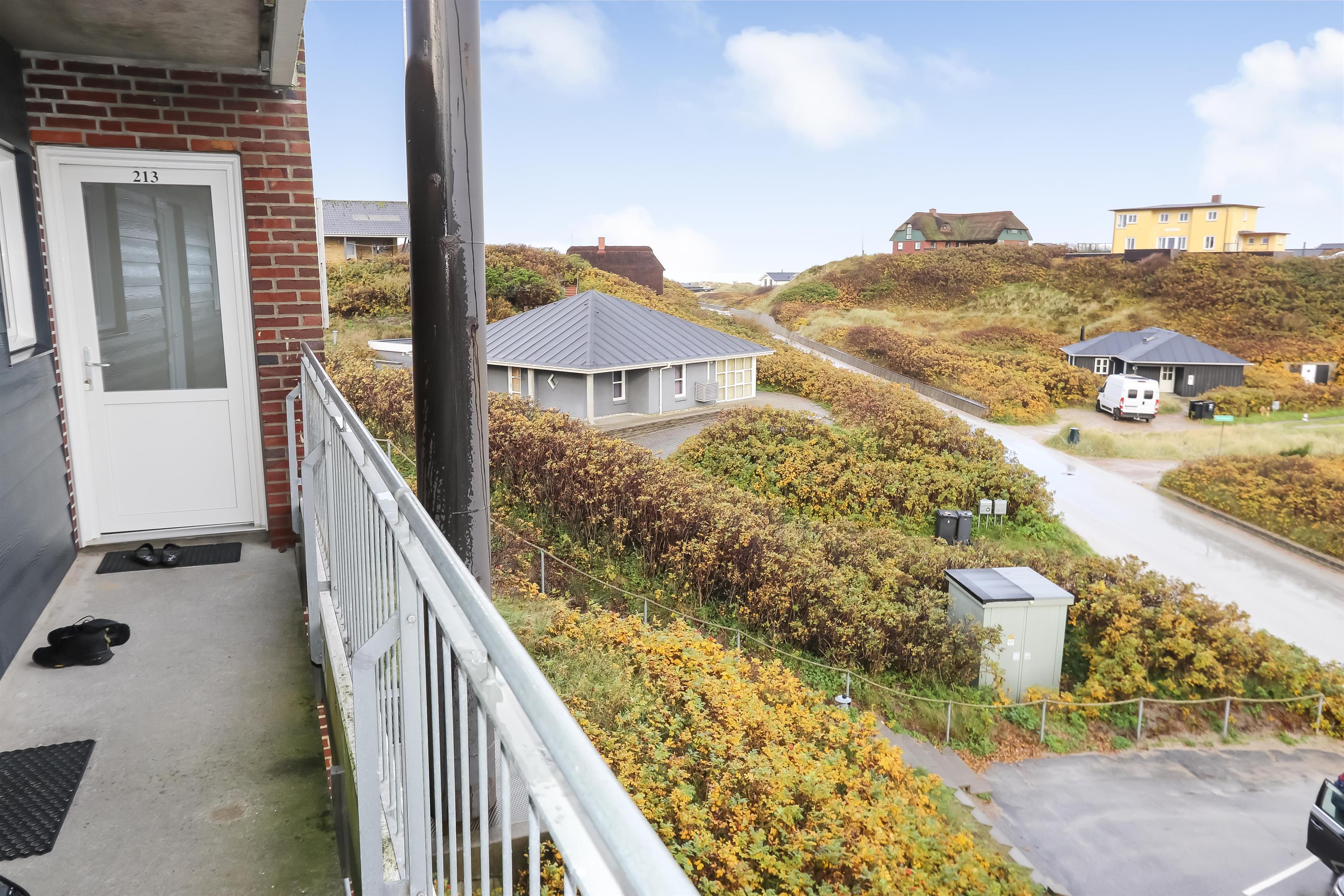 Dejlig hjørne lejlighed med god beliggenhed på 1. sal med balkon og havemøbler. Fra stuen og balkonen kan man se havet mellem klitterne. Kombineret stue og køkken. Køkkenet er indrettet med glaskeramisk komfur, emhætte, køleskab med lille frostbox, opvaskemaskine, mikroovn og linoleumsgulv. Pæn indrettet stue med kabel-TV, DVD, polstermøbler og gulvtæppe. Sofaen i stuen kan slåes ud så der blir 2 sovepladser. 2 soverum: 1S og 1 3/4 seng med en overkøje, 1DS der er gulvtæpper i begge værelser. Badeværelse med toilet, håndvask og bruser. Trappen til 1. sal består af 40 trappetrin.
