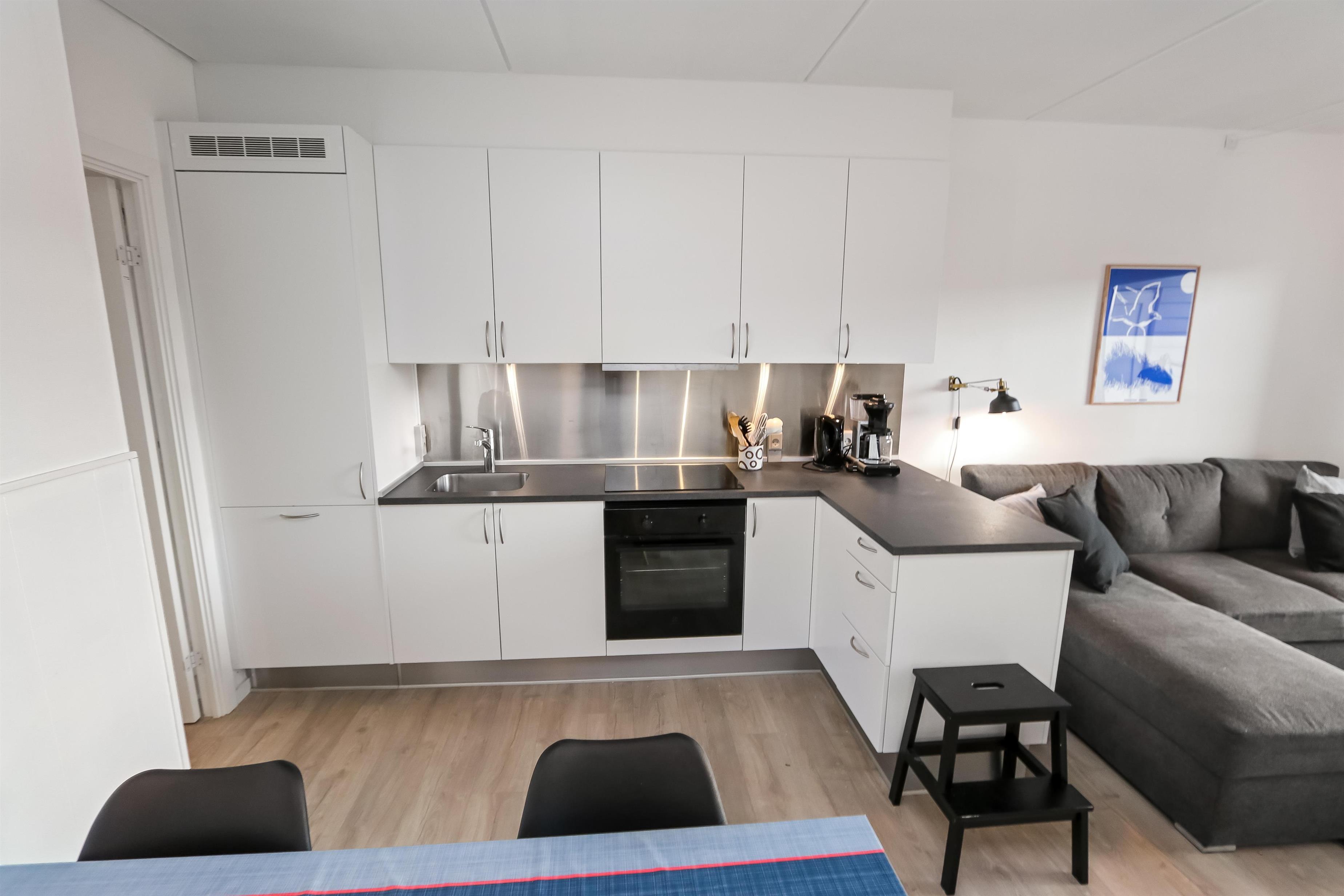 Meget pæn og hyggelig indrettet ferielejlighed til 4 personer, beliggende på 1. sal. Kombineret stue og køkken. Stuen er indrettet med læder og polstermøbler, kabel-TV, sovesofa med plads til 2 personer, laminatgulv. Køkkenet er indrettet med glaskeramisk komfur, køleskab med 10 l frostboks, opvaskemaskine, emhætte og laminatgulv. Badeværelse med toilet, håndvask og bruser. 1 soverum: 1DS og 1S og laminatgulv. Fra stuen er der udgang til overdækket balkon med havemøbler. Trappen til 1. sal består af 24 trappetrin.