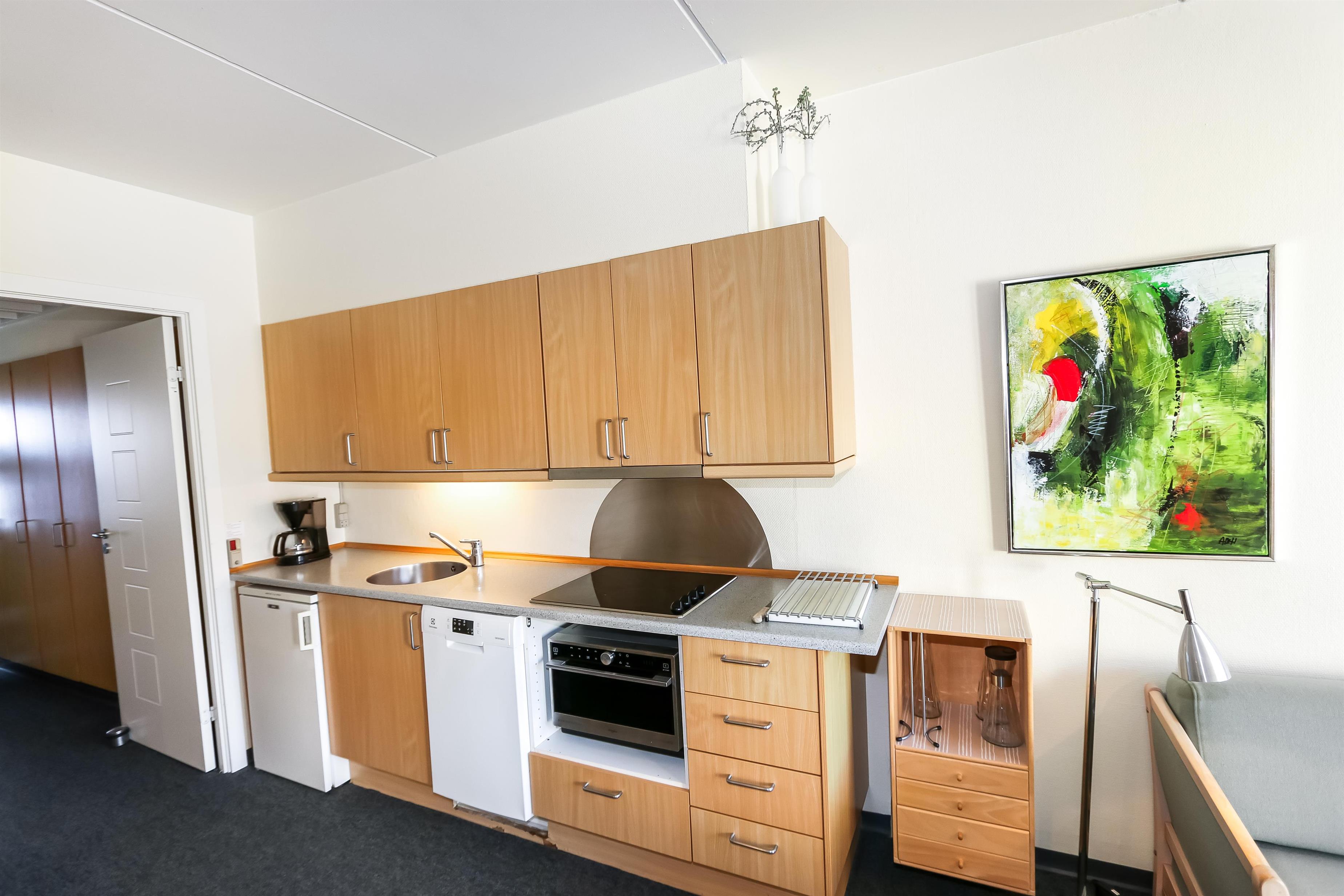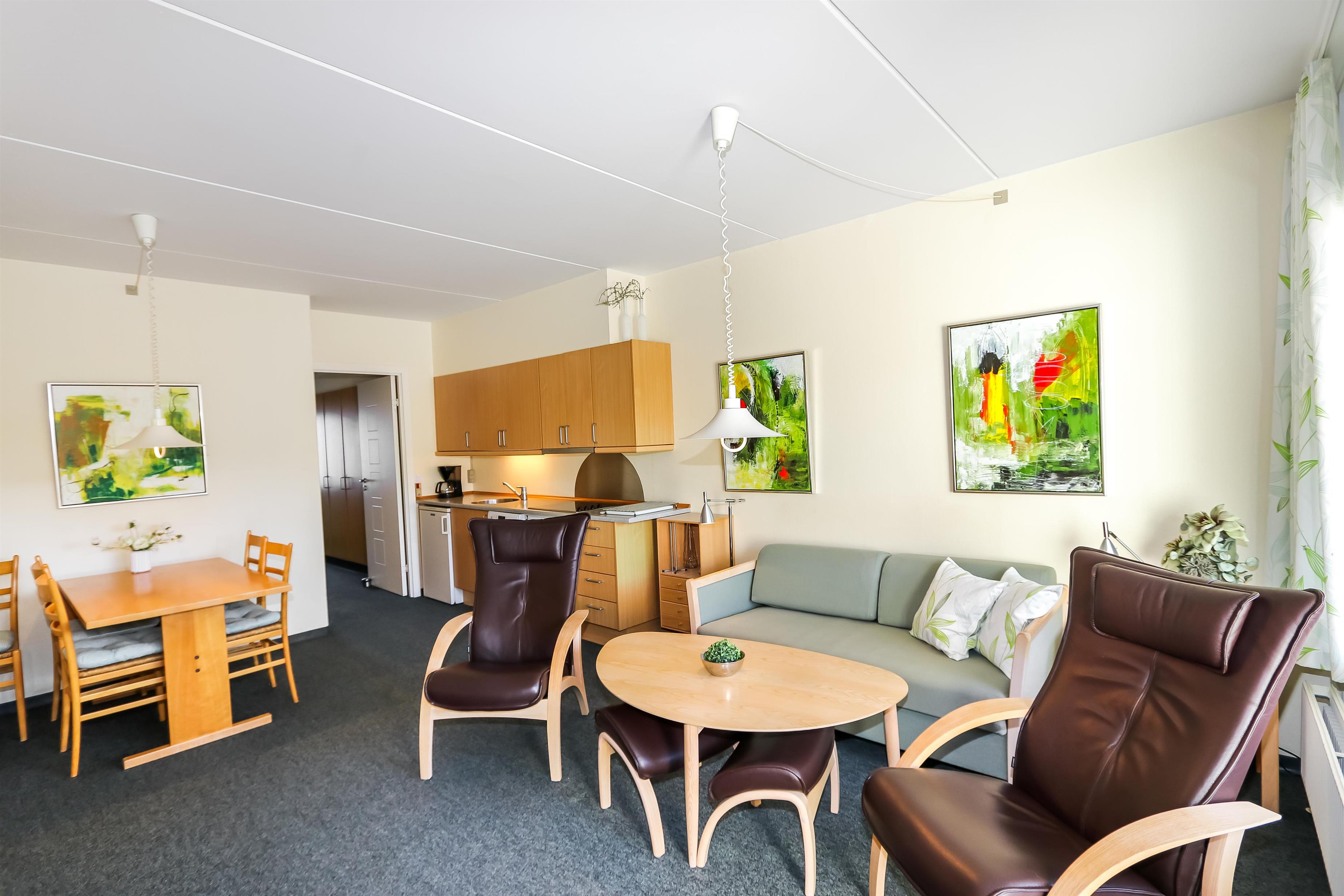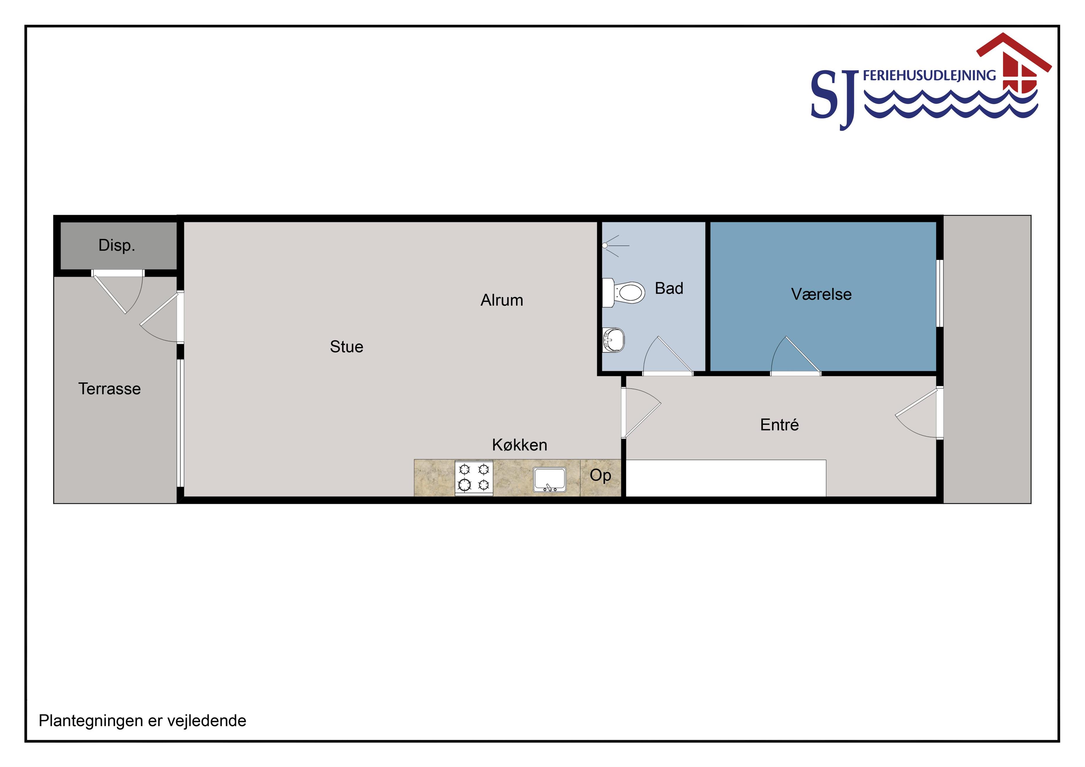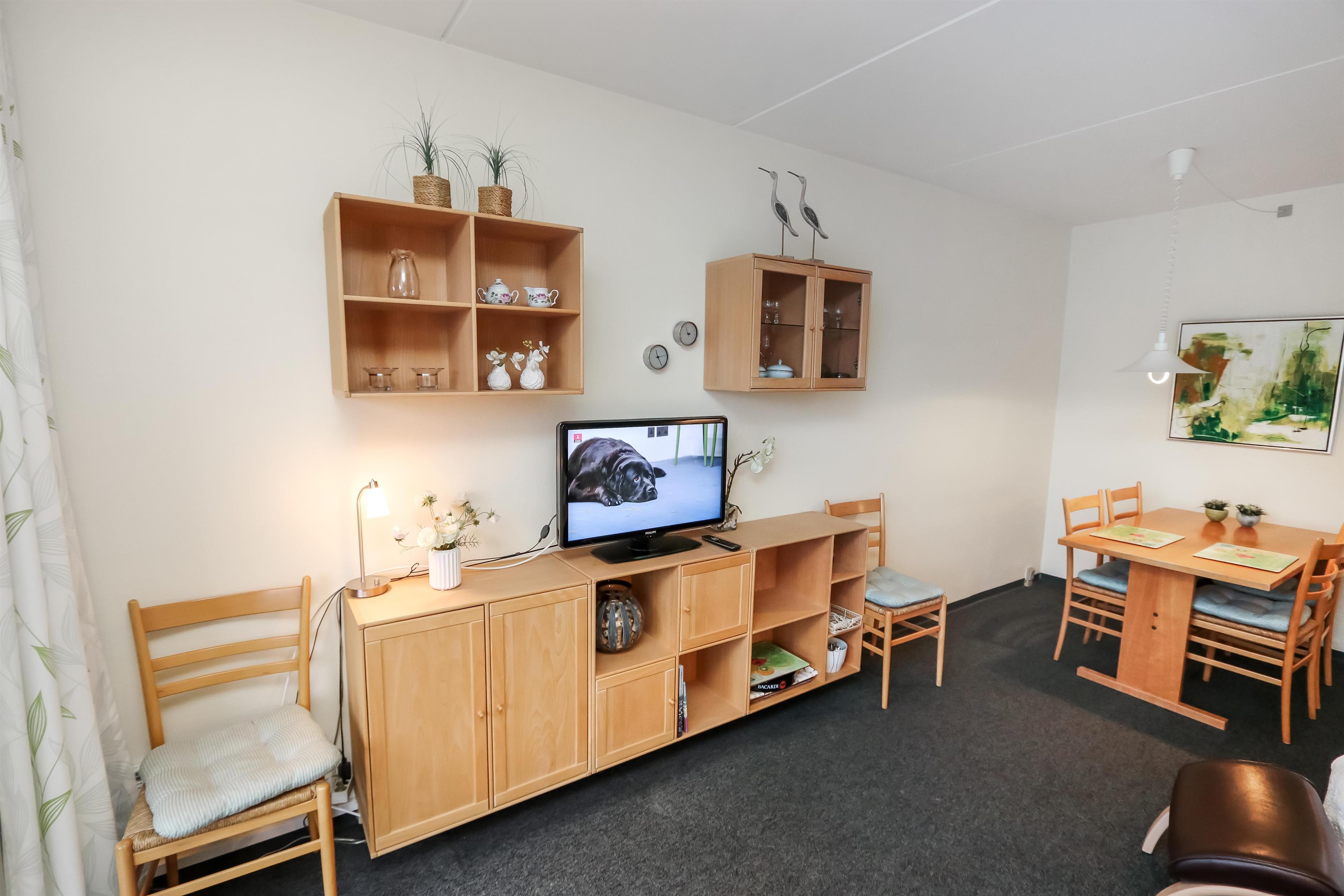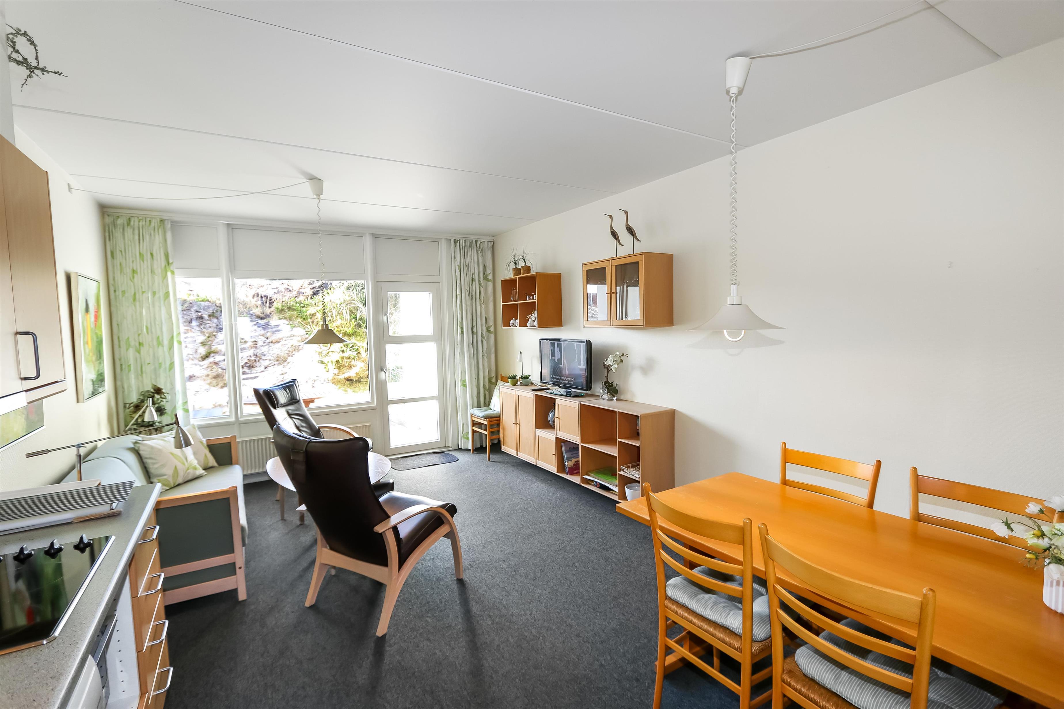 Ferielejlighed i stueplan med plads til 4 personer. Kombineret stue og køkkenafdeling. Stuen er indrettet med polster og lædermøbler og gulvtæppe, kabel-TV, DVD. Køkkenet er med el-keramisk kogeplade og miniovn, køleskab med 10 l frostboks. Badeværelse med toilet, håndvask og bruser. 1 soverum: 1DS + 1 køjeseng og gulvtæppe. Fra stuen er der udgang til lille delvis overdækket terrasse med havemøbler. Ikke-ryger lejlighed.