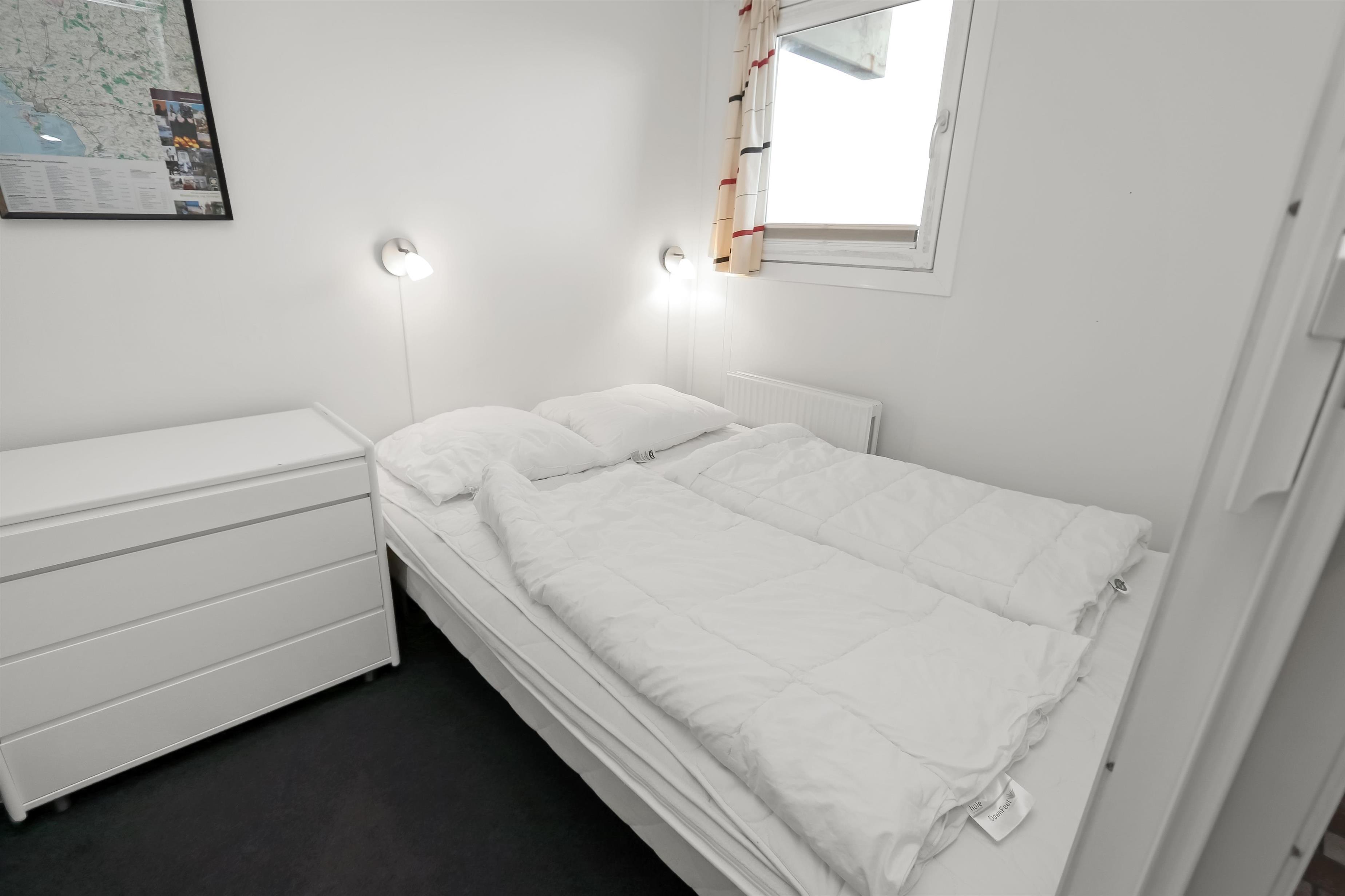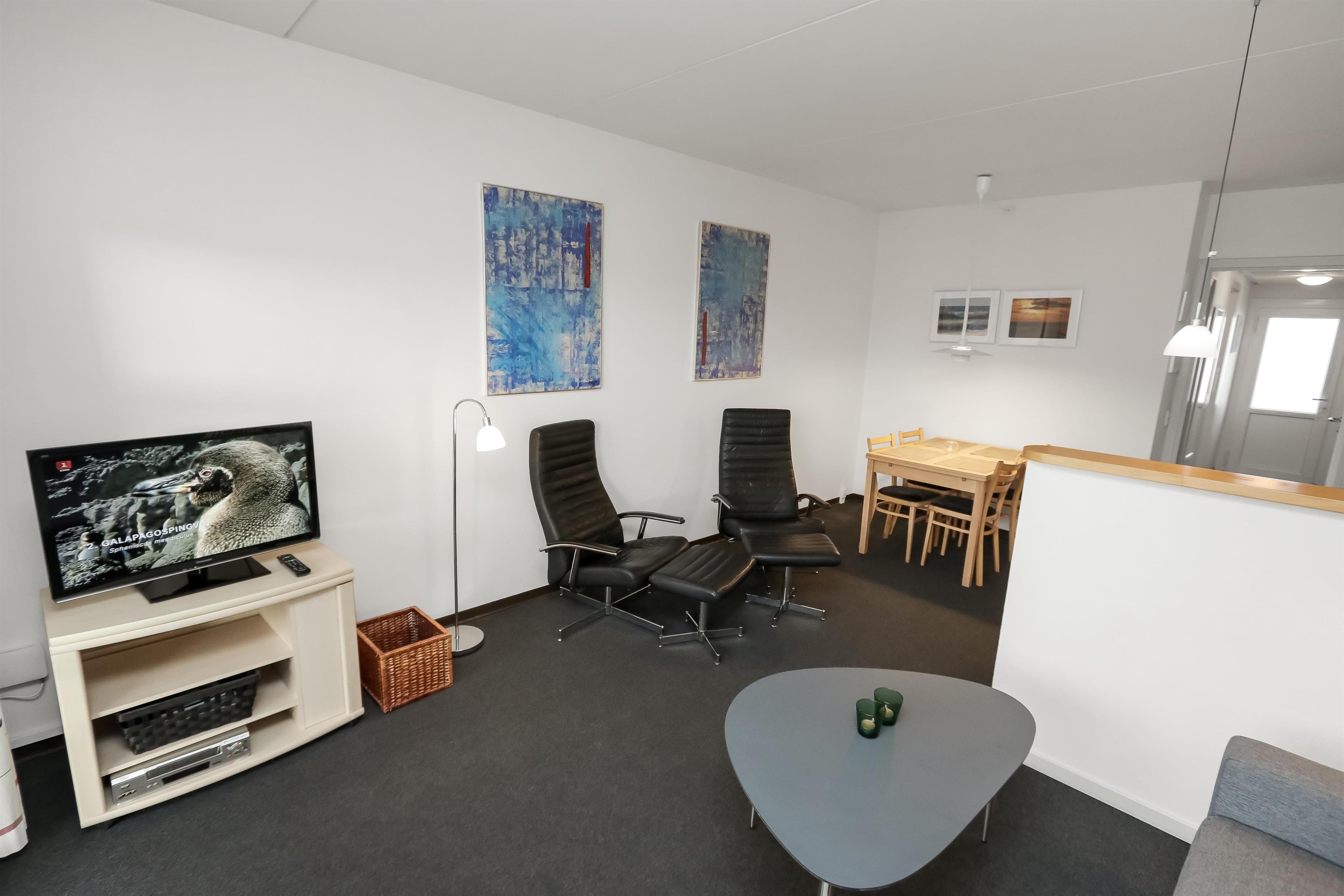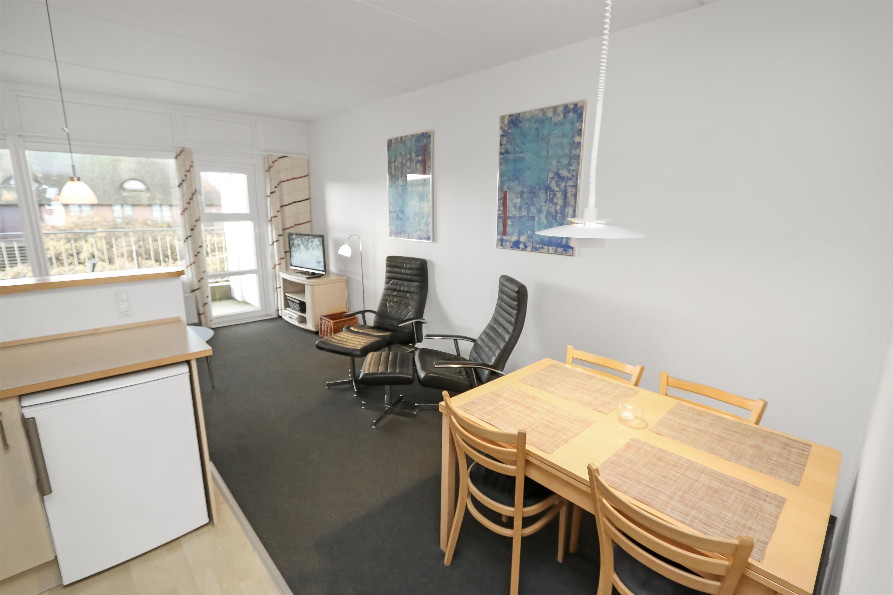 Enkel indrettet ferielejlighed beliggende på 1. sal med balkon med havemøbler. 1 soverum: 1DS + 1S og gulvtæppe. Kombineret køkken og stue. Køkkenet er indrettet med glaskeramisk komfur, emhætte, køleskab med lille frostbox, opvaskemaskine, mikroovn og linoleumsgulv. Badeværelse med toilet, håndvask og bruser. Stue med kabel-TV, læder og polstermøbler og gulvtæppe. Sofaen i stuen kan slåes ud så der kan blive 2 sovepladser. Trappen til 1. sal består af 21 trappetrin.