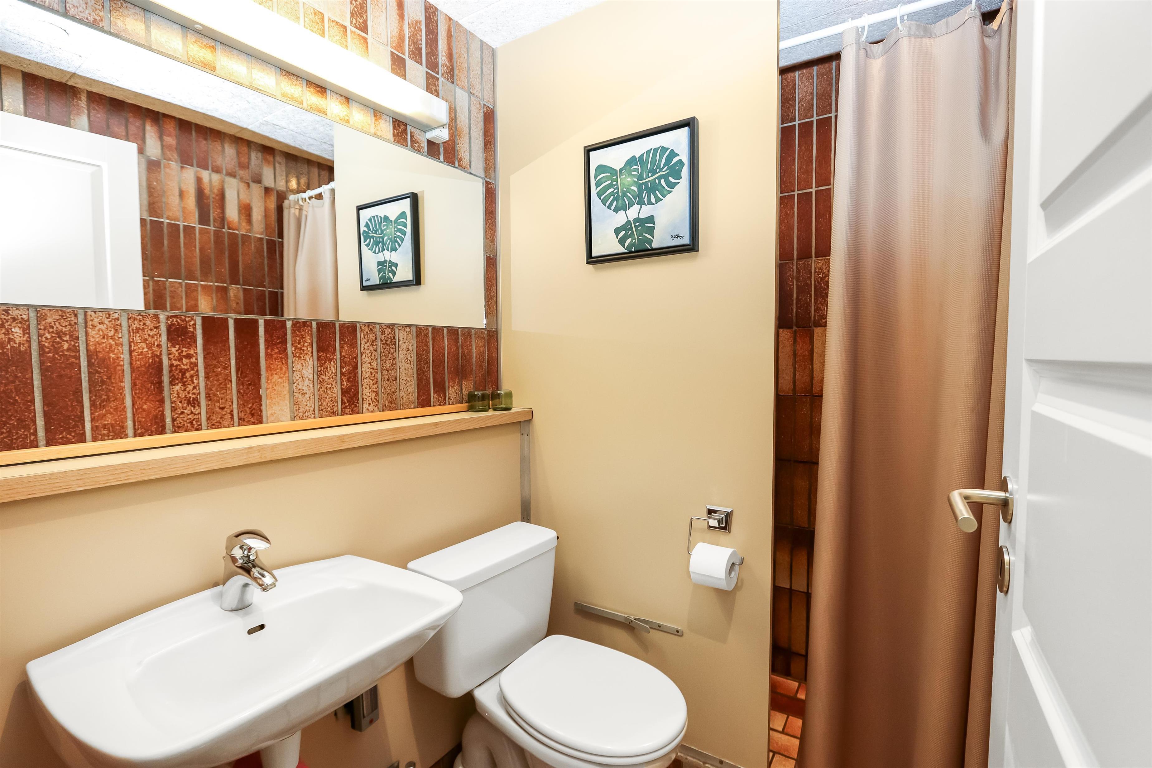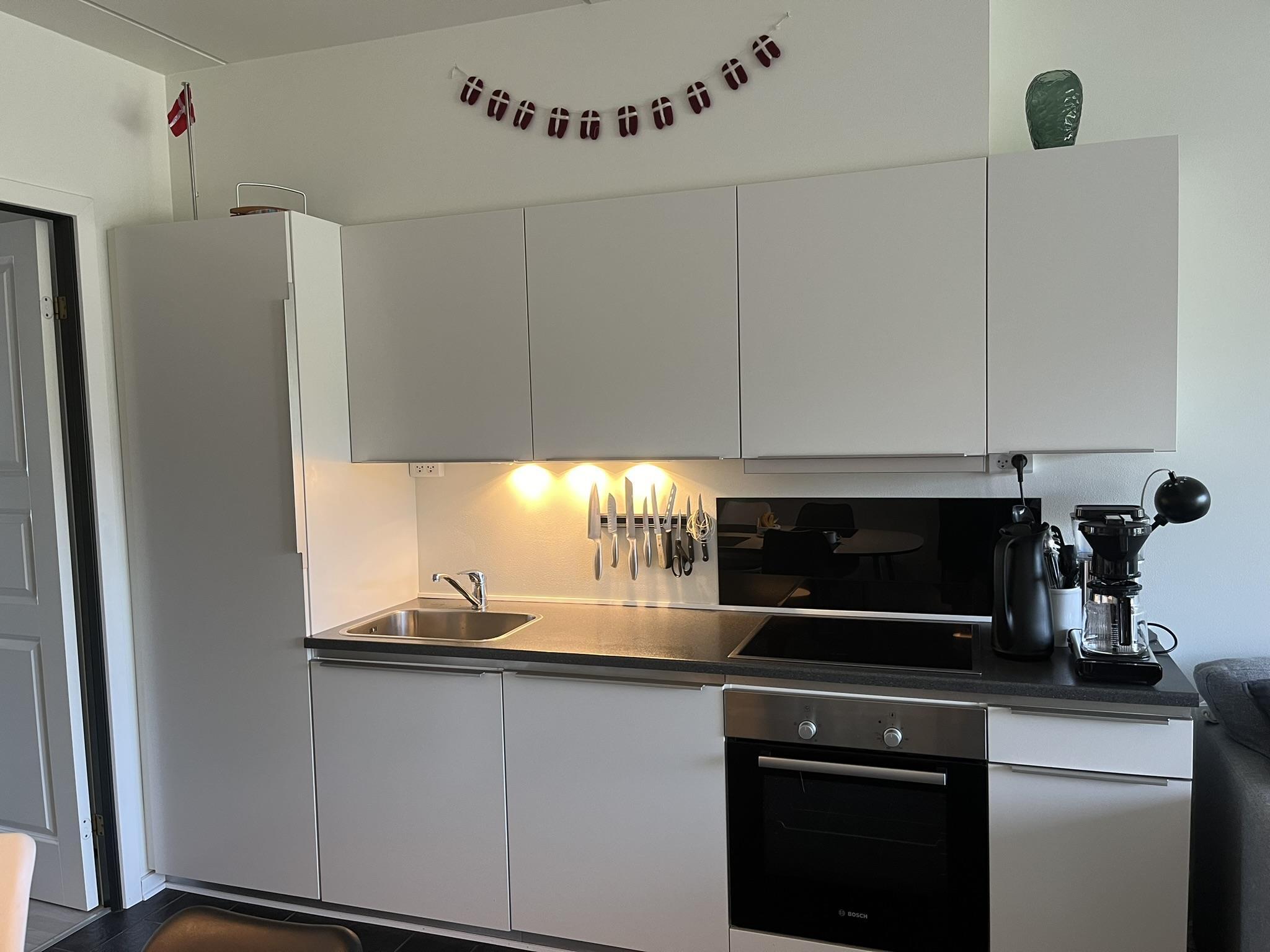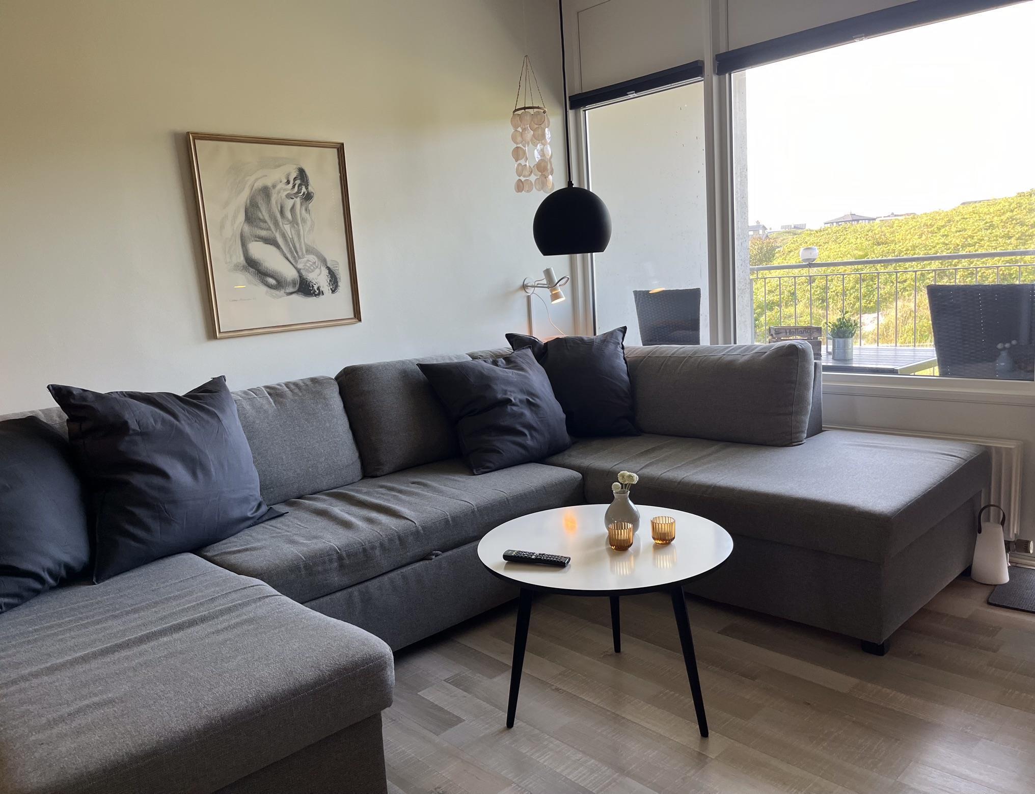 Pæn og hyggelig indrettet ferielejlighed til 4 personer beliggende på 1. sal. Kombineret stue og køkken. Stuen er indrettet med polstermøbler, kabel-TV, linoleumsgulv, sovesofa med plads til 2 personer. Køkkenet er indrettet med induktionskomfur, køleskab med lille frostboks, emhætte, opvaskemaskine og klinkegulv. Badeværelse med toilet, håndvask og bruser. 1 soverum: 1DS + 1S. Fra stuen er der udgang til overdækket balkon med havemøbler. Trappen til 1. sal består af 14 trappetrin.