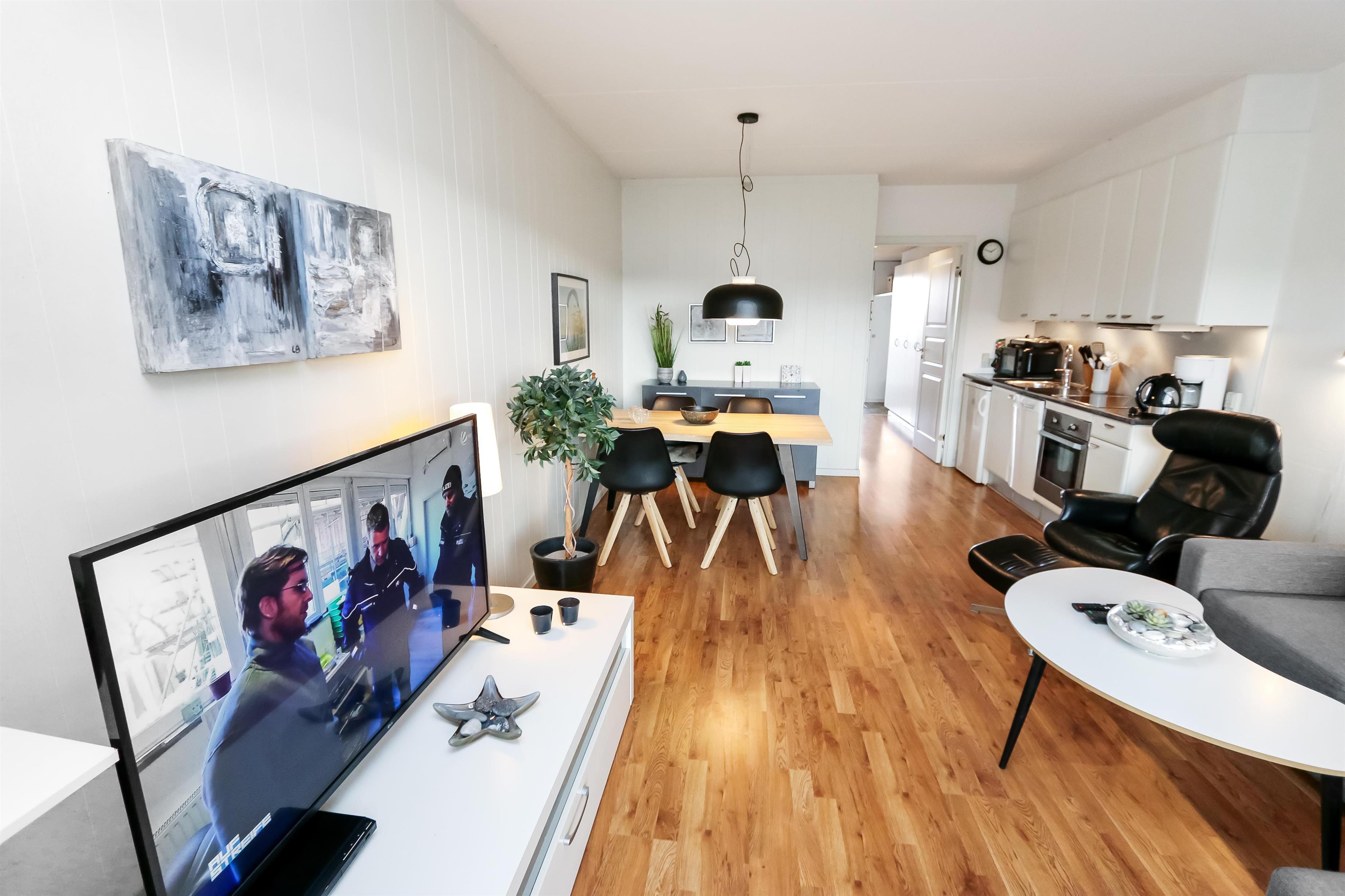 Meget pæn og moderne indrettet ferielejlighed beliggende på 1. sal. Kombineret stue og køkken. Stuen er indrettet med læder og polstermøbler, Kabel-TV, DVD og pergogulv. Køkkenet er med glaskeramisk komfur, køleskab med 10 l frostboks, mikroovn, opvaskemaskine, emhætte og pergogulv. 1 soverum: 1DS og pergogulv. Badeværelse med toilet, håndvask og bruser. Fra stuen er der udgang til overdækket balkon med havemøbler. Trappen til 1. sal består af 24 trappetrin.